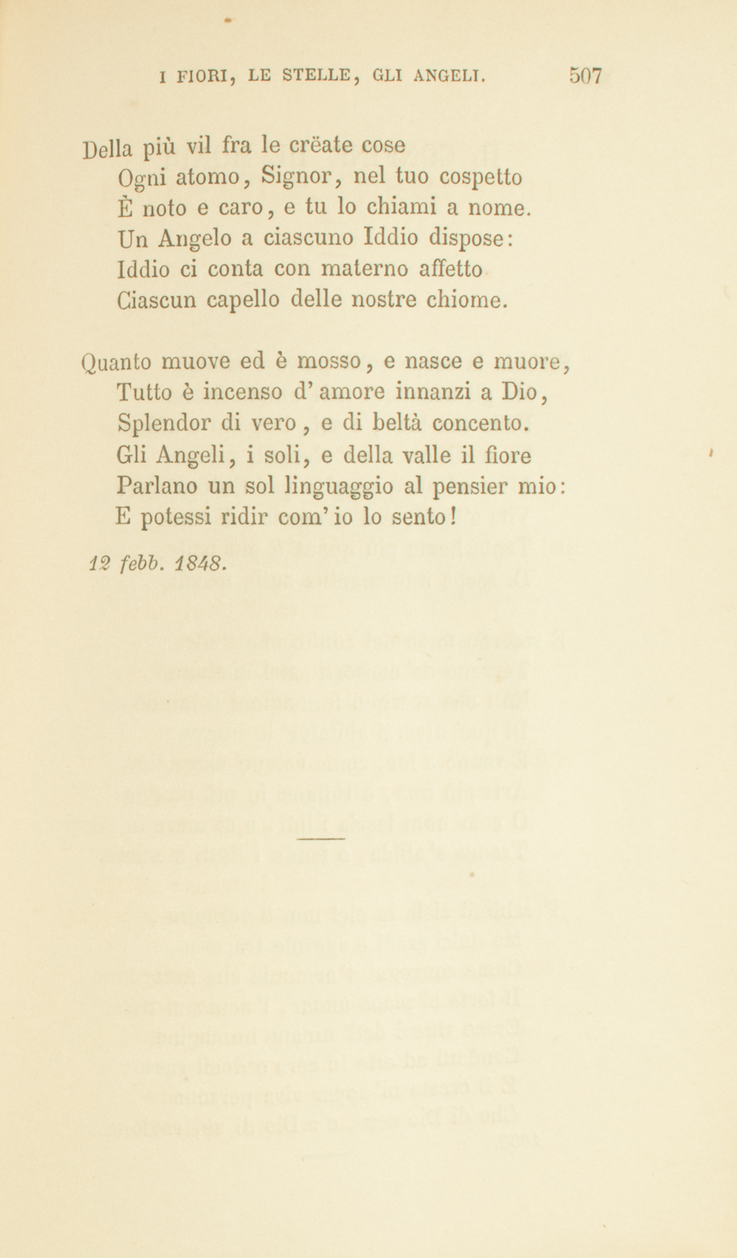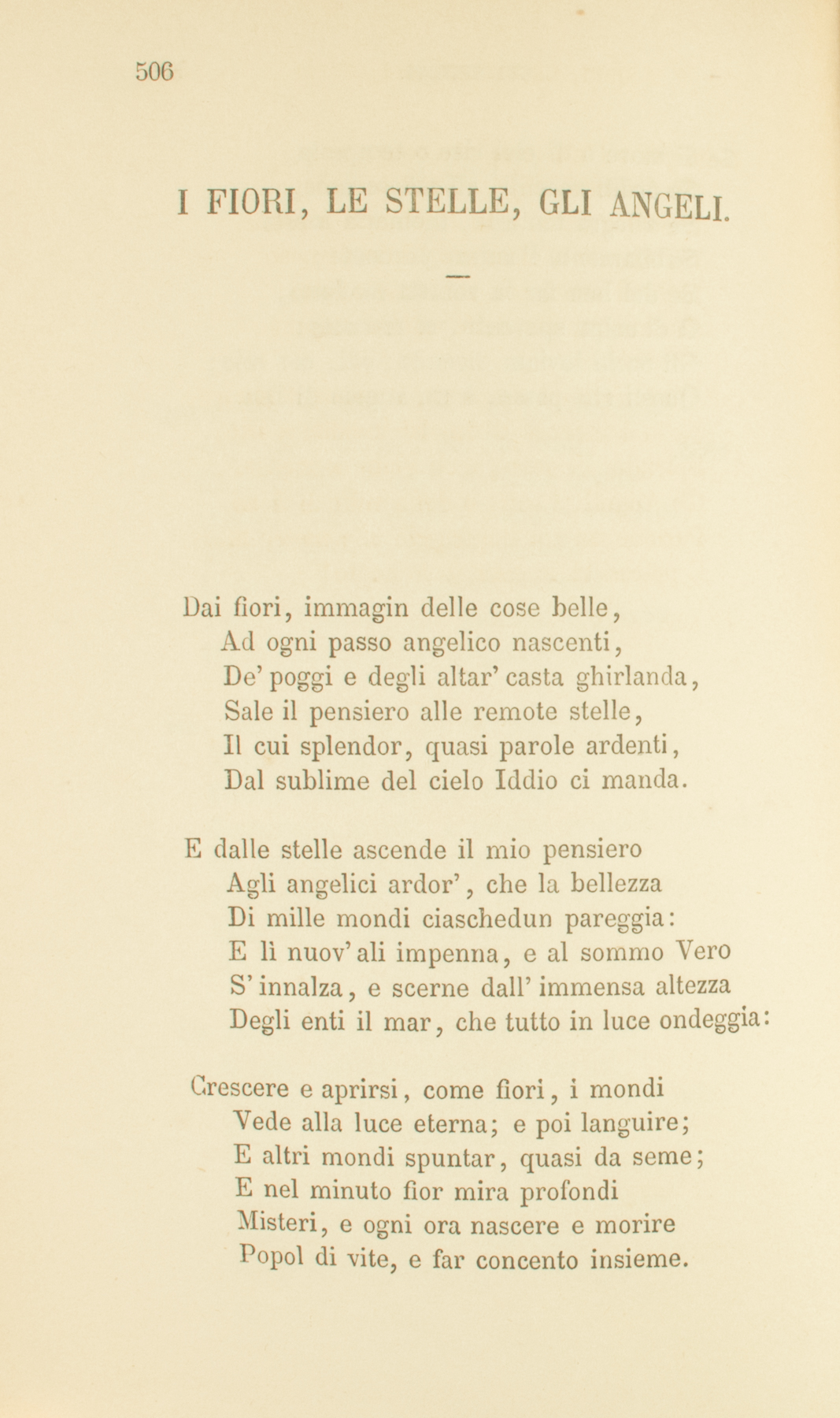 Dai fiori, immagin delle cose belle,Ad ogni passo angelico nascenti,De’ poggi e degli altar’ casta ghirlanda,Sale il pensiero alle remote stelle,Il cui splendor, quasi parole ardenti,Dal sublime del cielo Iddio ci manda.E dalle stelle ascende il mio pensieroAgli angelici ardor’, che la bellezzaDi mille mondi ciaschedun pareggia:E lì nuov’ali impenna, e al sommo VeroS’innalza, e scerne dall’immensa altezzaDegli enti il mar, che tutto in luce ondeggia:Crescere e aprirsi, come fiori, i mondiVede alla luce eterna; e poi languire;E altri mondi spuntar, quasi da seme;E nel minuto fior mira profondiMisteri, e ogni ora nascere e morirePopol di vite, e far concento insieme.Della più vil fra le crëate coseOgni atomo, Signor, nel tuo cospettoÈ noto e caro, e tu lo chiami a nome.Un Angelo a ciascuno Iddio dispose:Iddio ci conta con materno affettoCiascun capello delle nostre chiome.Quanto muove ed è mosso, e nasce e muore,Tutto è incenso d’amore innanzi a Dio,Splendor di vero, e di beltà concento.Gli Angeli, i soli, e della valle il fioreParlano un sol linguaggio al pensier mio:E potessi ridir com’io lo sento!12 febb. 1848.