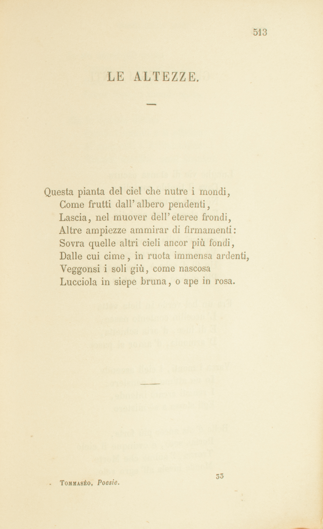 Questa pianta del ciel che nutre i mondi,Come frutti dall’albero pendenti,Lascia, nel muover dell’eteree frondi,Altre ampiezze ammirar di firmamenti:Sovra quelle altri cieli ancor più fondi,Dalle cui cime, in ruota immensa ardenti,Veggonsi i soli giù, come nascosaLucciola in siepe bruna, o ape in rosa.