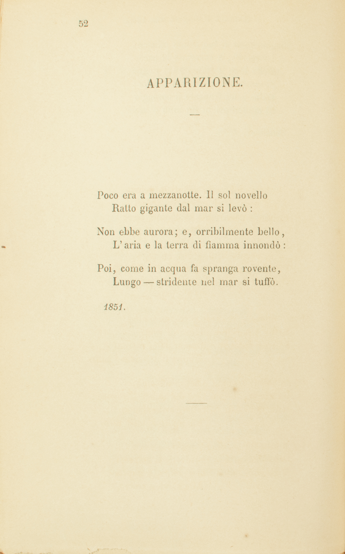 Poco era a mezzanotte. Il sol novelloRatto gigante dal mar si levò:Non ebbe aurora; e, orribilmente bello,L’aria e la terra di fiamma innondò:Poi, come in acqua fa spranga rovente,Lungo — stridente nel mar si tuffò.1851.