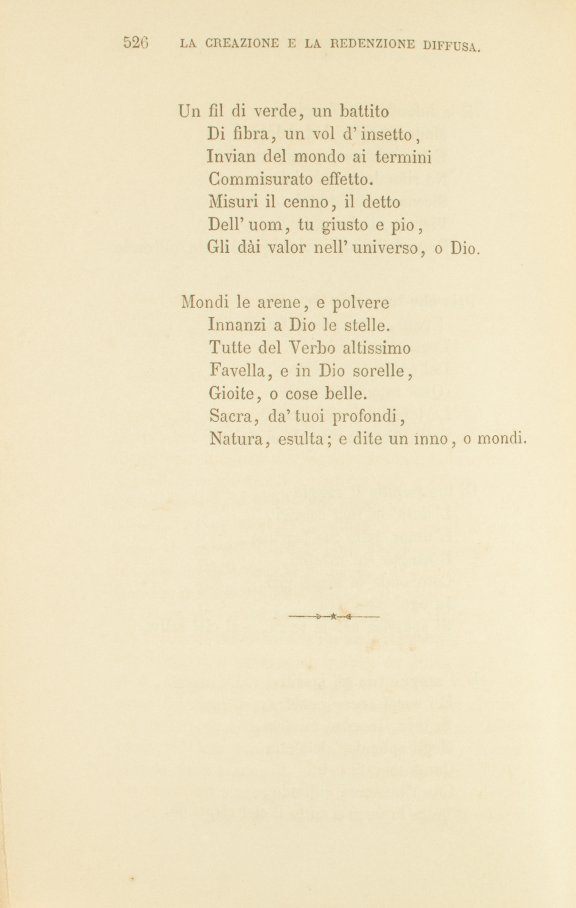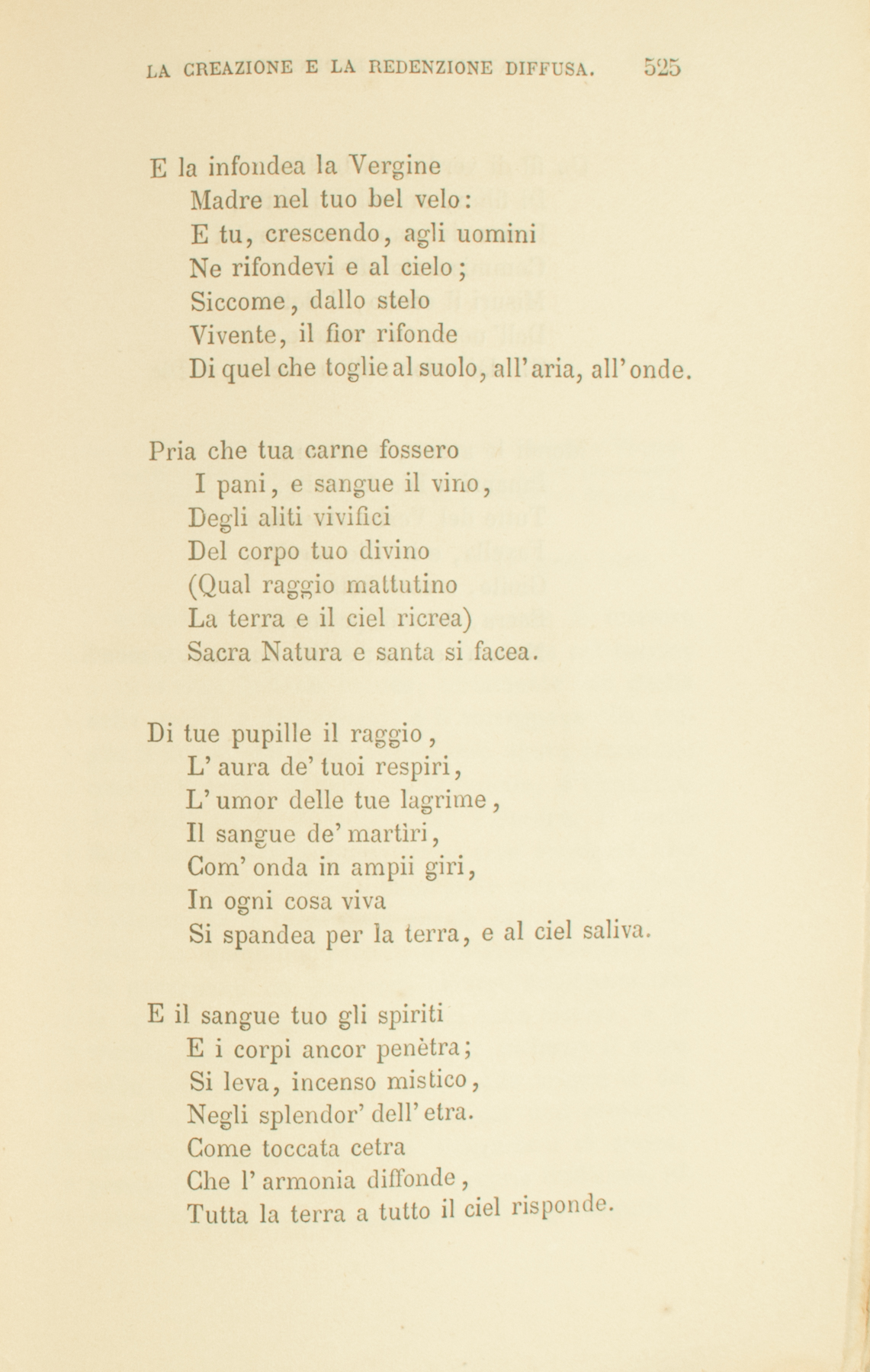 Quanti, o Gesù, più tenuiNutriva e più possentiAtomi il mondo, accorseroDagli astri ubbidïenti,E fecersi elementiDelle tue membra sante,Di nostra umanità divino amante.Quanta da lunghi secoliVita d’amor fioria,Come stillato spiritoNel grembo di MariaS’accolse in armoniaDi movimenti e rai,Quale in terra non fu nè sarà mai;E la infondea la VergineMadre nel tuo bel velo:E tu, crescendo, agli uominiNe rifondevi e al cielo;Siccome, dallo steloVivente, il fior rifondeDi quel che toglie al suolo, all’aria, all’onde.Pria che tua carne fosseroI pani, e sangue il vino,Degli aliti vivificiDel corpo tuo divino(Qual raggio mattutinoLa terra e il ciel ricrea)Sacra Natura e santa si facea.Di tue pupille il raggio,L’aura de’ tuoi respiri,L’umor delle tue lagrime,Il sangue de’ martìri,Com’onda in ampii giri,In ogni cosa vivaSi spandea per la terra, e al ciel saliva.E il sangue tuo gli spiritiE i corpi ancor penètra;Si leva, incenso mistico,Negli splendor’ dell’etra.Come toccata cetraChe l’armonia diffonde,Tutta la terra a tutto il ciel risponde.Un fil di verde, un battitoDi fibra, un vol d’insetto,Invian del mondo ai terminiCommisurato effetto.Misuri il cenno, il dettoDell’uom, tu giusto e pio,Gli dài valor nell’universo, o Dio.Mondi le arene, e polvereInnanzi a Dio le stelle.Tutte del Verbo altissimoFavella, e in Dio sorelle,Gioite, o cose belle.Sacra, da’ tuoi profondi,Natura, esulta; e dite un inno, o mondi.