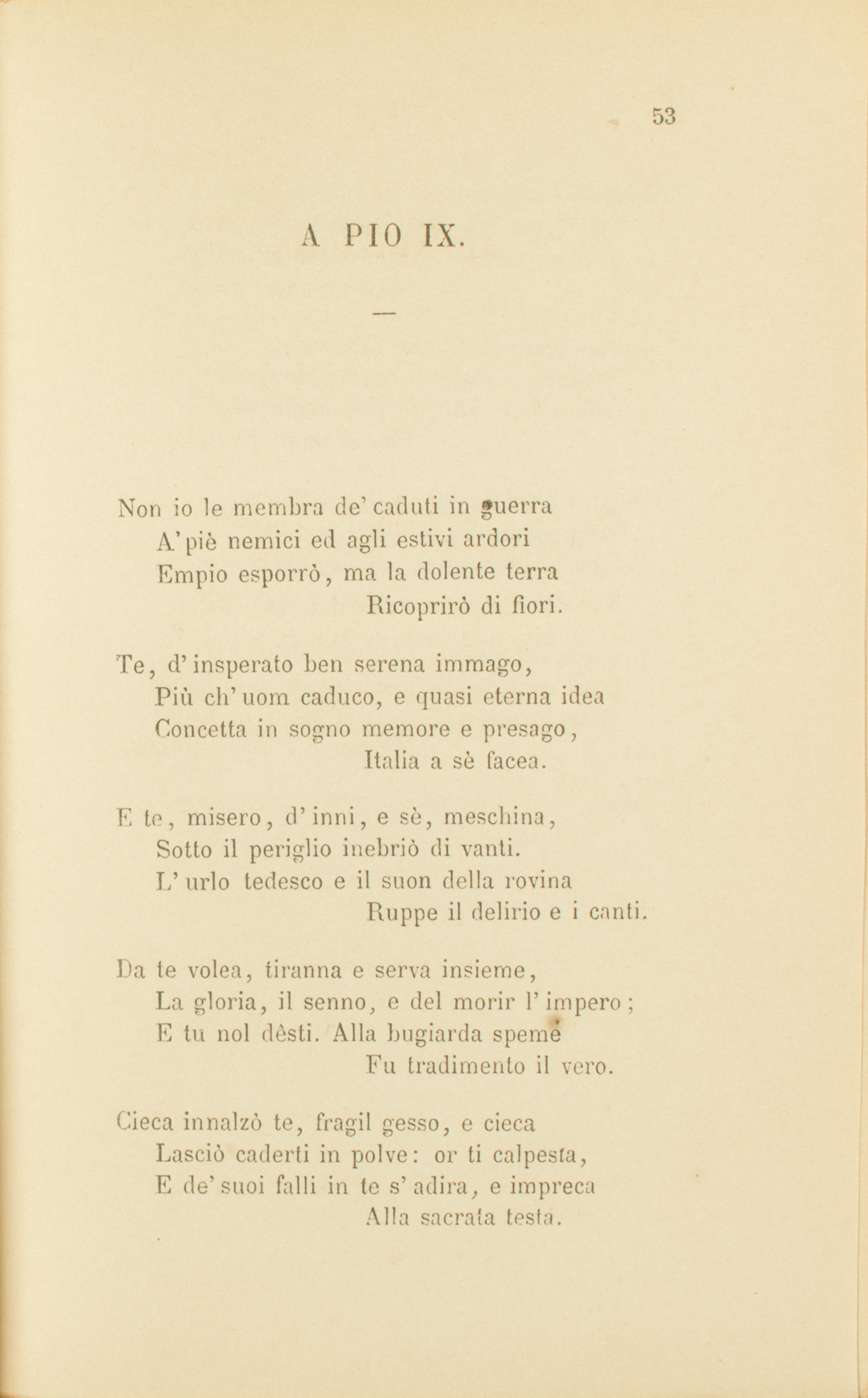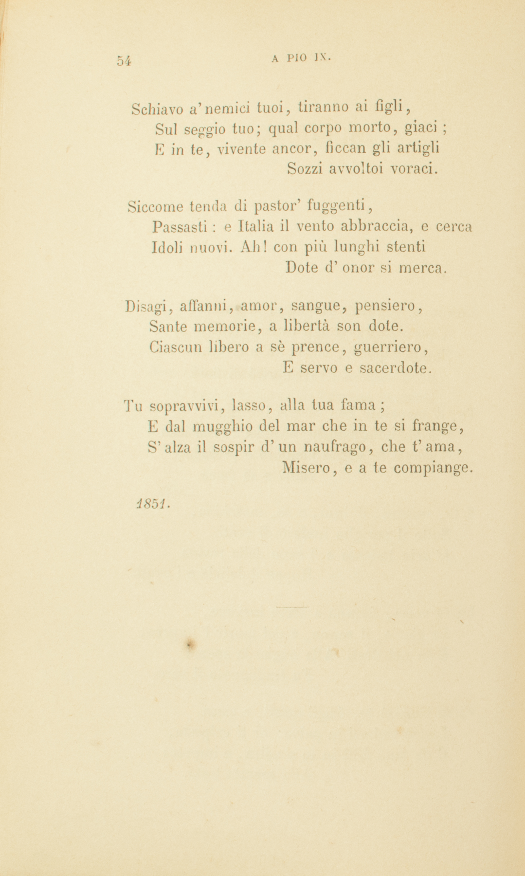 Non io le membra de’ caduti in guerraA’ piè nemici ed agli estivi ardoriEmpio esporrò, ma la dolente terraRicoprirò di fiori.Te, d’insperato ben serena immago,Più ch’uom caduco, e quasi eterna ideaConcetta in sogno memore e presago,Italia a sè facea.E te, misero, d’inni, e sè, meschina,Sotto il periglio inebriò di vanti.L’urlo tedesco e il suon della rovinaRuppe il delirio e i canti.Da te volea, tiranna e serva insieme,La gloria, il senno, e del morir l’impero;E tu nol dêsti. Alla bugiarda spemeFu tradimento il vero.Cieca innalzò te, fragil gesso, e ciecaLasciò caderti in polve: or ti calpesta,E de’ suoi falli in te s’adira, e imprecaAlla sacrata testa.Schiavo a’ nemici tuoi, tiranno ai figli,Sul seggio tuo; qual corpo morto, giaci;E in te, vivente ancor, ficcan gli artigliSozzi avvoltoi voraci.Siccome tenda di pastor’ fuggenti,Passasti: e Italia il vento abbraccia, e cercaIdoli nuovi. Ah! con più lunghi stentiDote d’onor si merca.Disagi, affanni, amor, sangue, pensiero,Sante memorie, a libertà son dote.Ciascun libero a sè prence, guerriero,E servo e sacerdote.Tu sopravvivi, lasso, alla tua fama;E dal mugghio del mar che in te si frange,S’alza il sospir d’un naufrago, che t’ama,Misero, e a te compiange.1851.