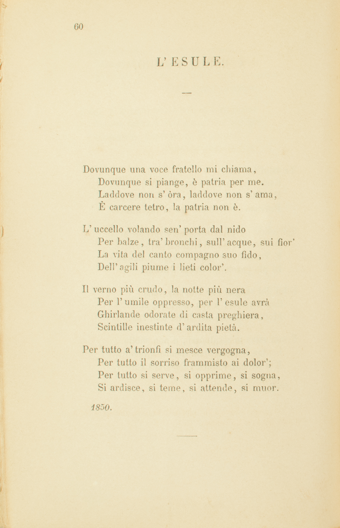 Dovunque una voce fratello mi chiama,Dovunque si piange, è patria per me.Laddove non s’òra, laddove non s’ama,È carcere tetro, la patria non è.L’uccello volando sen’ porta dal nidoPer balze, tra’ bronchi, sull’acque, sui fior’La vita del canto compagno suo fido,Dell’agili piume i lieti color’.Il verno più crudo, la notte più neraPer l’umile oppresso, per l’esule avràGhirlande odorate di casta preghiera,Scintille inestinte d’ardita pietà.Per tutto a’ trionfi si mesce vergogna,Per tutto il sorriso frammisto ai dolor’;Per tutto si serve, si opprime, si sogna,Si ardisce, si teme, si attende, si muor.1850.