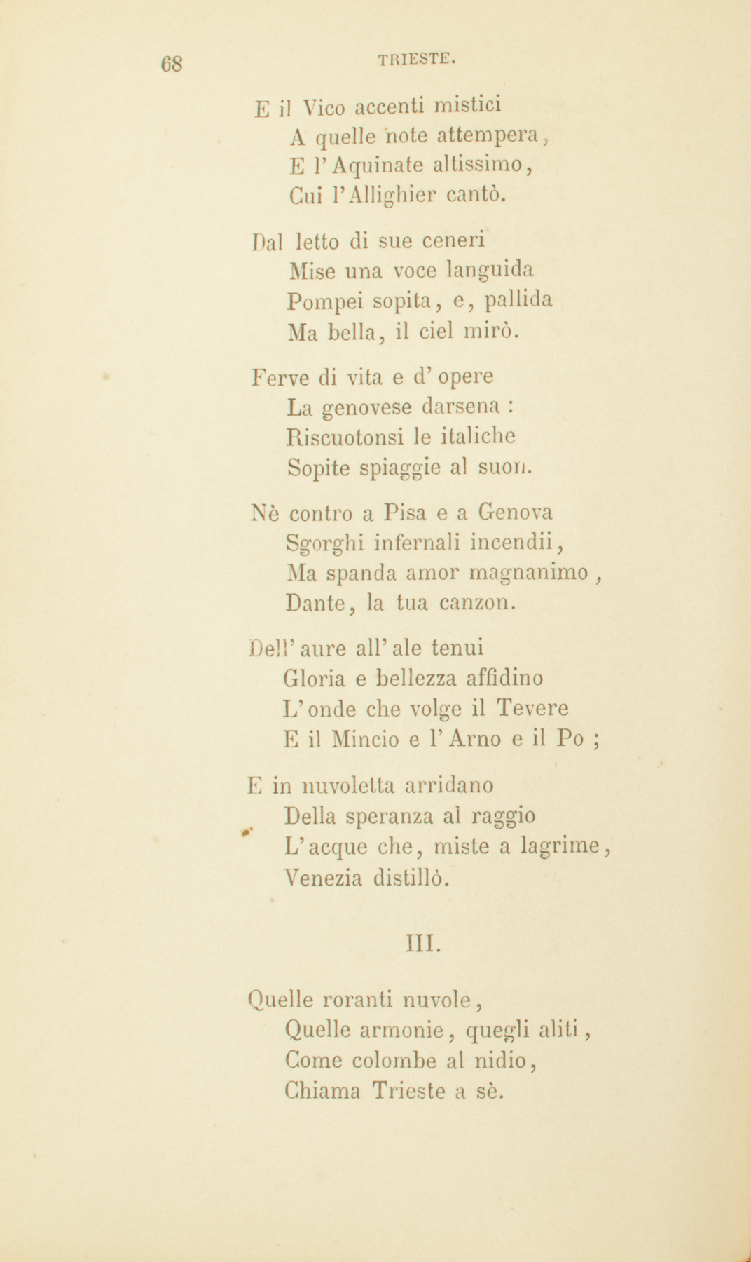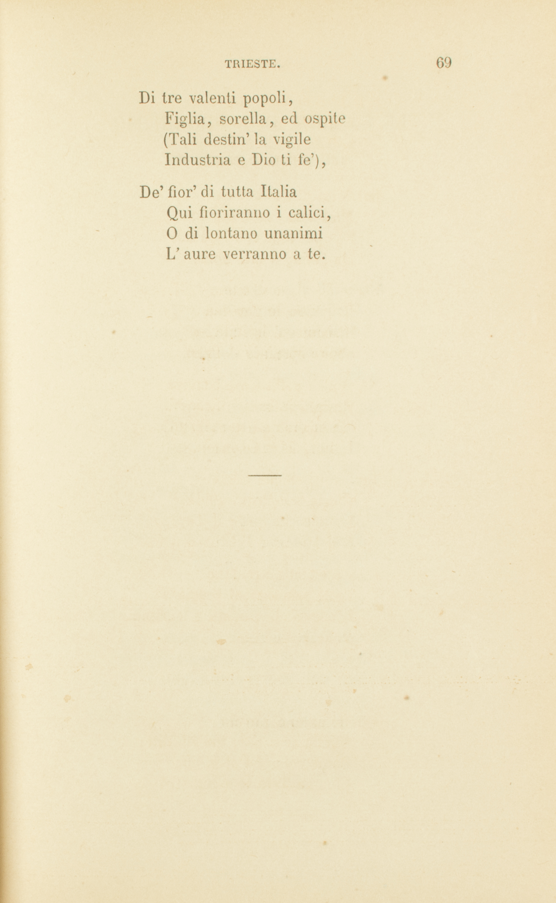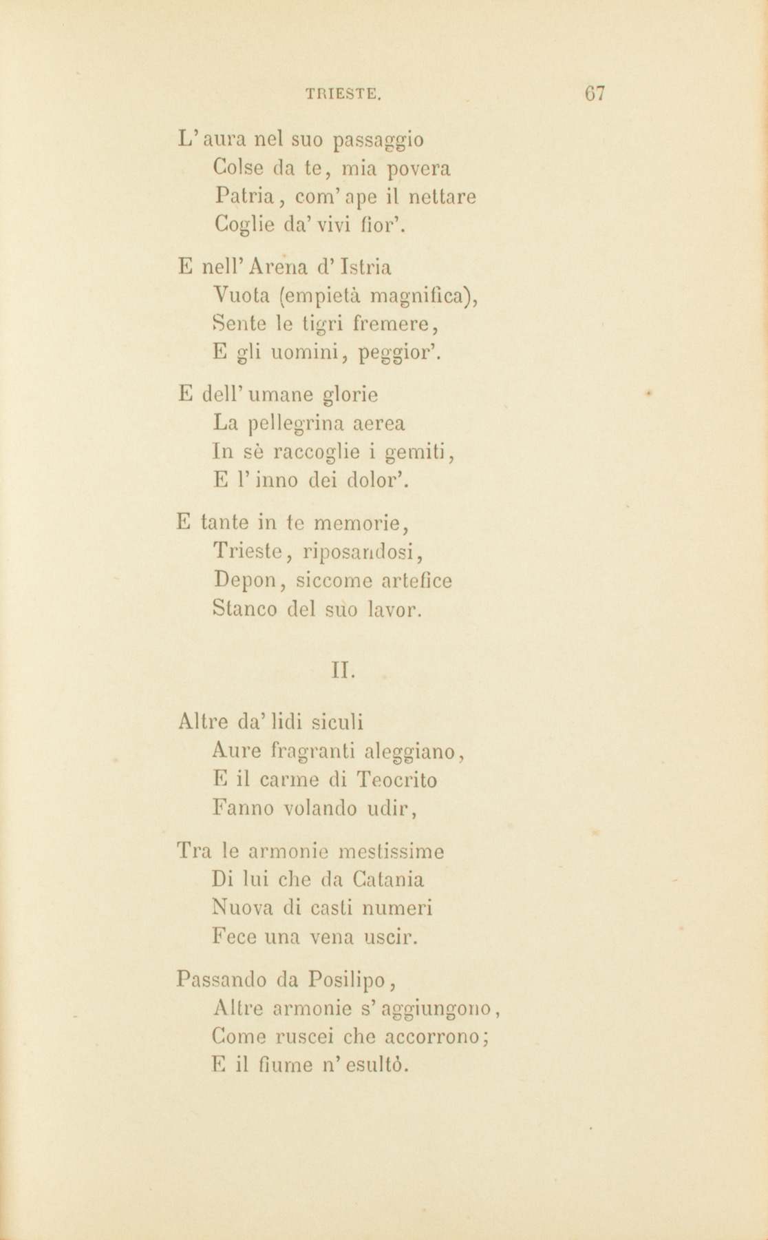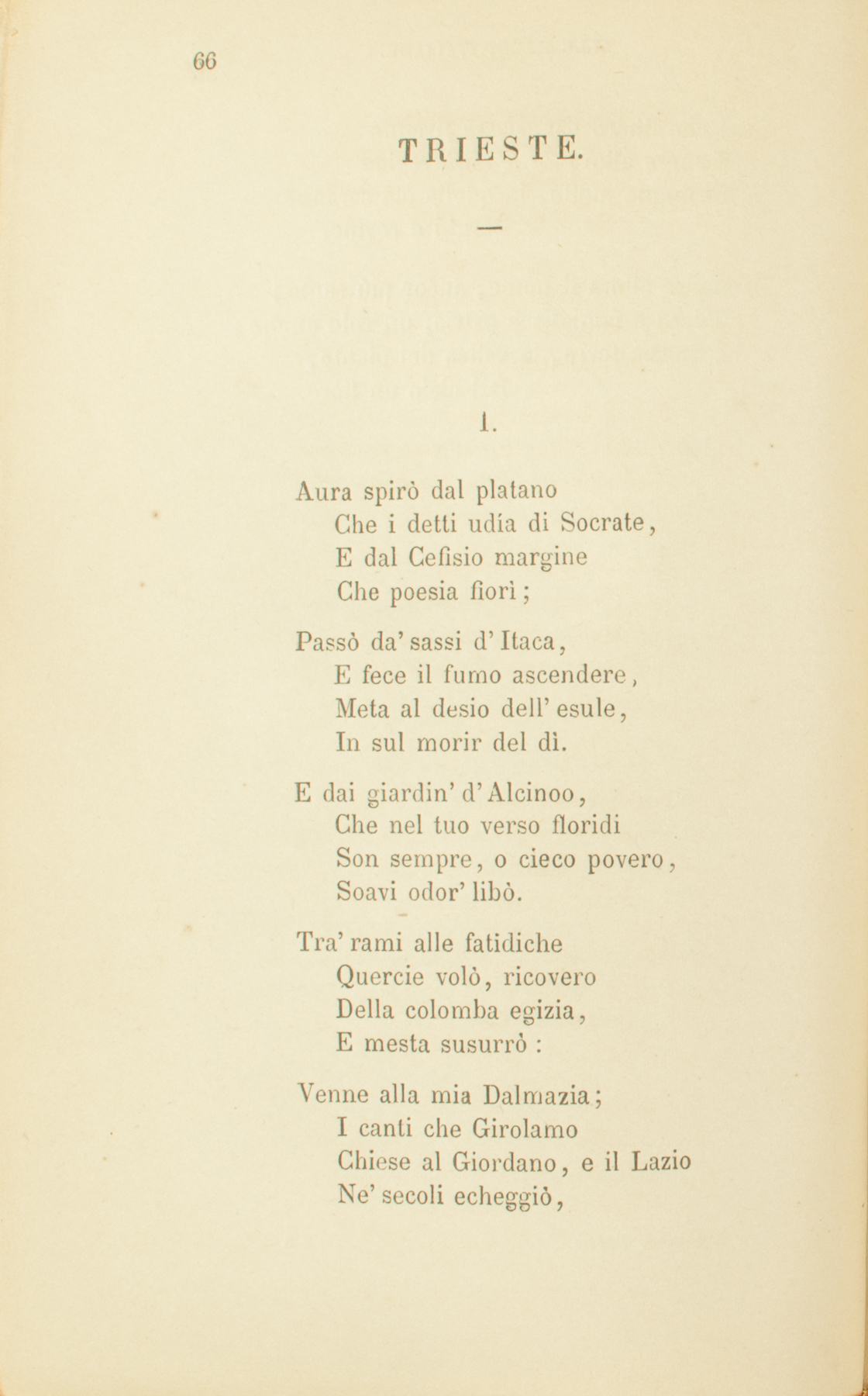 Aura spirò dal platanoChe i detti udía di Socrate,E dal Cefisio margineChe poesia fiorì;Passò da’ sassi d’Itaca,E fece il fumo ascendere,Meta al desio dell’esule,In sul morir del dì.E dai giardin’ d’Alcinoo,Che nel tuo verso floridiSon sempre, o cieco povero,Soavi odor’ libò.Tra’ rami alle fatidicheQuercie volò, ricoveroDella colomba egizia,E mesta susurrò:Venne alla mia Dalmazia;I canti che GirolamoChiese al Giordano, e il LazioNe’ secoli echeggiò,L’aura nel suo passaggioColse da te, mia poveraPatria, com’ape il nettareCoglie da’ vivi fior’.E nell’Arena d’IstriaVuota (empietà magnifica),Sente le tigri fremere,E gli uomini, peggior’.E dell’umane glorieLa pellegrina aereaIn sè raccoglie i gemiti,E l’inno dei dolor’.E tante in te memorie,Trieste, riposandosi,Depon, siccome arteficeStanco del suo lavor.