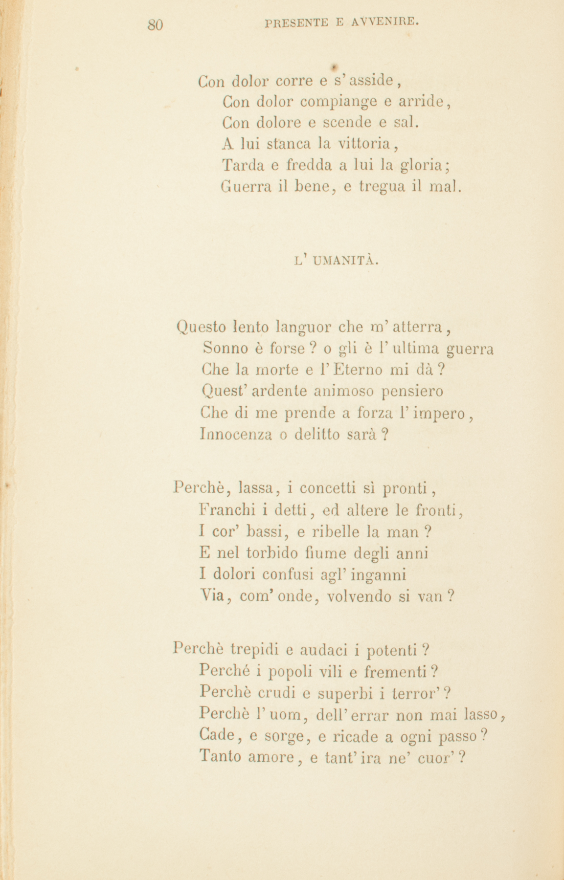 L’UOMOTroppo è libero lo sguardo,E comprende in un sol giroMonti, abissi, e terra e ciel;Troppo il piede infermo e tardo.Spesso il fiume del desiroSi raddensa in pigro gel.Dai desir folli trafitto,Dai desiri al suol confitto,Si ritorce il cuore in sè;E l’idea del ben lontanoLo rallegra e attrista invano,Ricco ignudo, e servo re.Con l’orgoglio e col sospettoEgl’infosca il mite affetto,E le gioìe col timor.Dai diletti e dagli amori,Come vipera dai fiori,Sugge il tosco del dolor.Con dolor corre e s’asside,Con dolor compiange e arride,Con dolore e scende e sal.A lui stanca la vittoria,Tarda e fredda a lui la gloria;Guerra il bene, e tregua il mal.L’ UMANITÀ.Questo lento languor che m’atterra,Sonno è forse? o gli è l’ultima guerraChe la morte e l’Eterno mi dà?Quest’ardente animoso pensieroChe di me prende a forza l’impero,Innocenza o delitto sarà?Perchè, lassa, i concetti sì pronti,Franchi i detti, ed altere le fronti,I cor’ bassi, e ribelle la man?E nel torbido fiume degli anniI dolori confusi agl’inganniVia, com’onde, volvendo si van?Perchè trepidi e audaci i potenti?Perché i popoli vili e frementi?Perchè crudi e superbi i terror’?Perchè l’uom, dell’errar non mai lasso,Cade, e sorge, e ricade a ogni passo?Tanto amore, e tant’ira ne’ cuor’?Ferve un doppio discorde desio:Libertate inimica di DioPugna a morte con pia servitù.E, digiuna nel duro certame,Qual guerrier che boccheggia per fame,Più non regge l’umana virtù.IL TEMPO.Di cielo, di luce, di spirito e d’onda,Di quete rugiade, di marcida fronda,D’umano sudore, si nutrono i fior’.D’indugi, di colpe dal pianto lavate,Di spregi, di preci dal pianto rigate,Di lunghi deliri, si nutre l’amor.Son vari i colori dell’unico raggio:Per lati diversi nell’ampio vïaggioS’avanza il pensiero; nè arretra, nè sta.Le antiche trapassano in forme novelle:Dispare la luna, si celan le stelle,Ma spunta dell’alba la lieta beltà.E il cerchio degli anni con giro più grandeIn alto ed in basso del pari si spande;Più gioie, più duoli rinchiude nel sen.Discorre più tetra l’insana procellaPer vaste pianure: sorride più bellaLa pace del cielo per ampio seren.Pria tacita stilla, poi rivo lucente,Qua fonda fiumana, là sozzo torrente,S’accolgon gli affetti, concorrono al mar.Nell’ira villana, nel vile periglio,Nell’esule patria, nel libero esiglio,Ne’ dubbi, nel sangue, s’impara ad amar.Aix, febbraio 1834.