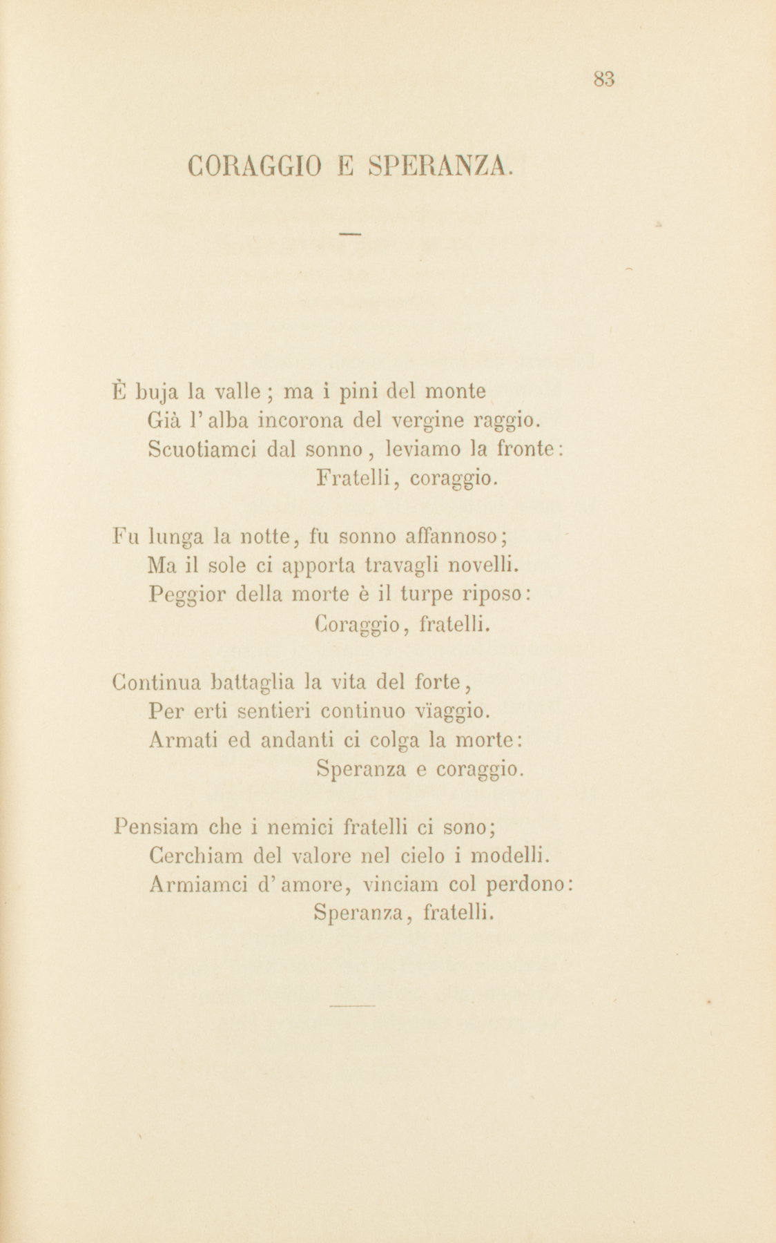 È buja la valle; ma i pini del monteGià l’alba incorona del vergine raggio.Scuotiamci dal sonno, leviamo la fronte:Fratelli, coraggio.Fu lunga la notte, fu sonno affannoso;Ma il sole ci apporta travagli novelli.Peggior della morte è il turpe riposo:Coraggio, fratelli.Continua battaglia la vita del forte,Per erti sentieri continuo vïaggio.Armati ed andanti ci colga la morte:Speranza e coraggio.Pensiam che i nemici fratelli ci sono;Cerchiam del valore nel cielo i modelli.Armiamci d’amore, vinciam col perdono:Speranza, fratelli.