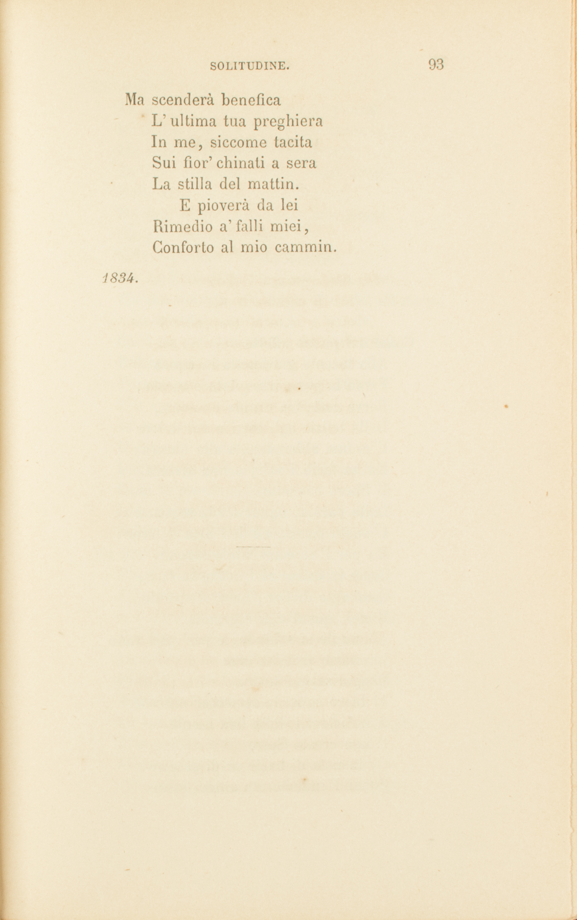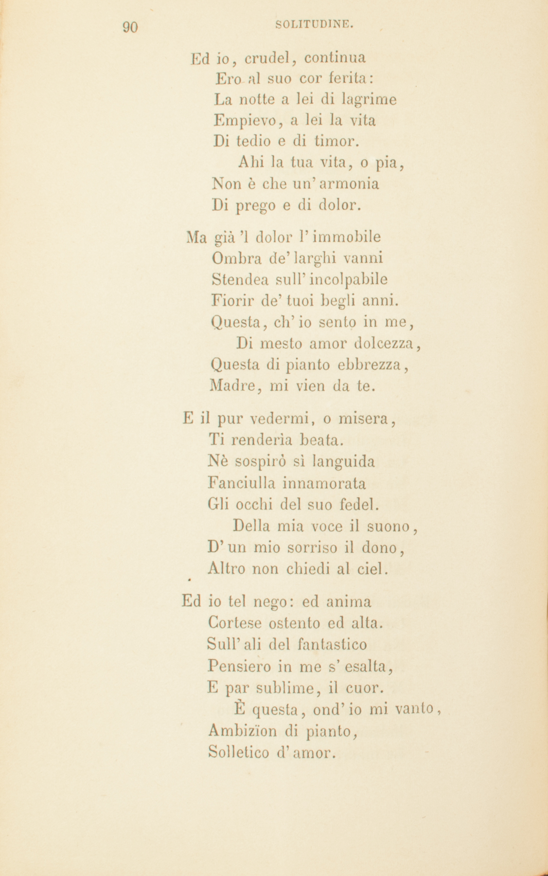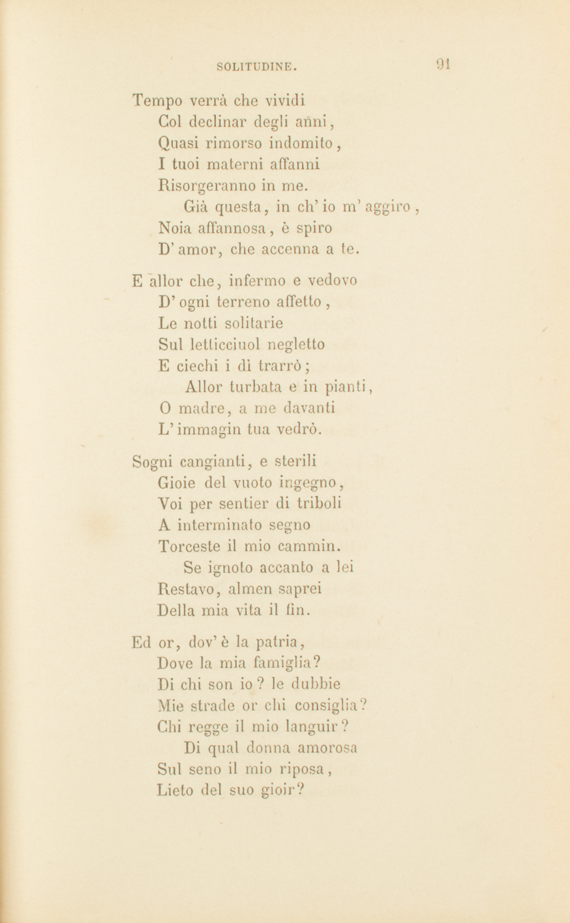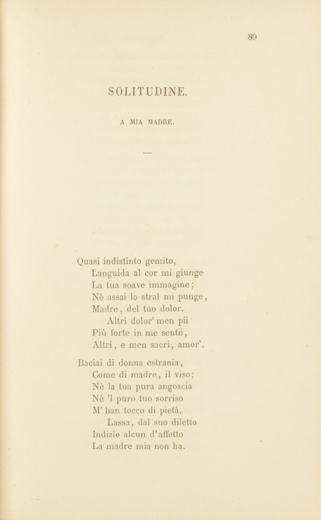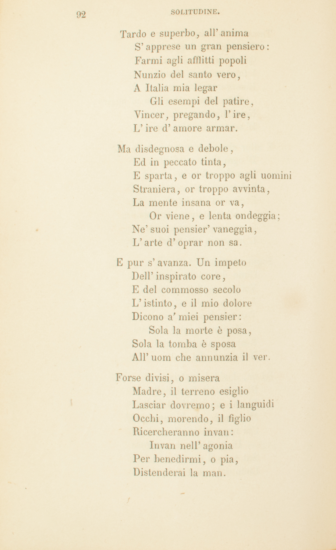 Quasi indistinto gemito,Languida al cor mi giungeLa tua soave immagine;Nè assai lo stral mi punge,Madre, del tuo dolor.Altri dolor’ men piiPiù forte in me sentii,Altri, e men sacri, amor’.Baciai di donna estrania,Come di madre, il viso;Nè la tua pura angosciaNè ’l puro tuo sorrisoM’han tocco di pietà.Lassa, dal suo dilettoIndizio alcun d’affettoLa madre mia non ha.Ed io, crudel, continuaEro al suo cor ferita:La notte a lei di lagrimeEmpievo, a lei la vitaDi tedio e di timor.Ahi la tua vita, o pia,Non è che un’armoniaDi prego e di dolor.Ma già ’l dolor l’immobileOmbra de’ larghi vanniStendea sull’incolpabileFiorir de’ tuoi begli anni.Questa, ch’io sento in me,Di mesto amor dolcezza,Questa di pianto ebbrezza,Madre, mi vien da te.E il pur vedermi, o misera,Ti renderìa beata.Nè sospirò sì languidaFanciulla innamorataGli occhi del suo fedel.Della mia voce il suono,D’un mio sorriso il dono,Altro non chiedi al ciel.Ed io tel nego: ed animaCortese ostento ed alta.Sull’ali del fantasticoPensiero in me s’esalta,E par sublime, il cuor.È questa, ond’io mi vanto,Ambizïon di pianto,Solletico d’amor.Tempo verrà che vividiCol declinar degli anni,Quasi rimorso indomito,I tuoi materni affanniRisorgeranno in me.Già questa, in ch’io m’aggiro,Noia affannosa, è spiroD’amor, che accenna a te.E allor che, infermo e vedovoD’ogni terreno affetto,Le notti solitarieSul letticciuol neglettoE ciechi i dì trarrò;Allor turbata e in pianti,O madre, a me davantiL’immagin tua vedrò.Sogni cangianti, e steriliGioie del vuoto ingegno,Voi per sentier di triboliA interminato segnoTorceste il mio cammin.Se ignoto accanto a leiRestavo, almen sapreiDella mia vita il fin.Ed or, dov’è la patria,Dove la mia famiglia?Di chi son io? le dubbieMie strade or chi consiglia?Chi regge il mio languir?Di qual donna amorosaSul seno il mio riposa,Lieto del suo gioir?Tardo e superbo, all’animaS’apprese un gran pensiero:Farmi agli afflitti popoliNunzio del santo vero,A Italia mia legarGli esempi del patire,Vincer, pregando, l’ire,L’ire d’amore armar.Ma disdegnosa e debole,Ed in peccato tinta,E sparta, e or troppo agli uominiStraniera, or troppo avvinta,La mente insana or va,Or viene, e lenta ondeggia;Ne’ suoi pensier’ vaneggia,L’arte d’oprar non sa.E pur s’avanza. Un impetoDell’inspirato core,E del commosso secoloL’istinto, e il mio doloreDicono a’ miei pensier:Sola la morte è posa,Sola la tomba è sposaAll’uom che annunzia il ver.Forse divisi, o miseraMadre, il terreno esiglioLasciar dovremo; e i languidiOcchi, morendo, il figlioRicercheranno invan:Invan nell’ agoniaPer benedirmi, o pia,Distenderai la man.Ma scenderà beneficaL’ultima tua preghieraIn me, siccome tacitaSui fior’ chinati a seraLa stilla del mattin.E pioverà da leiRimedio a’ falli miei,Conforto al mio cammin.1834.