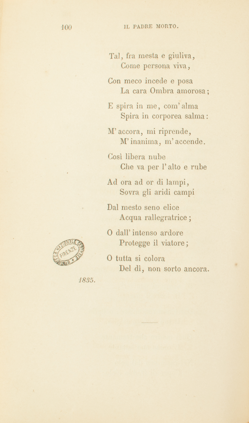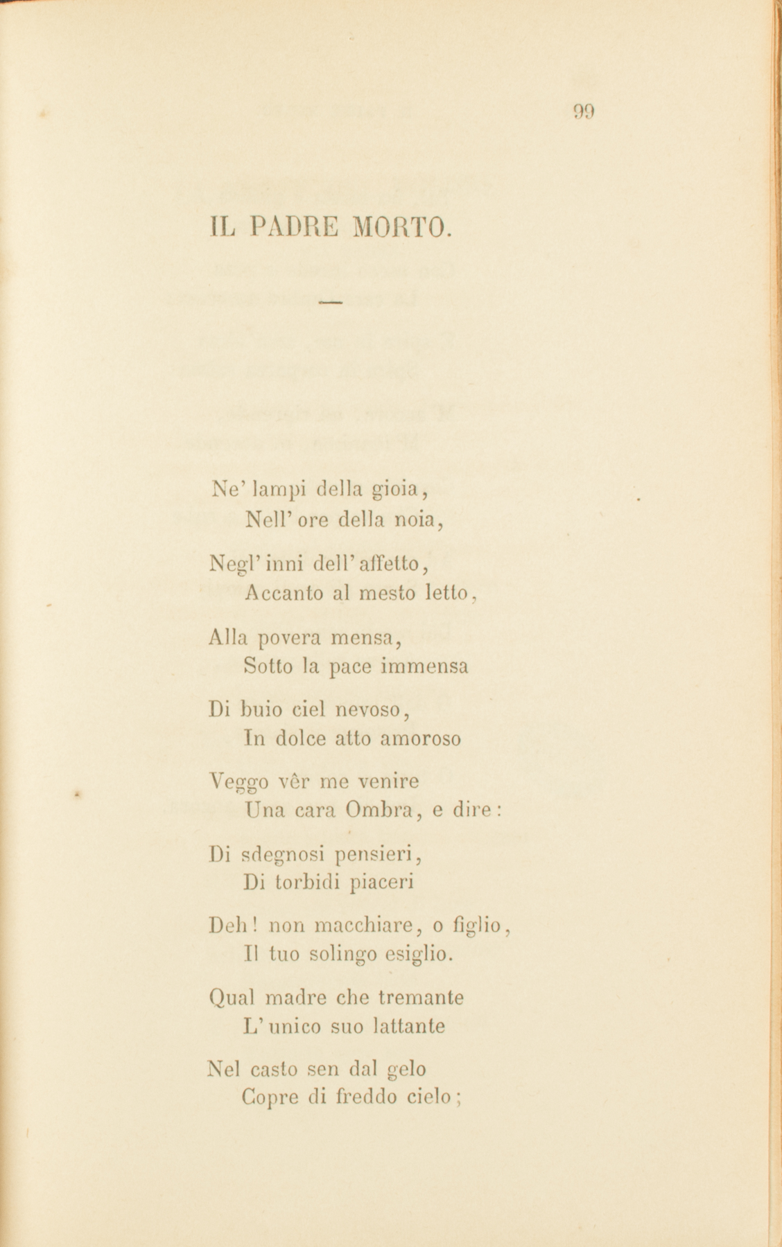 Ne’ lampi della gioia,Nell’ore della noia,Negl’inni dell’affetto,Accanto al mesto letto,Alla povera mensa,Sotto la pace immensaDi buio ciel nevoso,In dolce atto amorosoVeggo vêr me venireUna cara Ombra, e dire:Di sdegnosi pensieri,Di torbidi piaceriDeh! non macchiare, o figlio,Il tuo solingo esiglio.Qual madre che tremanteL’unico suo lattanteNel casto sen dal geloCopre di freddo cielo;Tal, fra mesta e giuliva,Come persona viva,Con meco incede e posaLa cara Ombra amorosa;E spira in me, com’almaSpira in corporea salma:M’accora, mi riprende,M’inanima, m’accende.Così libera nubeChe va per l’alto e rubeAd ora ad or di lampi,Sovra gli aridi campiDal mesto seno eliceAcqua rallegratrice;O dall’ intenso ardoreProtegge il viatore;O tutta si coloraDel dì, non sorto ancora.1835.