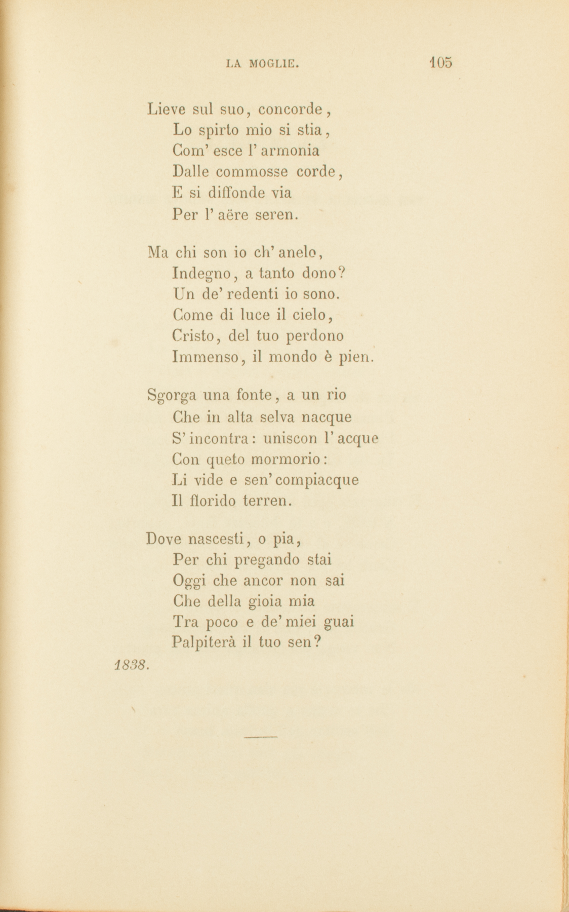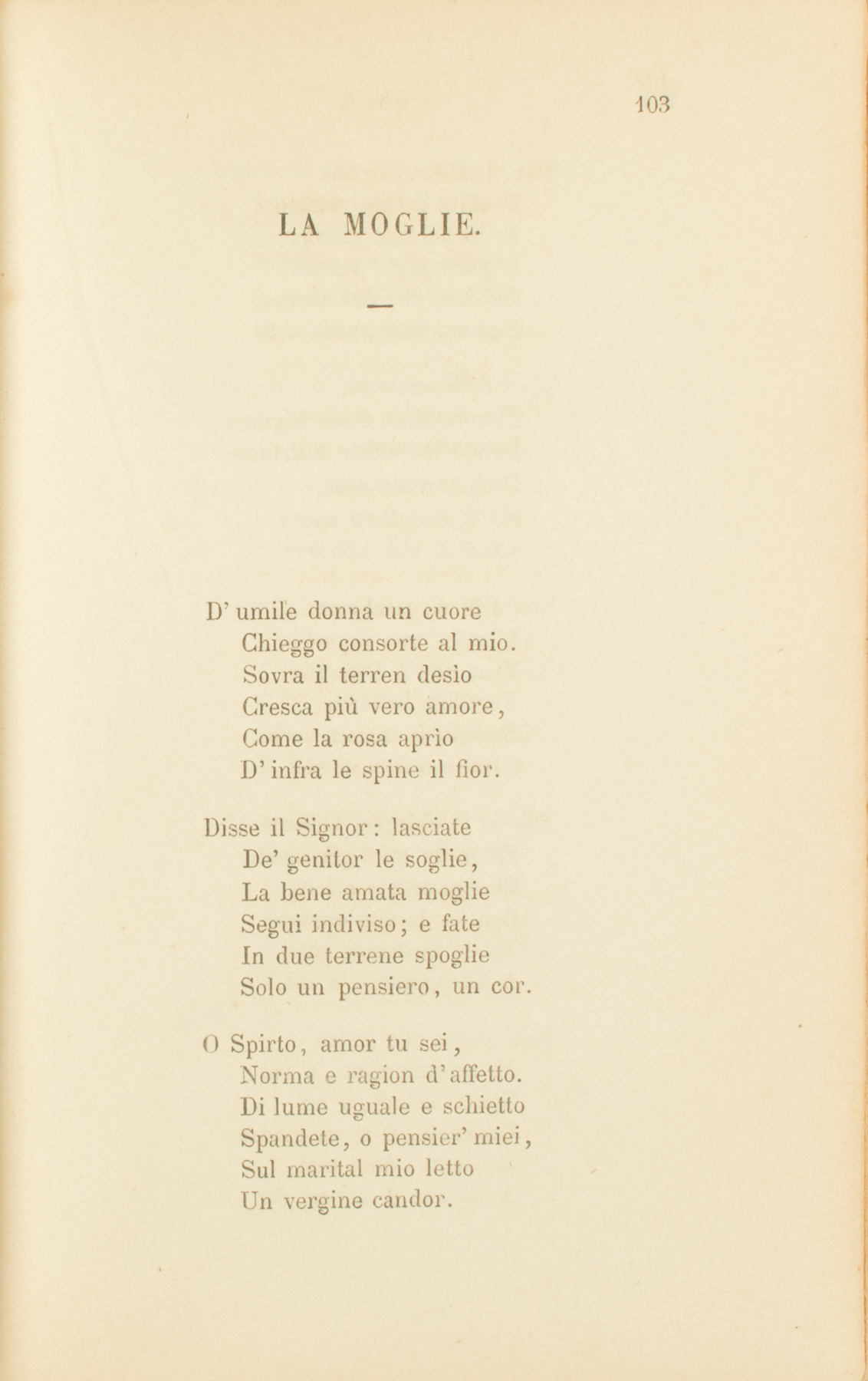 D’umile donna un cuoreChieggo consorte al mio.Sovra il terren desìoCresca più vero amore,Come la rosa aprìoD’infra le spine il fior.Disse il Signor: lasciateDe’ genitor le soglie,La bene amata moglieSegui indiviso; e fateIn due terrene spoglieSolo un pensiero, un cor.O Spirto, amor tu sei,Norma e ragion d’affetto.Di lume uguale e schiettoSpandete, o pensier’ miei,Sul marital mio lettoUn vergine candor.Ella, taciuto, intendaE affini il mio sentire;Brilli del mio gioire,E geminato il renda.Del ben che dee venire,Signor, sian grazie a te.Gioia delle amoroseTue mani, o buon Signore,Donna innocente è il fioreDelle terrene cose.Ma di mondano onoreCarca la mia non è:Non è di vil ricchezzaL’unica mia superba;Vana non è d’acerbaTerribile bellezza:Schietti e raccolti serbaGioia e dolori in sè.Tale io la chieggo. O casteSpose de’ miei già morti,Che mansuete e fortiCon lor la vita opraste,Voi le medesme sortiA lei pregate e a me.Dell’anime che padreMi chiameranno, o voi,Spirti custodi, a noiGuardate. O terra madre,Consenti i doni tuoiA lei che il ciel mi diè.Lieve sul suo, concorde,Lo spirto mio si stia,Com’esce l’armoniaDalle commosse corde,E si diffonde viaPer l’aëre seren.Ma chi son io ch’anelo,Indegno, a tanto dono?Un de’ redenti io sono.Come di luce il cielo,Cristo, del tuo perdonoImmenso, il mondo è pien.Sgorga una fonte, a un rioChe in alta selva nacqueS’incontra: uniscon l’acqueCon queto mormorio:Li vide e sen’ compiacqueIl florido terren.Dove nascesti, o pia,Per chi pregando staiOggi che ancor non saiChe della gioia miaTra poco e de’ miei guaiPalpiterà il tuo sen?1838.