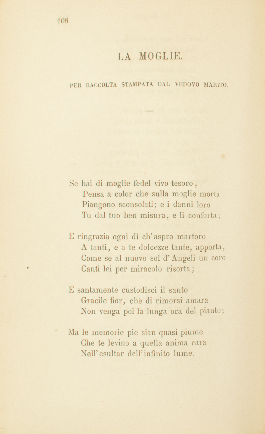 Se hai di moglie fedel vivo tesoro,Pensa a color che sulla moglie mortaPiangono sconsolati; e i danni loroTu dal tuo ben misura, e li conforta;E ringrazia ogni dì ch’aspro martoroA tanti, e a te dolcezze tante, apporta,Come se al nuovo sol d’Angeli un coroCanti lei per miracolo risorta;E santamente custodisci il santoGracile fior, chè di rimorsi amaraNon venga poi la lunga ora del pianto;Ma le memorie pie sian quasi piumeChe te levino a quella anima caraNell’esultar dell’infinito lume.