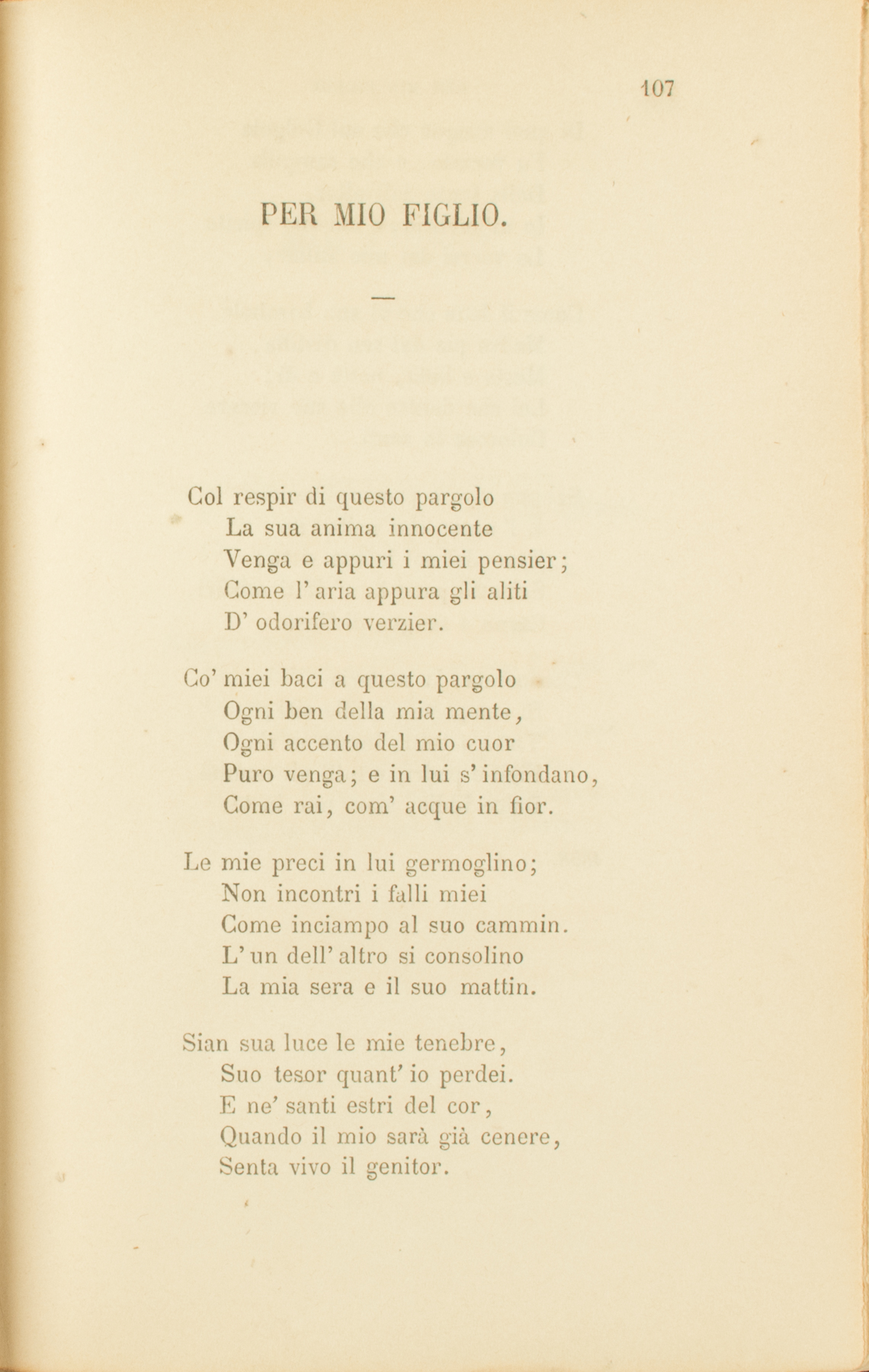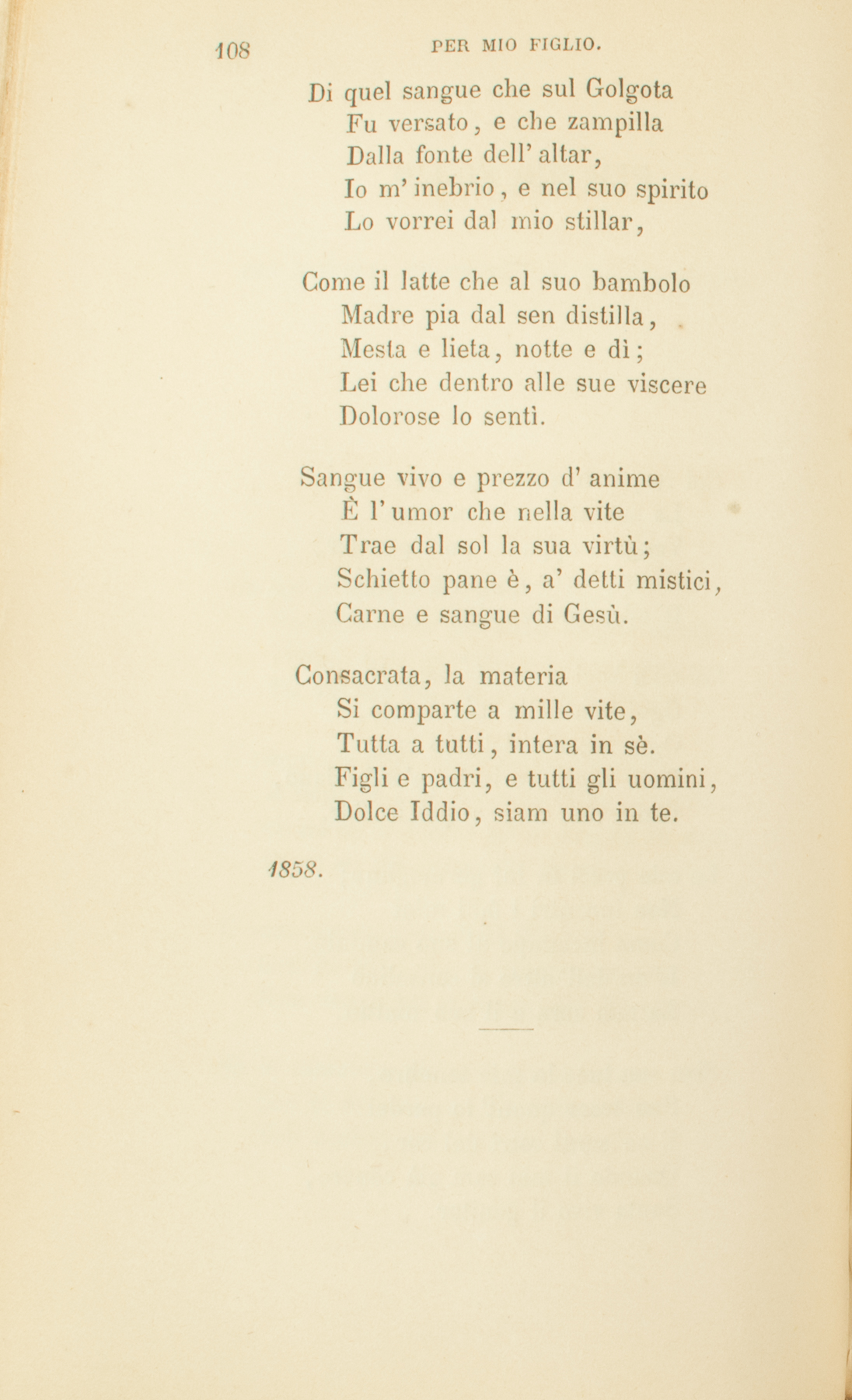 Col respir di questo pargoloLa sua anima innocenteVenga e appuri i miei pensier;Come l’aria appura gli alitiD’odorifero verzier.Co’ miei baci a questo pargoloOgni ben della mia mente,Ogni accento del mio cuorPuro venga; e in lui s’infondano,Come rai, com’acque in fior.Le mie preci in lui germoglino;Non incontri i falli mieiCome inciampo al suo cammin.L’un dell’altro si consolinoLa mia sera e il suo mattin.Sian sua luce le mie tenebre,Suo tesor quant’io perdei.E ne’ santi estri del cor,Quando il mio sarà già cenere,Senta vivo il genitor.Di quel sangue che sul GolgotaFu versato, e che zampillaDalla fonte dell’altar,Io m’inebrio, e nel suo spiritoLo vorrei dal mio stillar,Come il latte che al suo bamboloMadre pia dal sen distilla,Mesta e lieta, notte e dì;Lei che dentro alle sue viscereDolorose lo sentì.Sangue vivo e prezzo d’animeÈ l’umor che nella viteTrae dal sol la sua virtù;Schietto pane è, a’ detti mistici,Carne e sangue di Gesù.Consacrata, la materiaSi comparte a mille vite,Tutta a tutti, intera in sè.Figli e padri, e tutti gli uomini,Dolce Iddio, siam uno in te.1858.