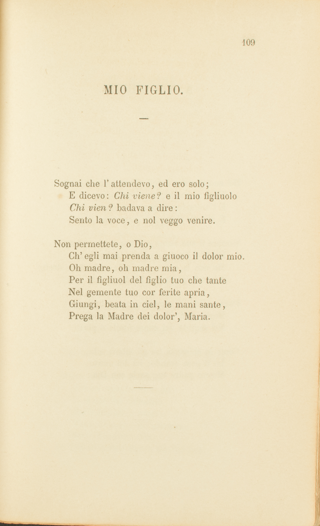 Sognai che l’attendevo, ed ero solo;E dicevo: Chi viene? e il mio figliuoloChi vien? badava a dire:Sento la voce, e nol veggo venire.Non permettete, o Dio,Ch’egli mai prenda a giuoco il dolor mio.Oh madre, oh madre mia,Per il figliuol del figlio tuo che tanteNel gemente tuo cor ferite apria,Giungi, beata in ciel, le mani sante,Prega la Madre dei dolor’, Maria.
