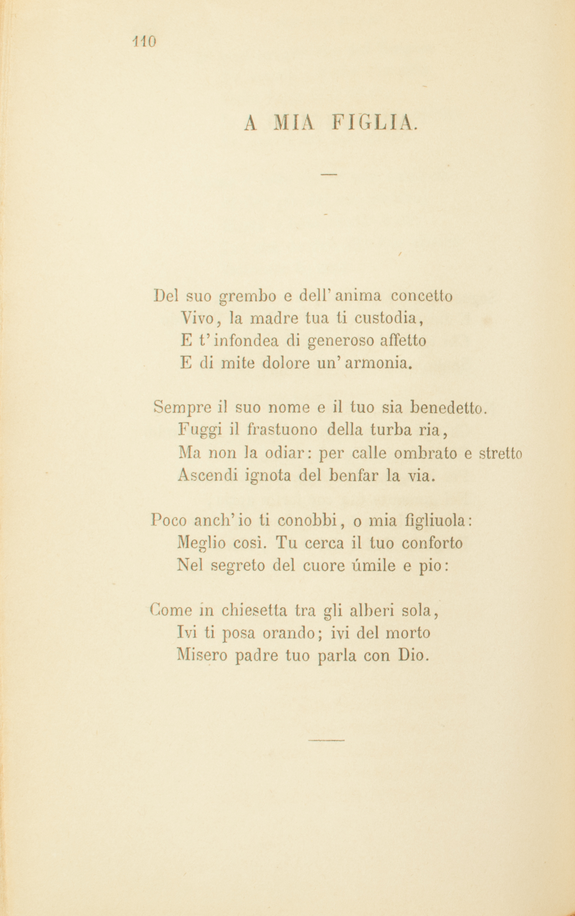 Del suo grembo e dell’anima concettoVivo, la madre tua ti custodia,E t’infondea di generoso affettoE di mite dolore un’armonia.Sempre il suo nome e il tuo sia benedetto.Fuggi il frastuono della turba ria,Ma non la odiar: per calle ombrato e strettoAscendi ignota del benfar la via.Poco anch’io ti conobbi, o mia figliuola:Meglio così. Tu cerca il tuo confortoNel segreto del cuore úmile e pio:Come in chiesetta tra gli alberi sola,Ivi ti posa orando; ivi del mortoMisero padre tuo parla con Dio.