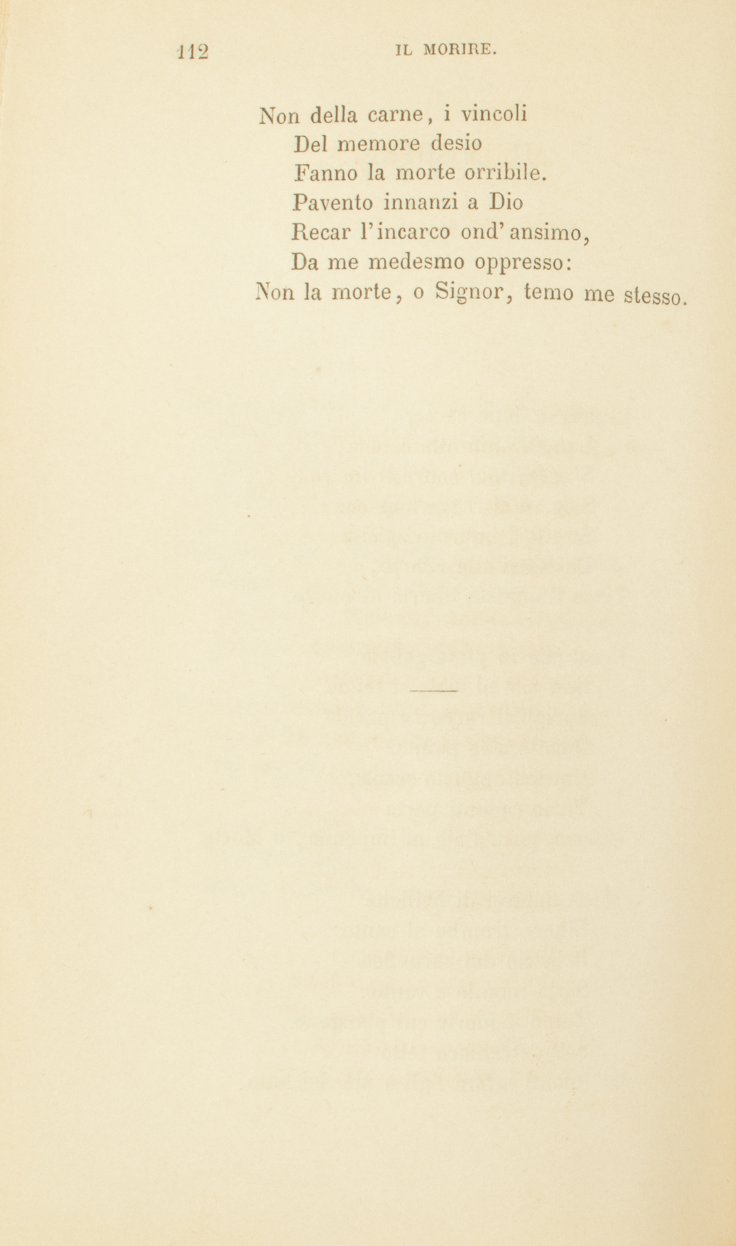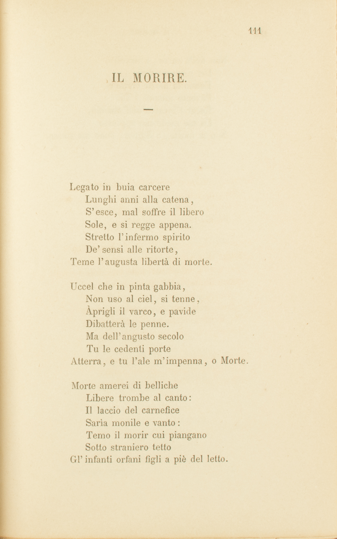 Legato in buia carcereLunghi anni alla catena,S’esce, mal soffre il liberoSole, e si regge appena.Stretto l’infermo spiritoDe’ sensi alle ritorte,Teme l’augusta libertà di morte.Uccel che in pinta gabbia,Non uso al ciel, si tenne,Àprigli il varco, e pavideDibatterà le penne.Ma dell’angusto secoloTu le cedenti porteAtterra, e tu l’ale m’impenna, o Morte.Morte amerei di bellicheLibere trombe al canto:Il laccio del carneficeSarìa monile e vanto:Temo il morir cui pianganoSotto straniero tettoGl’infanti orfani figli a piè del letto.Non della carne, i vincoliDel memore desioFanno la morte orribile.Pavento innanzi a DioRecar l’incarco ond’ansimo,Da me medesmo oppresso:Non la morte, o Signor, temo me stesso.