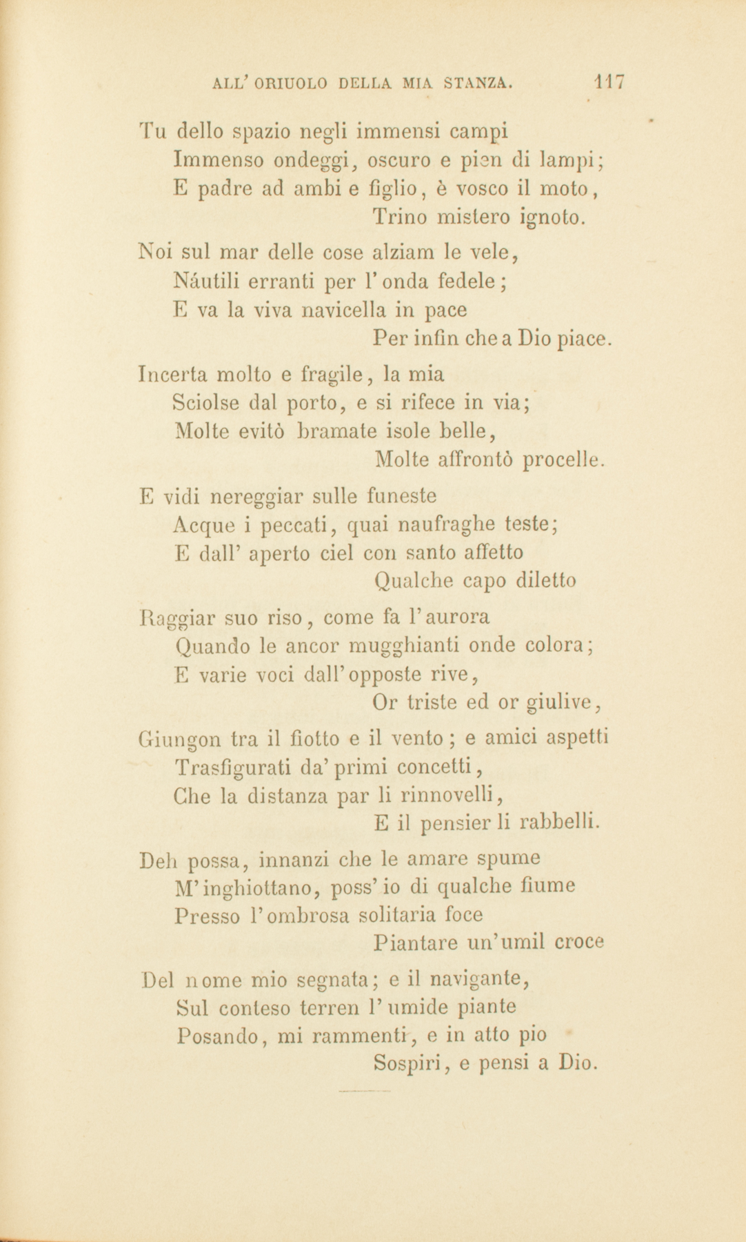 Misura e testimon de’ miei pensieri,De’ preghi umili e de’ lamenti alteri,Che pochi al giorno mio momenti gaiSegni, e son pure assai;Non t’arrestar. Su te corrente, posaL’occhio mio, come suol donna amorosaGuardar, temendo, ad una cara vita,Che non le sia rapita.Segui, o angel dell’ore, in tuo vïaggioL’egro mio frale e ’l mio stanco coraggio.Ha bisogno, o fedel, l’anima miaDella tua compagnia;Di chi per man la guidi, e con amoreSevero, come pan, mi parta l’ore.Ne’ tuoi giri contempla il pensier mio,Come nel sole, Iddio.Tu mi di’ come gli atomi e i pianetiPer l’infinito veleggino lieti;Come l’arcana mia vita cammineVerso un arcano fine.Oh tempo, oh steso fra la terra e il cieloDi pensiero e d’amor gracile velo;Che in te segnato il nulla e il viver porte,E l’Eterno e la Morte;Tu dello spazio negli immensi campiImmenso ondeggi, oscuro e pien di lampi;E padre ad ambi e figlio, è vosco il moto,Trino mistero ignoto.Noi sul mar delle cose alziam le vele,Náutili erranti per l’onda fedele;E va la viva navicella in pacePer infin che a Dio piace.Incerta molto e fragile, la miaSciolse dal porto, e si rifece in via;Molte evitò bramate isole belle,Molte affrontò procelle.E vidi nereggiar sulle funesteAcque i peccati, quai naufraghe teste;E dall’aperto ciel con santo affettoQualche capo dilettoRaggiar suo riso, come fa l’auroraQuando le ancor mugghianti onde colora;E varie voci dall’opposte rive,Or triste ed or giulive,Giungon tra il fiotto e il vento; e amici aspettiTrasfigurati da’ primi concetti,Che la distanza par li rinnovelli,E il pensier li rabbelli.Deh possa, innanzi che le amare spumeM’inghiottano, poss’io di qualche fiumePresso l’ombrosa solitaria focePiantare un’umil croceDel nome mio segnata; e il navigante,Sul conteso terren l’umide piantePosando, mi rammenti, e in atto pioSospiri, e pensi a Dio.