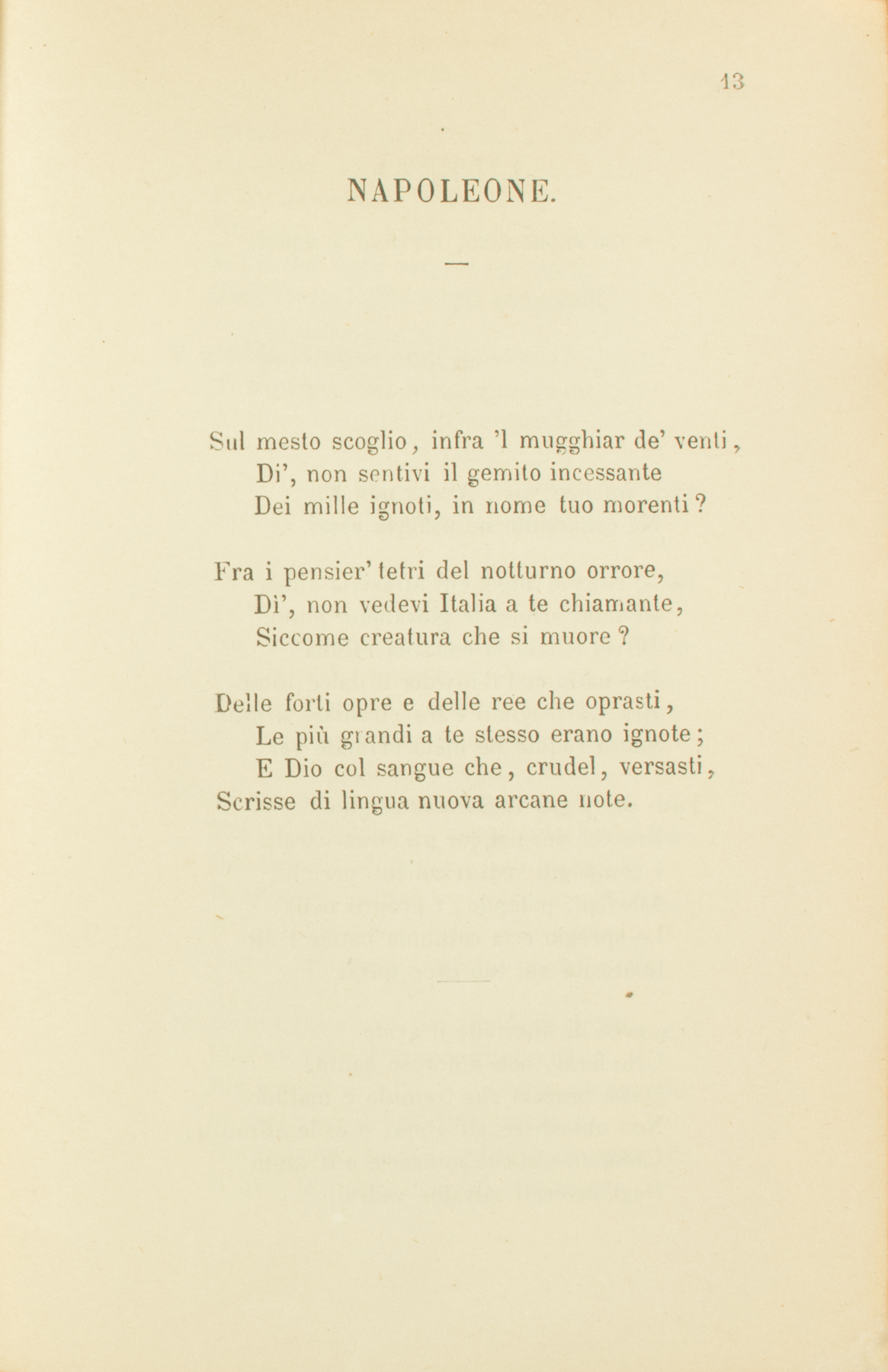 Sul mesto scoglio, infra’ l mugghiar de’ venti,Di’, non sentivi il gemito incessanteDei mille ignoti, in nome tuo morenti?Fra i pensier’ tetri del notturno orrore,Di’, non vedevi Italia a te chiamante,Siccome creatura che si muore?Delle forti opre e delle ree che oprasti,Le più grandi a te stesso erano ignote;E Dio col sangue che, crudel, versasti,Scrisse di lingua nuova arcane note.