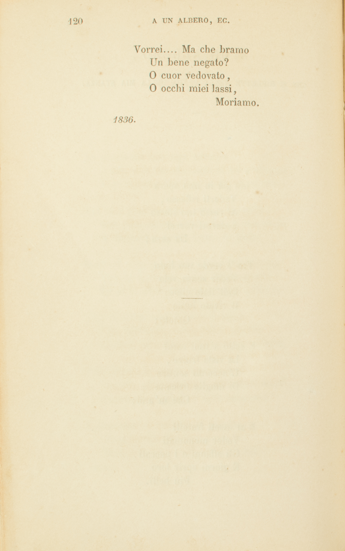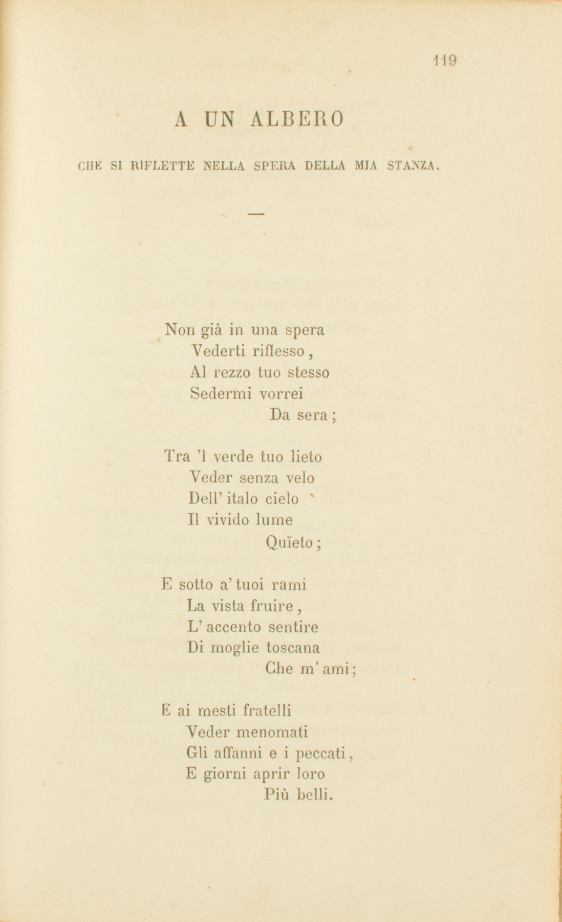 Non già in una speraVederti riflesso,Al rezzo tuo stessoSedermi vorreiDa sera;Tra ’l verde tuo lietoVeder senza veloDell’italo cieloIl vivido lumeQuïeto;E sotto a’ tuoi ramiLa vista fruire,L’accento sentireDi moglie toscanaChe m’ami;E ai mesti fratelliVeder menomatiGli affanni e i peccati,E giorni aprir loroPiù belli.Vorrei.... Ma che bramoUn bene negato?O cuor vedovato,O occhi miei lassi,Moriamo.1836.