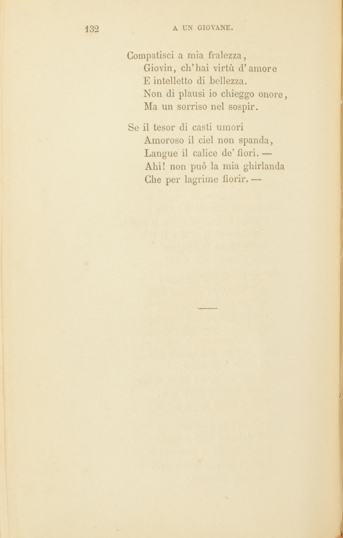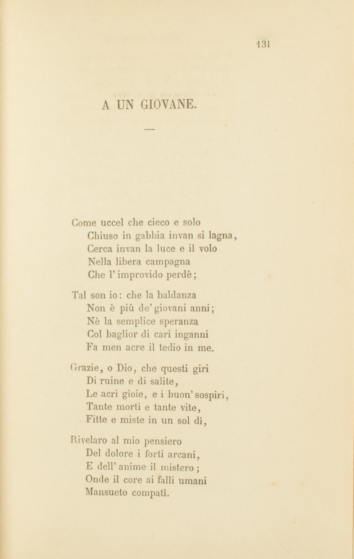 Come uccel che cieco e soloChiuso in gabbia invan si lagna,Cerca invan la luce e il voloNella libera campagnaChe l’improvido perdè;Tal son io: che la baldanzaNon è più de’ giovani anni;Nè la semplice speranzaCol baglior di cari inganniFa men acre il tedio in me.Grazie, o Dio, che questi giriDi ruine e di salite,Le acri gioie, e i buon’ sospiri,Tante morti e tante vite,Fitte e miste in un sol dì,Rivelaro al mio pensieroDel dolore i forti arcani,E dell’anime il mistero;Onde il core ai falli umaniMansueto compatì.Compatisci a mia fralezza,Giovin, ch’hai virtù d’amoreE intelletto di bellezza.Non di plausi io chieggo onore,Ma un sorriso nel sospir.Se il tesor di casti umoriAmoroso il ciel non spanda,Langue il calice de’ fiori. —Ahi! non può la mia ghirlandaChe per lagrime fiorir. —
