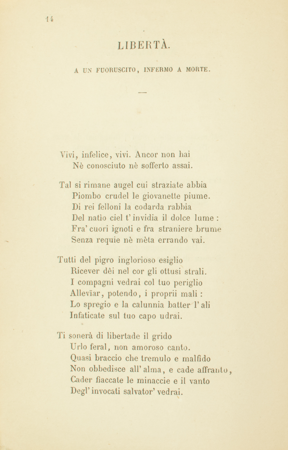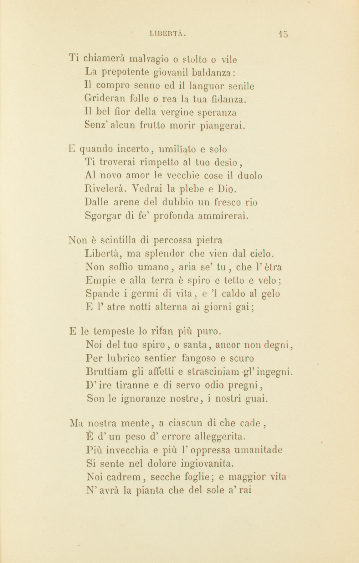 Vivi, infelice, vivi. Ancor non haiNè conosciuto nè sofferto assai.Tal si rimane augel cui straziate abbiaPiombo crudel le giovanette piume.Di rei felloni la codarda rabbiaDel natìo ciel t’invidia il dolce lume:Fra’ cuori ignoti e fra straniere brumeSenza requie nè mèta errando vai.Tutti del pigro inglorioso esiglioRicever dêi nel cor gli ottusi strali.I compagni vedrai col tuo periglioAlleviar, potendo, i proprii mali:Lo spregio e la calunnia batter l’aliInfaticate sul tuo capo udrai.Ti sonerà di libertade il gridoUrlo feral, non amoroso canto.Quasi braccio che tremulo e malfidoNon obbedisce all’alma, e cade affranto,Cader fiaccate le minaccie e il vantoDegl’invocati salvator’ vedrai.Ti chiamerà malvagio o stolto o vileLa prepotente giovanil baldanza:Il compro senno ed il languor senileGrideran folle o rea la tua fidanza.Il bel fior della vergine speranzaSenz’alcun frutto morir piangerai.E quando incerto, umilïato e soloTi troverai rimpetto al tuo desìo,Al novo amor le vecchie cose il duoloRivelerà. Vedrai la plebe e Dio.Dalle arene del dubbio un fresco rioSgorgar di fe’ profonda ammirerai.Non è scintilla di percossa pietraLibertà, ma splendor che vien dal cielo.Non soffio umano, aria se’ tu, che l’ètraEmpie e alla terra è spiro e tetto e velo;Spande i germi di vita, e ’l caldo al geloE l’atre notti alterna ai giorni gai;E le tempeste lo rifan più puro.Noi del tuo spiro, o santa, ancor non degni,Per lubrico sentier fangoso e scuroBruttiam gli affetti e strasciniam gl’ingegni.D’ire tiranne e di servo odio pregni,Son le ignoranze nostre, i nostri guai.Ma nostra mente, a ciascun dì che cade,È d’un peso d’errore alleggerita.Più invecchia e più l’oppressa umanitadeSi sente nel dolore ingiovanita.Noi cadrem, secche foglie; e maggior vitaN’avrà la pianta che del sole a’ raiEterni eterna sorge; e i nostri affanniAssenneranno la ventura gente.Come sordo fanciul dopo molti anniParla le voci che, guarito, ei sente,Tale, o Signor, fia d’essi, e insiemementeA parlare e a sentir li ispirerai.Vivi, infelice, vivi. Ancor non haiNè disperato nè creduto assai.Piazza della Bastiglia, 1835.