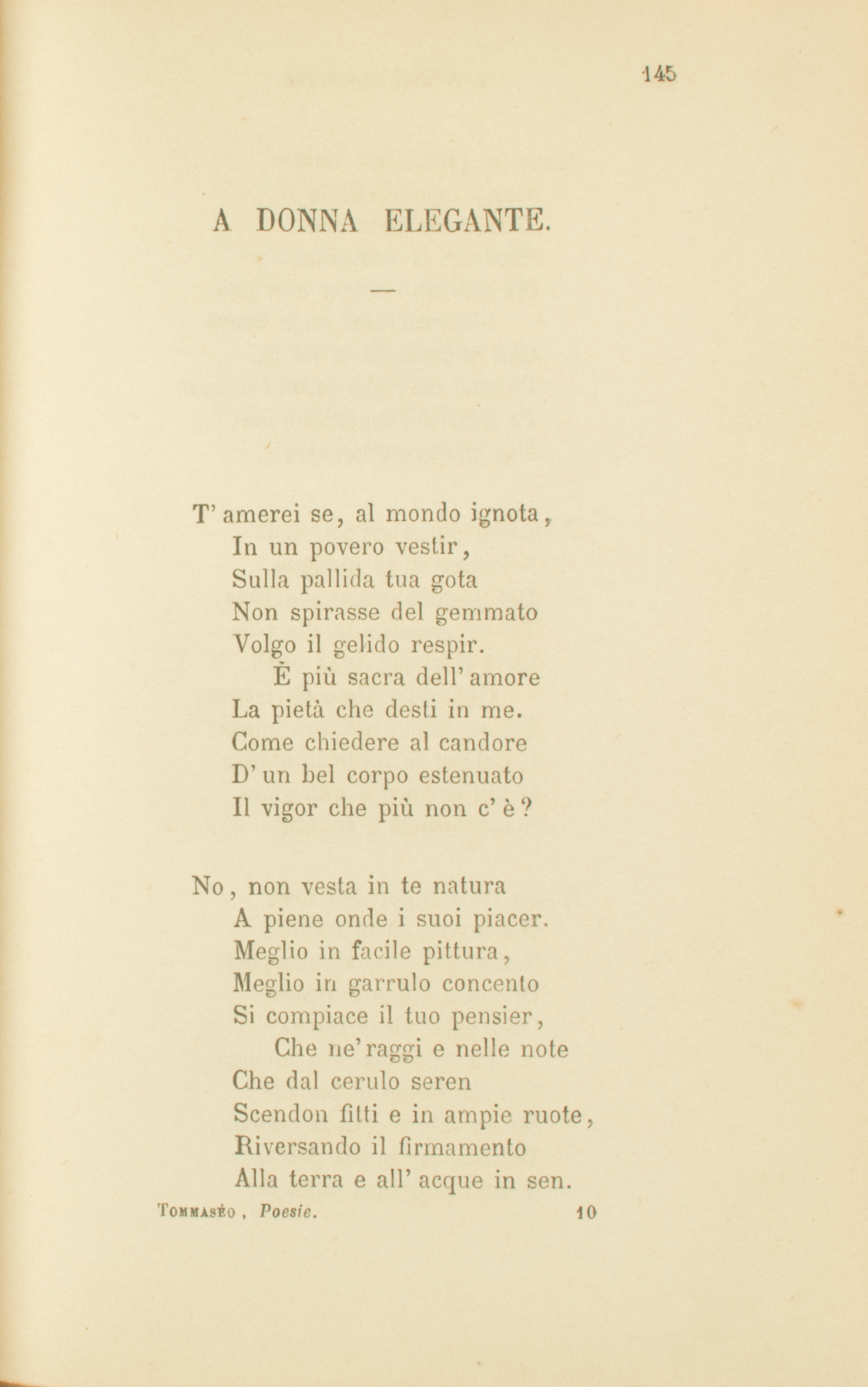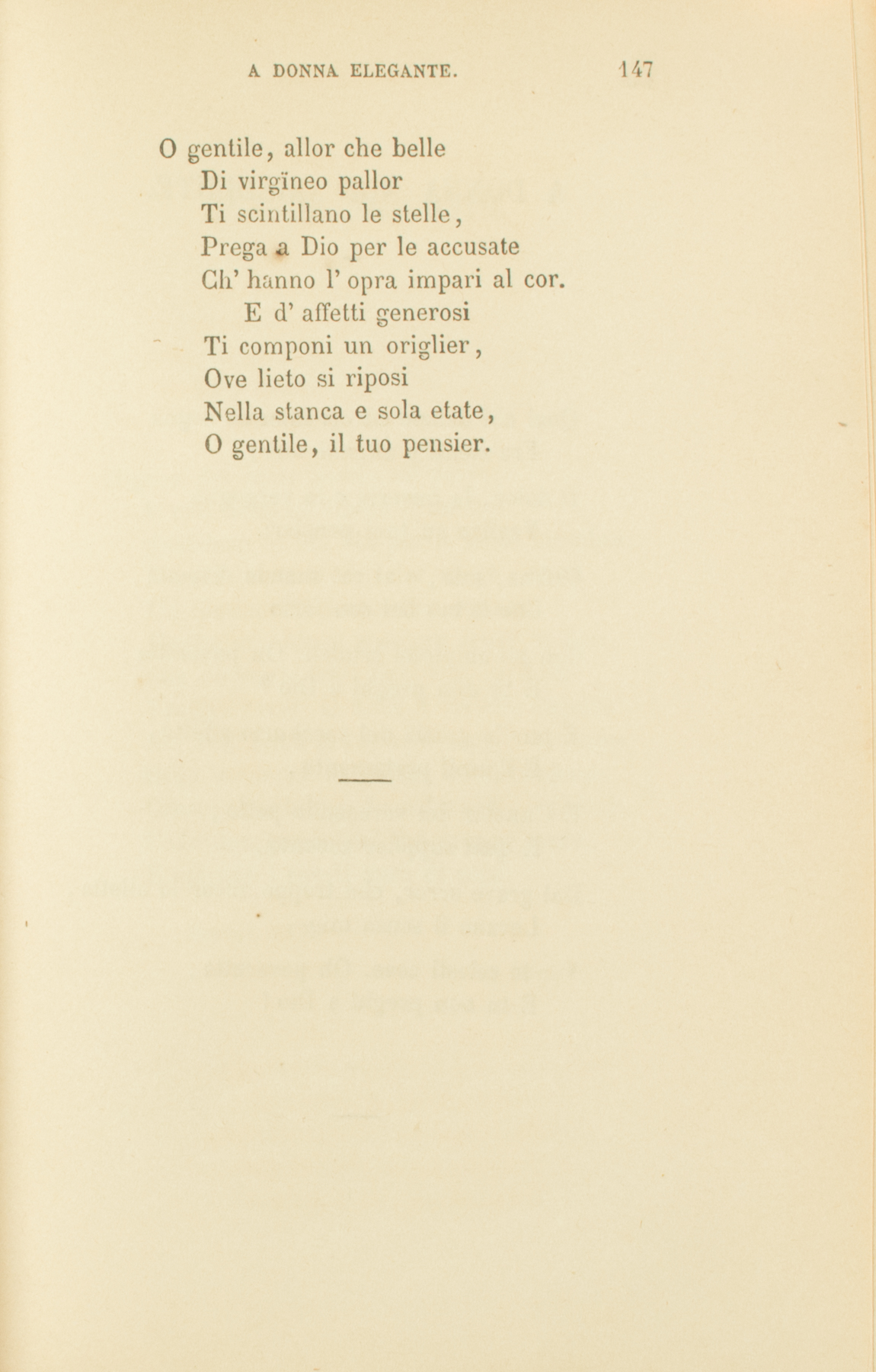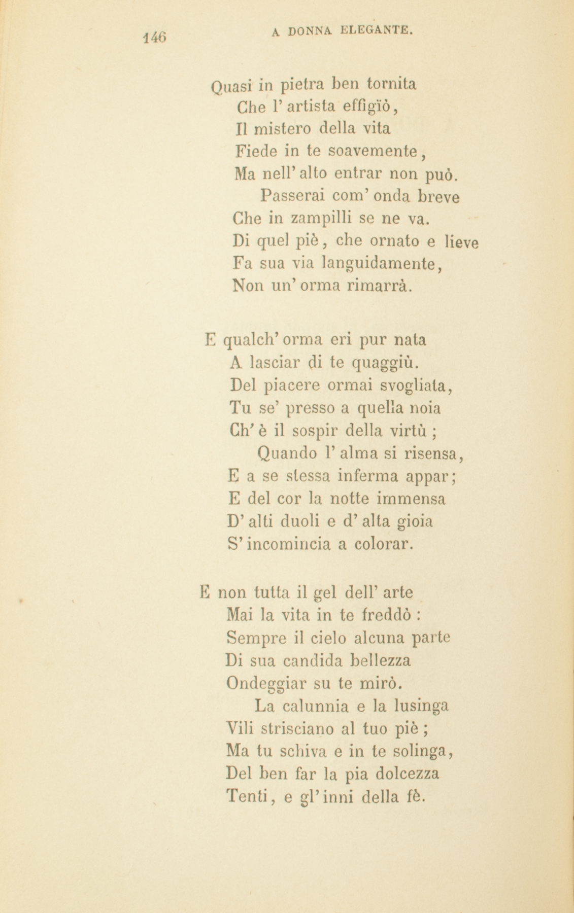 T’amerei se, al mondo ignota,In un povero vestir,Sulla pallida tua gotaNon spirasse del gemmatoVolgo il gelido respir.È più sacra dell’amoreLa pietà che desti in me.Come chiedere al candoreD’un bel corpo estenuatoIl vigor che più non c’è?No, non vesta in te naturaA piene onde i suoi piacer.Meglio in facile pittura,Meglio in garrulo concentoSi compiace il tuo pensier,Che ne’ raggi e nelle noteChe dal cerulo serenScendon fitti e in ampie ruote,Riversando il firmamentoAlla terra e all’acque in sen.Quasi in pietra ben tornitaChe l’artista effigïò,Il mistero della vitaFiede in te soavemente,Ma nell’alto entrar non può.Passerai com’onda breveChe in zampilli se ne va.Di quel piè, che ornato e lieveFa sua via languidamente,Non un’orma rimarrà.E qualch’orma eri pur nataA lasciar di te quaggiù.Del piacere ormai svogliata,Tu se’ presso a quella noiaCh’è il sospir della virtù;Quando l’alma si risensa,E a se stessa inferma appar;E del cor la notte immensaD’alti duoli e d’alta gioiaS’incomincia a colorar.E non tutta il gel dell’arteMai la vita in te freddò:Sempre il cielo alcuna parteDi sua candida bellezzaOndeggiar su te mirò.La calunnia e la lusingaVili strisciano al tuo piè;Ma tu schiva e in te solinga,Del ben far la pia dolcezzaTenti, e gl’inni della fè.O gentile, allor che belleDi virgïneo pallorTi scintillano le stelle,Prega a Dio per le accusateCh’hanno l’opra impari al cor.E d’affetti generosiTi componi un origlier,Ove lieto si riposiNella stanca e sola etate,O gentile, il tuo pensier.