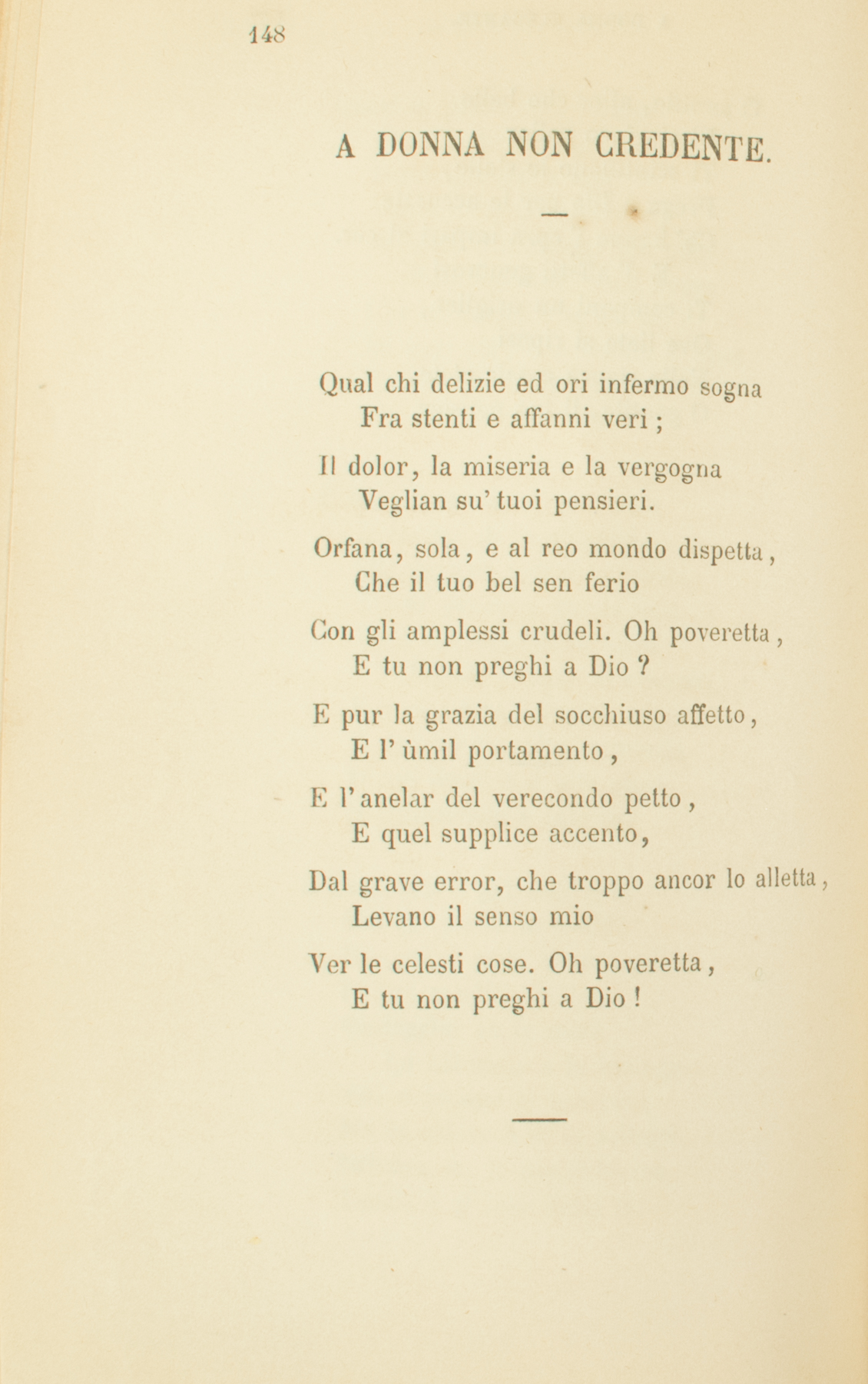 Qual chi delizie ed ori infermo sognaFra stenti e affanni veri;abbracciamentiIl dolor, la miseria e la vergognaVeglian su’ tuoi pensieri.Orfana, sola, e al reo mondo dispetta,Che il tuo bel sen ferioCon gli amplessi crudeli. Oh poveretta,E tu non preghi a Dio?E pur la grazia del socchiuso affetto,E l’ùmil portamento,E l’anelar del verecondo petto,E quel supplice accento,Dal grave error, che troppo ancor lo alletta,Levano il senso mioVer le celesti cose. Oh poveretta,E tu non preghi a Dio!
