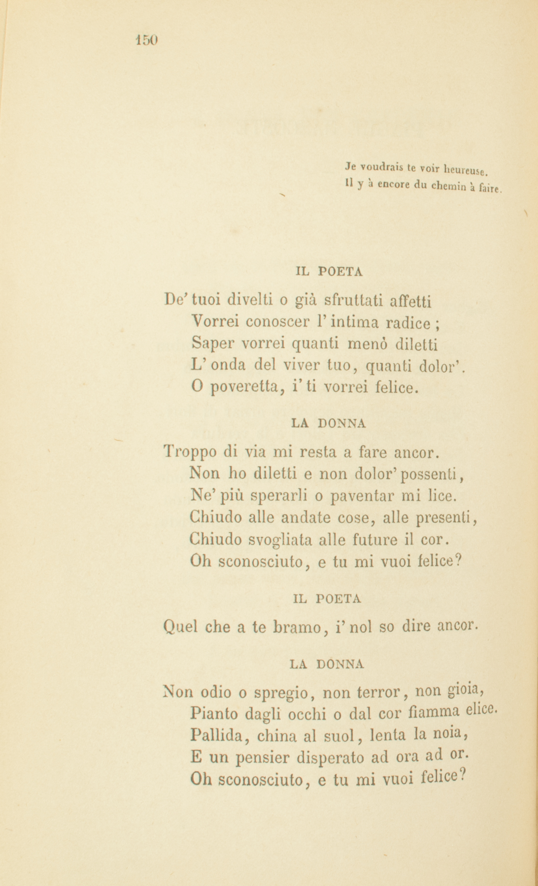 IL POETADe’ tuoi divelti o già sfruttati affettiVorrei conoscer l’intima radice;Saper vorrei quanti menò dilettiL’onda del viver tuo, quanti dolor’.O poveretta, i’ ti vorrei felice.LA DONNATroppo di via mi resta a fare ancor.Non ho diletti e non dolor’ possenti,Ne’ più sperarli o paventar mi lice.Chiudo alle andate cose, alle presenti,Chiudo svogliata alle future il cor.Oh sconosciuto, e tu mi vuoi felice?IL POETAQuel che a te bramo, i’ nol conosco ancor. LA DONNA Non odio o spregio, non terror, non gioia,Pianto dagli occhi o dal cor fiamma elice.Pallida, china al suol, lenta la noia,E un pensier disperato ad ora ad or.Oh sconosciuto, e tu mi vuoi felice?IL POETA Quel che a te bramo, i’ nol conosco ancor.Ma te conosco; e quel modesto amplesso, Quel mite sguardo, assai di te mi dice.Oh ricrearti e ricrear me stesso,Oh riscuoter potessi il tuo languor;Trovarti un luogo in cui posar felice!LA DONNAUn po’ di via ci resta a fare ancor.