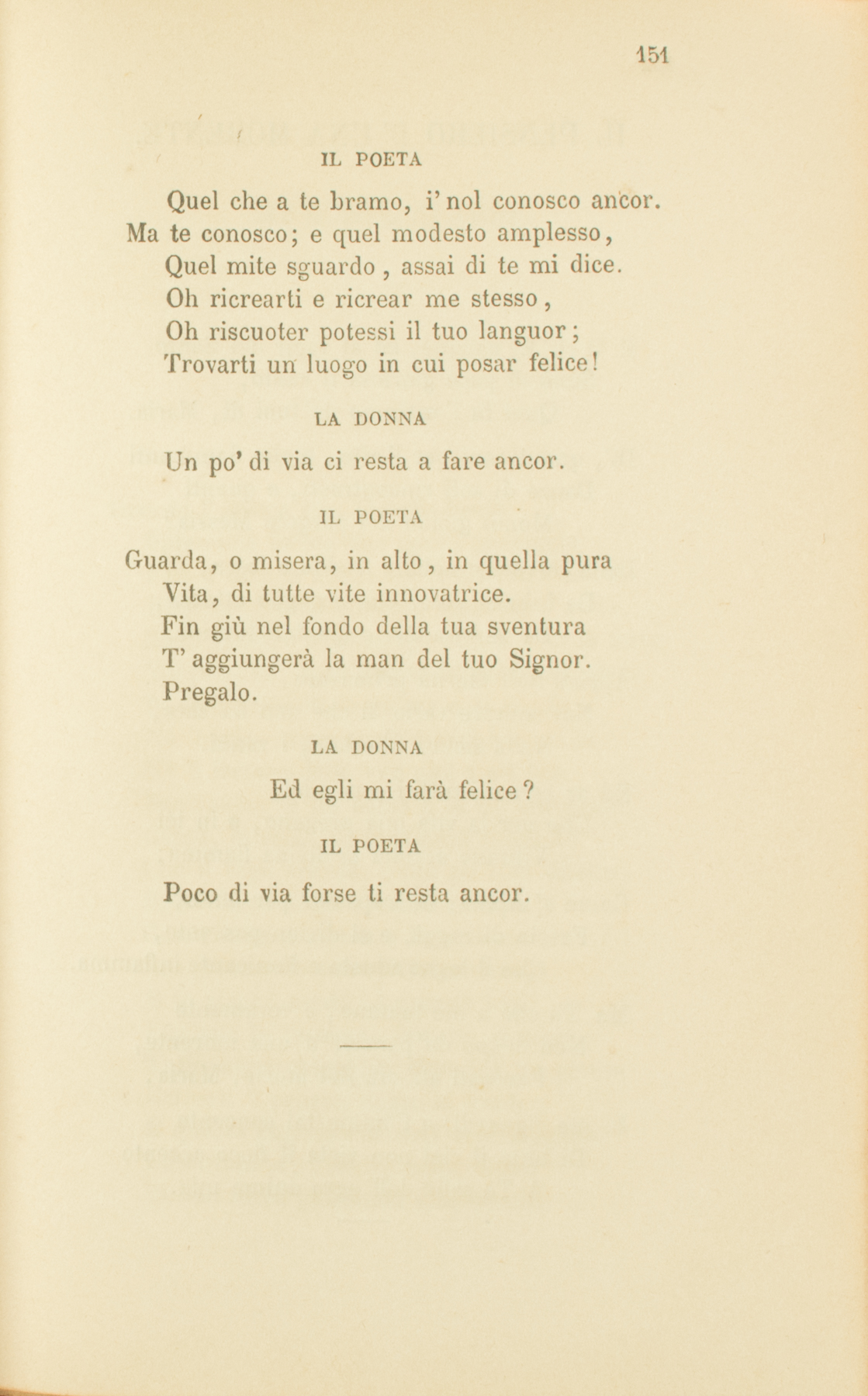 IL POETAGuarda, o misera, in alto, in quella puraVita, di tutte vite innovatrice.Fin giù nel fondo della tua sventuraT’aggiungerà la man del tuo Signor.Pregalo. LA DONNAEd egli mi farà felice?IL POETAPoco di via forse ti resta ancor.