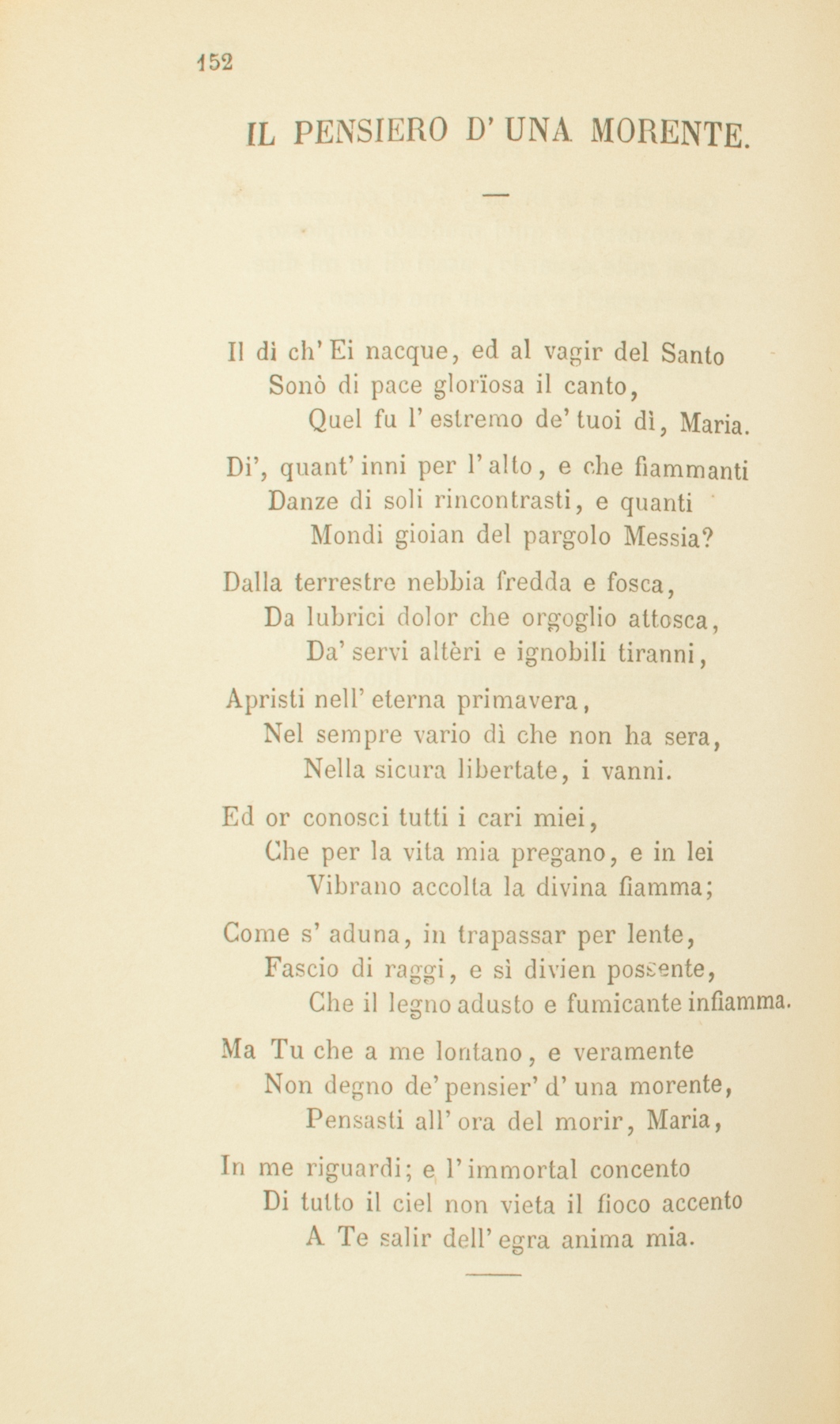 Il dì ch’ Ei nacque, ed al vagir del SantoSonò di pace glorïosa il canto,Quel fu l’estremo de’ tuoi dì, Maria.Di’, quant’ inni per l’alto, e che fiammantiDanze di soli rincontrasti, e quantiMondi gioian del pargolo Messia?Dalla terrestre nebbia fredda e fosca,Da lubrici dolor che orgoglio attosca,Da’ servi altèri e ignobili tiranni,Apristi nell’eterna primavera,Nel sempre vario dì che non ha sera,Nella sicura libertate, i vanni.Ed or conosci tutti i cari miei,Che per la vita mia pregano, e in leiVibrano accolta la divina fiamma;Come s’aduna, in trapassar per lente,Fascio di raggi, e sì divien possente,Che il legno adusto e fumicante infiamma.Ma Tu che a me lontano, e veramenteNon degno de’ pensier’ d’una morente,Pensasti all’ora del morir, Maria,In me riguardi; e l’immortal concentoDi tutto il ciel non vieta il fioco accentoA Te salir dell’egra anima mia.