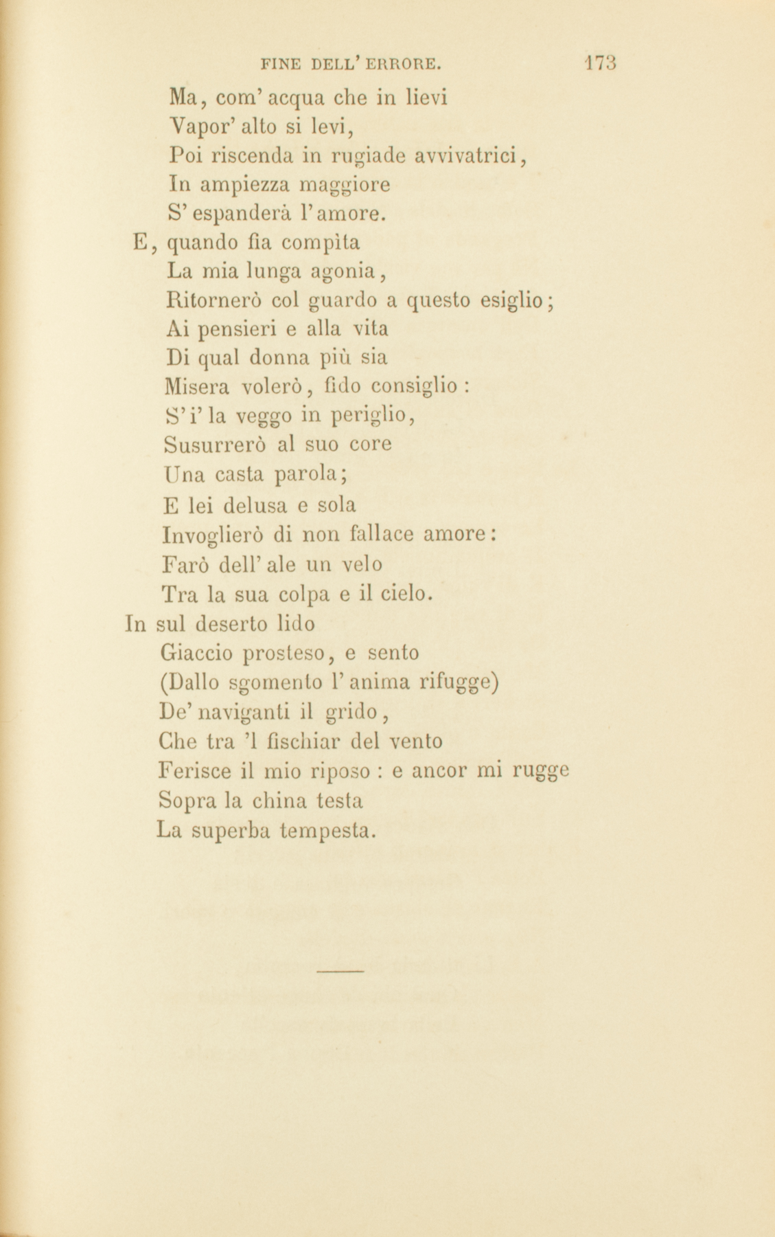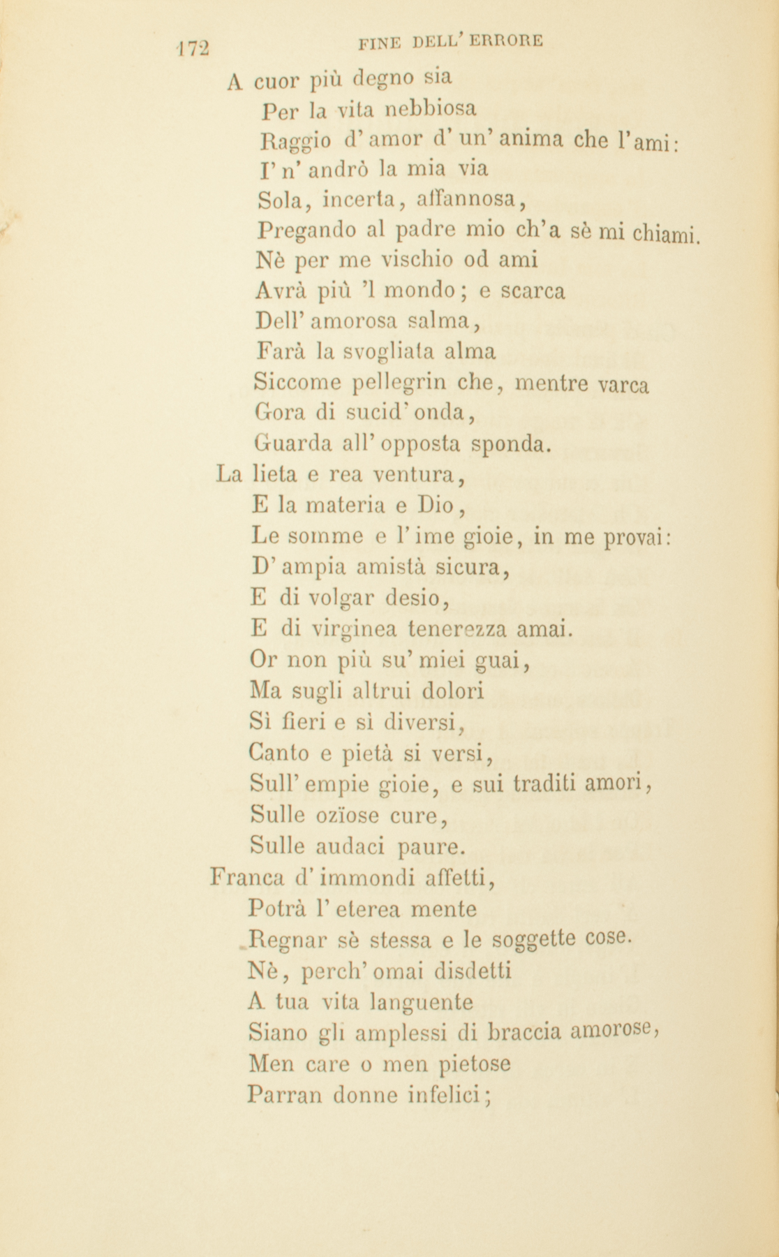 Oh di timida spemeInfiammati desiri,Oh ’l pregar del silenzio e del sorriso,Oh d’un gaudio che gemeInvocati martiri,Oh ’n mezzo ai baci il mirar lungo e fiso;Oh ’l pensier che, divisoD’ogni terrena cosa,Con tutte si confonde,Oh lacrime fecondeD’alti concetti all’anima pietosa,A voi l’egro cor mioMuore, e vi dice addio.Troppo sprecai la vita;E, pien del mio desiro,Scarsa accolsi pietà de’ mali altrui.Or Iddio mi rinvitaPer la via del sospiroAll’amor ch’ogni cosa abbraccia in lui.A’ veri danni tuiVolgi, misero, il core.L’inopia è alle tue porte;Giace in vili ritorteItalia; e forse il tuo padre si muore,E in cerca di te volaL’ultima tua parola.A cuor più degno siaPer la vita nebbiosaRaggio d’amor d’un’anima che l’ami:I’ n’andrò la mia viaSola, incerta, affannosa,Pregando al padre mio ch’a sè mi chiami.Nè per me vischio od amiAvrà più ’l mondo; e scarcaDell’amorosa salma,Farà la svogliata almaSiccome pellegrin che, mentre varcaGora di sucid onda,Guarda all’opposta sponda.La lieta e rea ventura,E la materia e Dio,Le somme e l’ime gioie, in me provai:D’ampia amistà sicura,E di volgar desio,E di virginea tenerezza amai.Or non più su’ miei guai,Ma sugli altrui doloriSì fieri e sì diversi,Canto e pietà si versi,Sull’empie gioie, e sui traditi amori,Sulle ozïose cure,Sulle audaci paure.Franca d’immondi affetti,Potrà l’eterea menteRegnar sè stessa e le soggette cose.Nè, perch’omai disdettiA tua vita languenteSiano gli amplessi di braccia amorose,Men care o men pietoseParran donne infelici;Ma com’acqua che in lieviVapor’alto si levi,Poi riscenda in rugiade avvivatrici,In ampiezza maggioreS’espanderà l’amore.E, quando fia compìtaLa mia lunga agonia,Ritornerò col guardo a questo esiglio;Ai pensieri e alla vitaDi qual donna più siaMisera volerò, fido consiglio:S’i’ la veggo in periglio,Sussurrerò al suo coreUna casta parola;E lei delusa e solaInvoglierò di non fallace amore:Farò dell’ale un veloTra la sua colpa e il cielo.In sul deserto lidoGiaccio prosteso, e sento(Dallo sgomento l’anima rifugge)De’ naviganti il grido,Che tra ‘l fischiar del ventoFerisce il mio riposo: e ancor mi ruggeSopra la china testaLa superba tempesta.