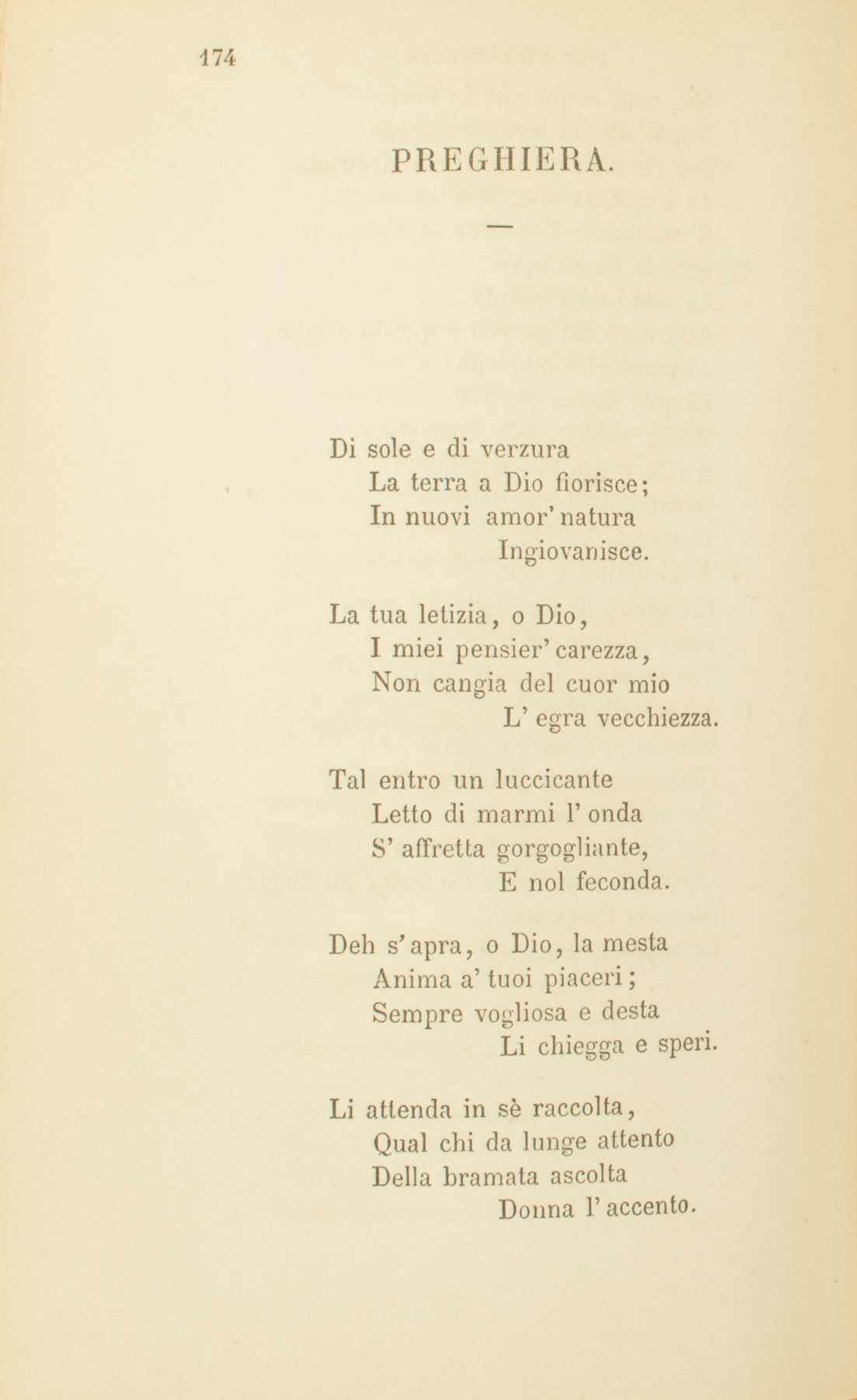 Di sole e di verzuraLa terra a Dio fiorisce;In nuovi amor’ naturaIngiovanisce.La tua letizia, o Dio,I miei pensier’ carezza,Non cangia del cuor mioL’egra vecchiezza.Tal entro un luccicanteLetto di marmi l’ondaS’affretta gorgogliante,E nol feconda.Deh s’aspra, o Dio, la mestaAnima a’ tuoi piaceri;Sempre vogliosa e destaLi chiegga e speri.Li attenda in sè raccolta,Qual chi da lunge attentoDella bramata ascoltaDonna l’accento.Tutte d’amor sian segniLe cose: e il verno, il fiore,La notte, il dì m’insegniPensar l’amore.Così da molti cliviA rallegrar s’affrettaL’acqua di molti riviL’umil valletta.Poggi di cosa in cosa,Nè l’impeto gentileMai cessi l’amorosaAnima umile.E se alle stanche piumeLubrico amor s’implica,Ella nell’alto lumeS’affisi, e dica:Se cedi al tuo desire,D’ogni pensato oggettoPiù non potrai fruireTanto diletto.Quant’aspro sia sapraiD’un solo amor l’impero;Mille dolori avraiDa un sol pensiero.Credi al vigor natio,E libera e solettaVola, mirando a Dio,Di vetta in vetta.