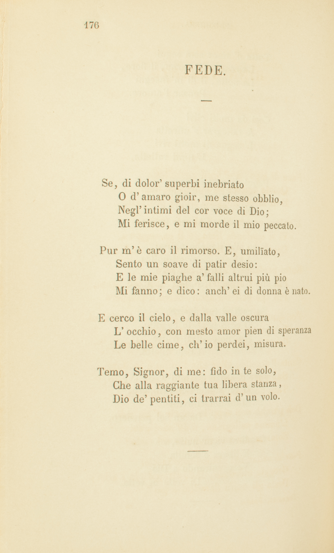 Se, di dolor’ superbi inebriatoO d’amaro gioir, me stesso obblio,Negl’intimi del cor voce di Dio;Mi ferisce, e mi morde il mio peccato.Pur m’è caro il rimorso. E, umilïato,Sento un soave di patir desio:E le mie piaghe a’ falli altrui più pioMi fanno; e dico: anch’ei di donna è nato.E cerco il cielo, e dalla valle oscuraL’occhio, con mesto amor pien di speranzaLe belle cime, ch’io perdei, misura.Temo, Signor, di me: fido in te solo,Che alla raggiante tua libera stanza,Dio de’ pentiti, ci trarrai d’un volo.