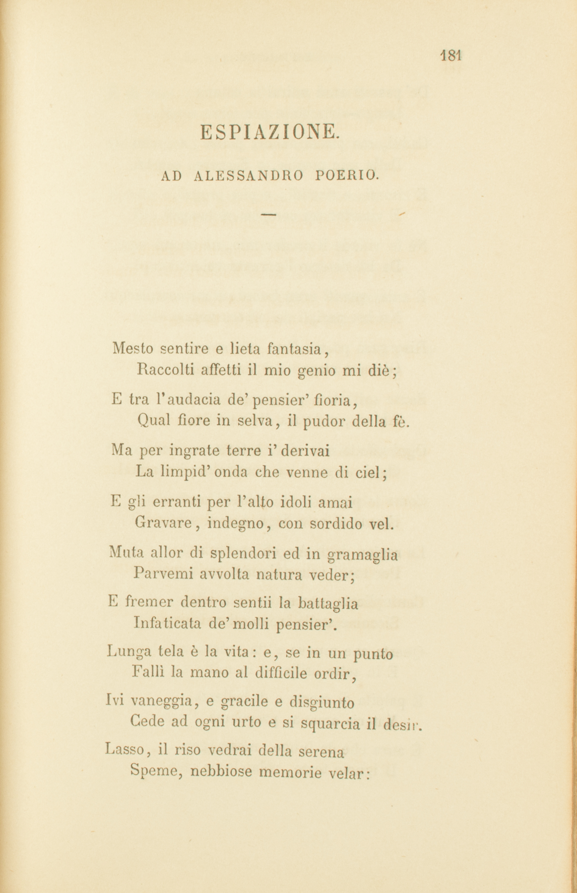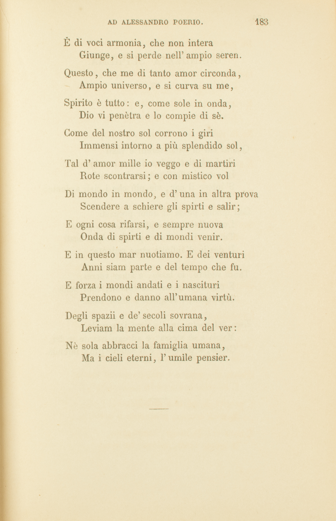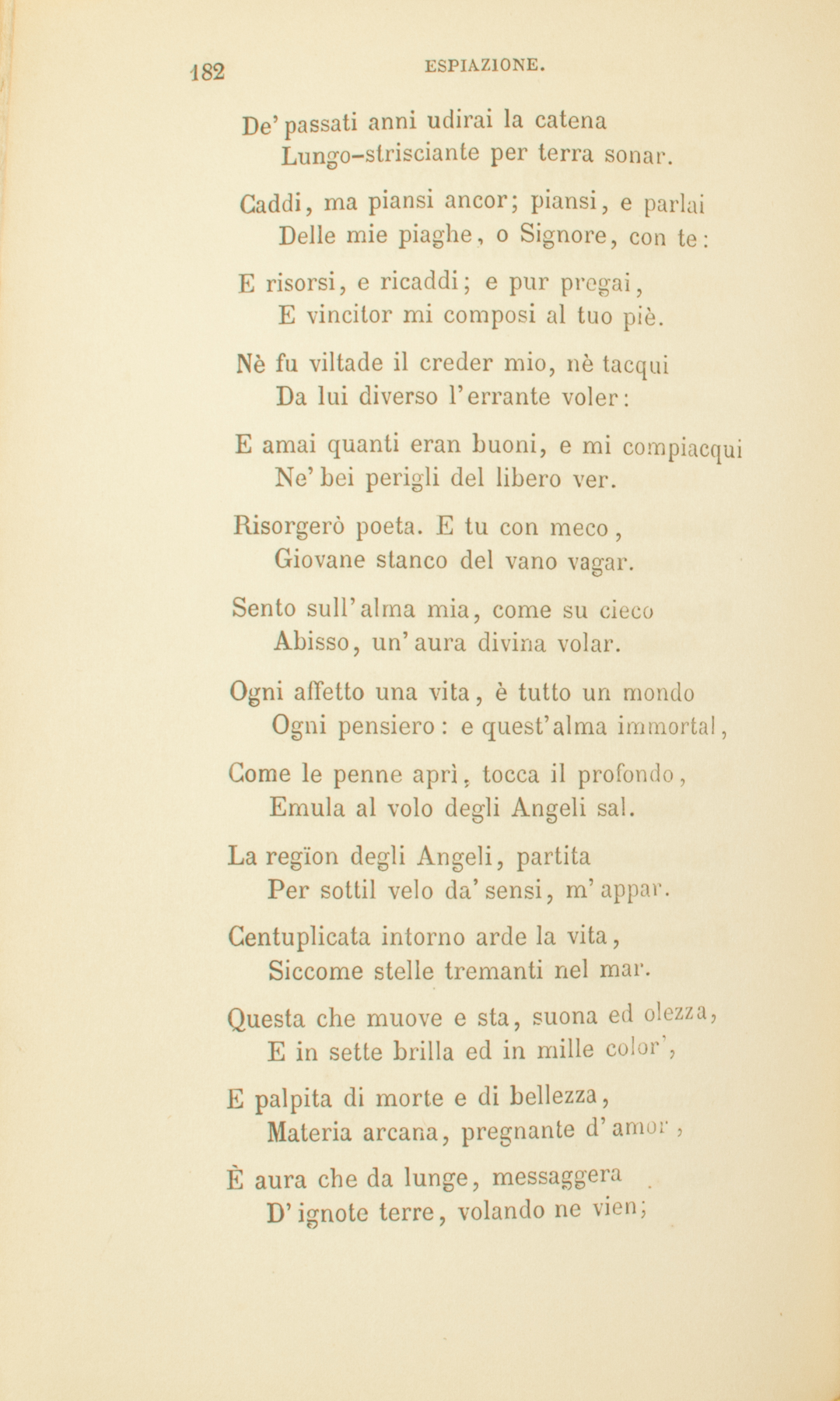Mesto sentire e lieta fantasia,Raccolti affetti il mio genio mi diè;E tra l’audacia de’ pensier’ fioria,Qual flore in selva, il pudor della fè.Ma per ingrate terre i’ derivaiLa limpid’onda che venne di ciel;E gli erranti per l’alto idoli amaiGravare, indegno, con sordido vel.Muta allor di splendori ed in gramagliaParvemi avvolta natura veder;E fremer dentro sentii la battagliaInfaticata de’ molli pensier’.Lunga tela è la vita: e, se in un puntoFallì la mano al difficile ordir,Ivi vaneggia, e gracile e disgiuntoCede ad ogni urto e si squarcia il desir.Lasso, il riso vedrai della serenaSpeme, nebbiose memorie velar:De’ passati anni udirai la catenaLungo-strisciante per terra sonar.Caddi, ma piansi ancor; piansi, e parlaiDelle mie piaghe, o Signore, con te:E risorsi, e ricaddi; e pur pregai,E vincitor mi composi al tuo piè.Nè fu viltade il creder mio, nè tacquiDa lui diverso l’errante voler:E amai quanti eran buoni, e mi compiacquiNe’ bei perigli del libero ver.Risorgerò poeta. E tu con meco,Giovane stanco del vano vagar.Sento sull’alma mia, come su ciecoAbisso, un’aura divina volar.Ogni affetto una vita, è tutto un mondoOgni pensiero: e quest’alma immortal,Come le penne aprì, tocca il profondo,Emula al volo degli Angeli sal.La regïon degli Angeli, partitaPer sottil velo da’ sensi, m’appar.Centuplicata intorno arde la vita,Siccome stelle tremanti nel mar.Questa che muove e sta, suona ed olezza,E in sette brilla ed in mille color’,E palpita di morte e di bellezza,Materia arcana, pregnante d’amor,È aura che da lunge, messaggeraD’ignote terre, volando ne vien;È di voci armonia, che non interaGiunge, e si perde nell’ampio seren.Questo, che me di tanto amor circonda,Ampio universo, e si curva su me,Spirito è tutto: e, come sole in onda,Dio vi penètra e lo compie di sè.Come del nostro sol corrono i giriImmensi intorno a più splendido sol,Tal d’amor mille io veggo e di martiriRote scontrarsi; e con mistico volDi mondo in mondo, e d’una in altra provaScendere a schiere gli spirti e salir;E ogni cosa rifarsi, e sempre nuovaOnda di spirti e di mondi venir.E in questo mar nuotiamo. E dei venturiAnni siam parte e del tempo che fu.E forza i mondi andati e i nascituriPrendono e danno all’umana virtù.Degli spazii e de’ secoli sovrana,Leviam la mente alla cima del ver:Nè sola abbracci la famiglia umana,Ma i cieli eterni, l’umile pensier.