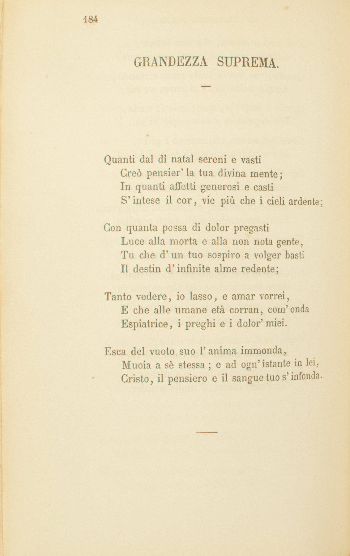 Quanti dal dì natal sereni e vastiCreò pensier’ la tua divina mente;In quanti affetti generosi e castiS’intese il cor, vie più che i cieli ardente;Con quanta possa di dolor pregastiLuce alla morta e alla non nota gente,Tu che d’un tuo sospiro a volger bastiIl destin d’infinite alme redente;Tanto vedere, io lasso, e amar vorrei,E che alle umane età corran, com’ondaEspiatrice, i preghi e i dolor’ miei.Esca del vuoto suo l’anima immonda,Muoia a sè stessa; e ad ogn’istante in lei,Cristo, il pensiero e il sangue tuo s’infonda.