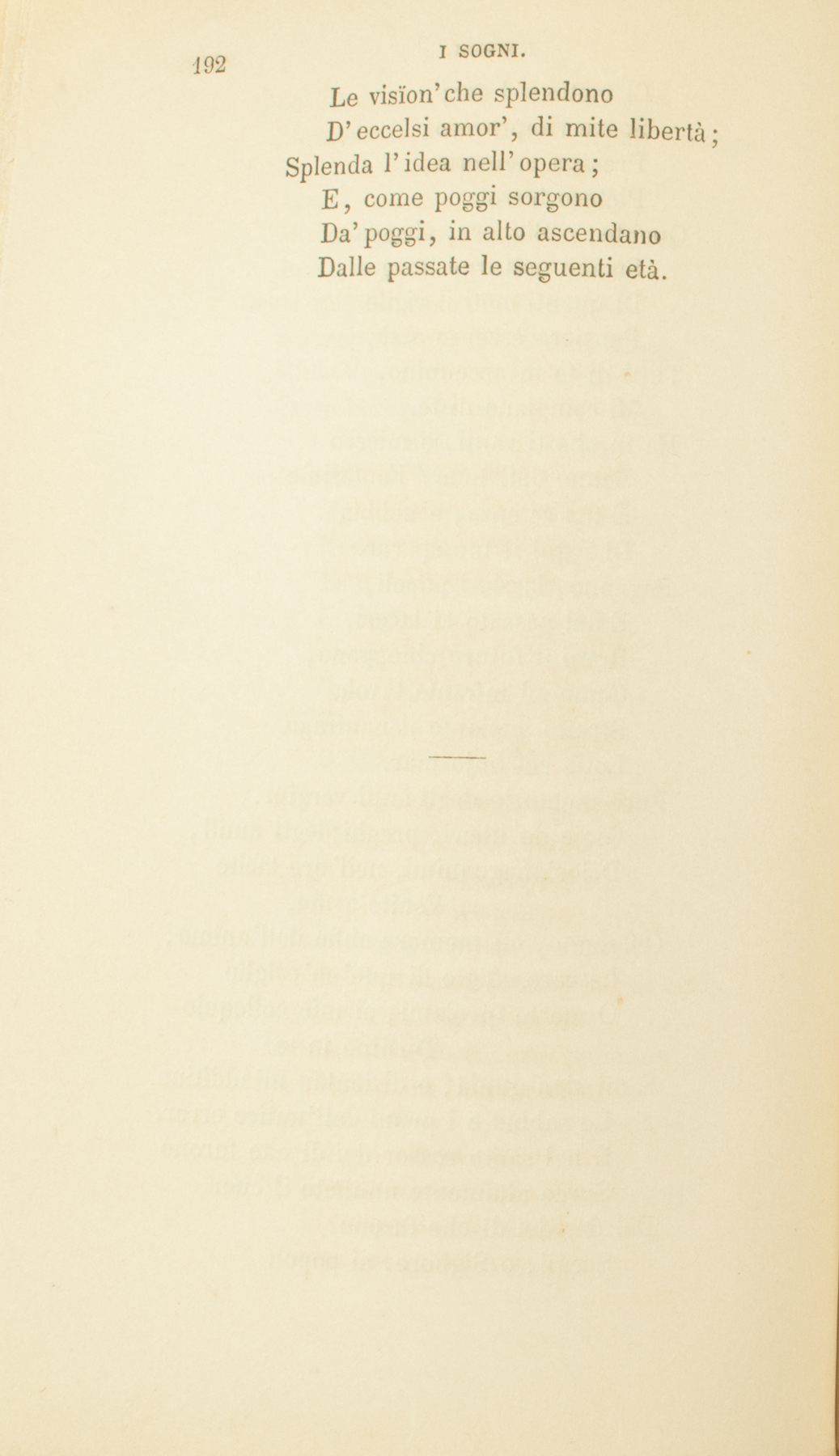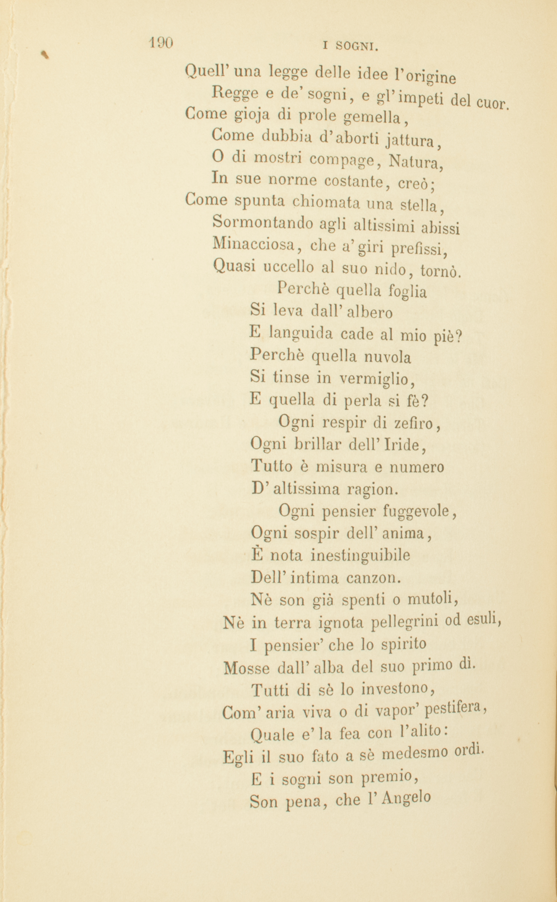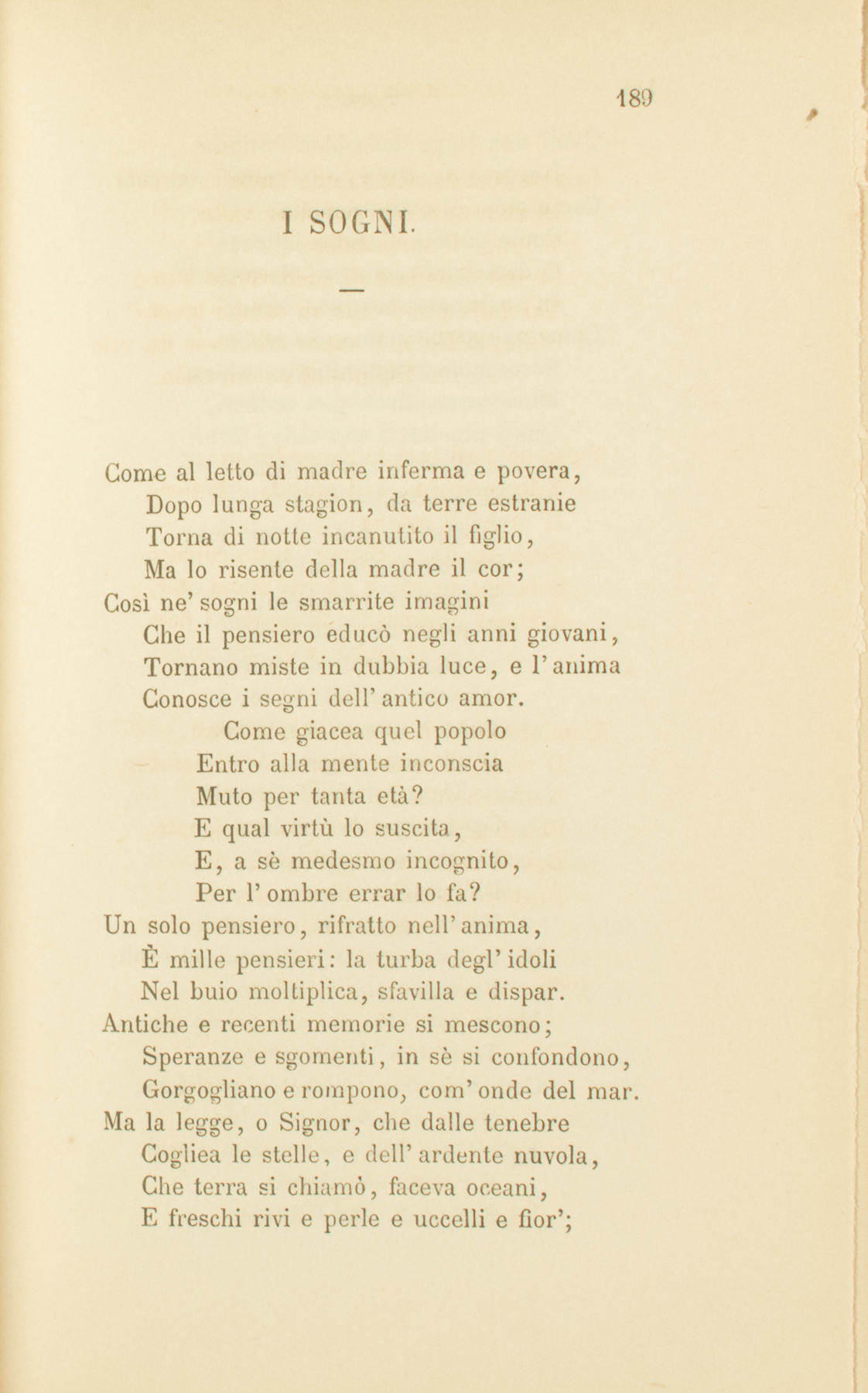 Come al letto di madre inferma e povera,Dopo lunga stagion, da terre estranieTorna di notte incanutito il figlio,Ma lo risente della madre il cor;Così ne’ sogni le smarrite imaginiChe il pensiero educò negli anni giovani,Tornano miste in dubbia luce, e l’animaConosce i segni dell’antico amor.Come giacea quel popoloEntro alla mente inconsciaMuto per tanta età?E qual virtù lo suscita,E, a sè medesmo incognito,Per l’ombre errar lo fa?Un solo pensiero, rifratto nell’anima,È mille pensieri: la turba degl’idoliNel buio moltiplica, sfavilla e dispar.Antiche e recenti memorie si mescono;Speranze e sgomenti, in sè si confondono,Gorgogliano e rompono, com’onde del mar.Ma la legge, o Signor, che dalle tenebreCogliea le stelle, e dell’ardente nuvola,Che terra si chiamò, faceva oceani,E freschi rivi e perle e uccelli e fior’;Quell’una legge delle idee l’origineRegge e de’ sogni, e gl’impeti del cuor.Come gioja di prole gemella,Come dubbia d’aborti jattura,O di mostri compage, Natura,In sue norme costante, creò;Come spunta chiomata una stella,Sormontando agli altissimi abissiMinacciosa, che a’ giri prefissi,Quasi uccello al suo nido, tornò.Perchè quella fogliaSi leva dall’alberoE languida cade al mio piè?Perchè quella nuvolaSi tinse in vermiglio,E quella di perla si fè?Ogni respir di zefiro,Ogni brillar dell’Iride,Tutto è misura e numeroD’altissima ragion.Ogni pensier fuggevole,Ogni sospir dell’anima,È nota inestinguibileDell’intima canzon.Nè son già spenti o mutoli,Nè in terra ignota pellegrini od esuli,I pensier’ che lo spiritoMosse dall’alba del suo primo dì.Tutti di sè lo investono,Com’aria viva o di vapor’ pestifera,Quale e’ la fea con l’alito:Egli il suo fato a sè medesmo ordì.E i sogni son premio,Son pena, che l’AngeloCi mette nel cor;Soave rimprovero,Presaga memoria,Pietoso terror.Quante, o Signore, aleggianoSu me notturne imagini,Di quanti moti il vigilePensiero è senso a sè,Tutti di te m’accennino,Mi compiano di te.Ma in che ti vanti, o miseroSenno dell’uom? FantasimeÈ tua scienza, e nebbiaDi sogni il tuo sperar.Sognano, lassi, i popoli,E del passato ai laceriBrani il futuro chieggono,Come ad infranta tavolaStretto anelante il naufragoLotta col bujo mar.Pure memorie degli anni vergini,Gioje de’liberi, preghi degli umili,Dolor’ magnanimi, nell’ore taciteVenite a me.Oh sonno, oh memore oblìo dell’anima,Le care effigie di que’ ch’esiglioO morte involami, al mio colloquioTornino in te.E mi sian guida, e di lontan m’additinoLe sabbie e i pruni dell’antico error.E nel santo rossor dei dì che furonoSorga altamente umilïato il cuor.Dal fior dei dì che furonoScegli, o Signore, ai popoliLe visïon’ che splendonoD’eccelsi amor’, di mite libertà;Splenda l’idea nell’opera;E, come poggi sorgonoDa’ poggi, in alto ascendanoDalle passate le seguenti età.