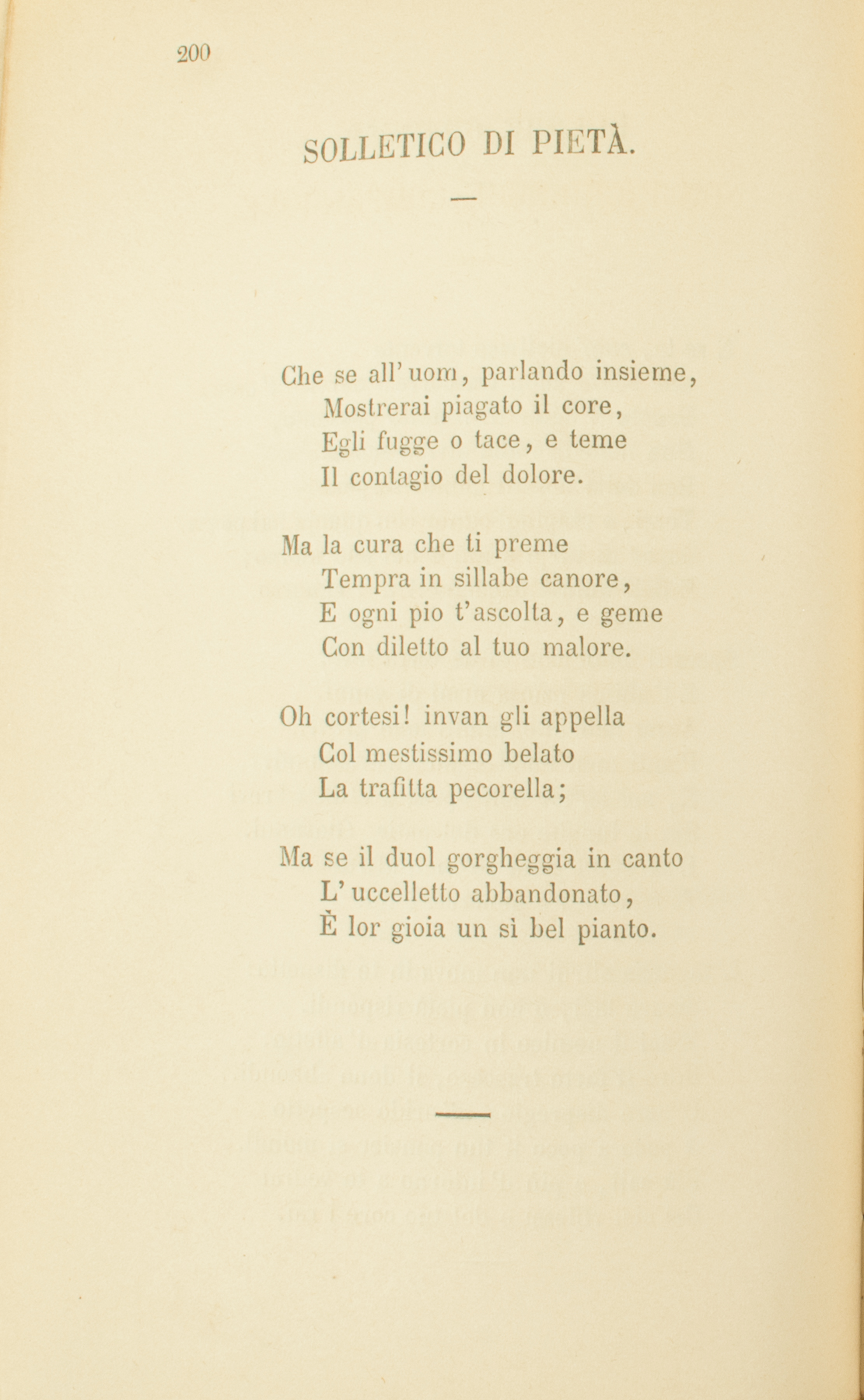 Che se all’uom, parlando insiemeMostrerai piagato il core,Egli fugge o tace, e temeIl contagio del dolore.Ma la cura che ti premeTempra in sillabe canore,E ogni pio t’ascolta, e gemeCon diletto al tuo malore.Oh cortesi! invan gli appellaCol mestissimo belatoLa trafitta pecorella;Ma se il duol gorgheggia in cantoL’uccelletto abbandonato,È lor gioia un sì bel pianto.
