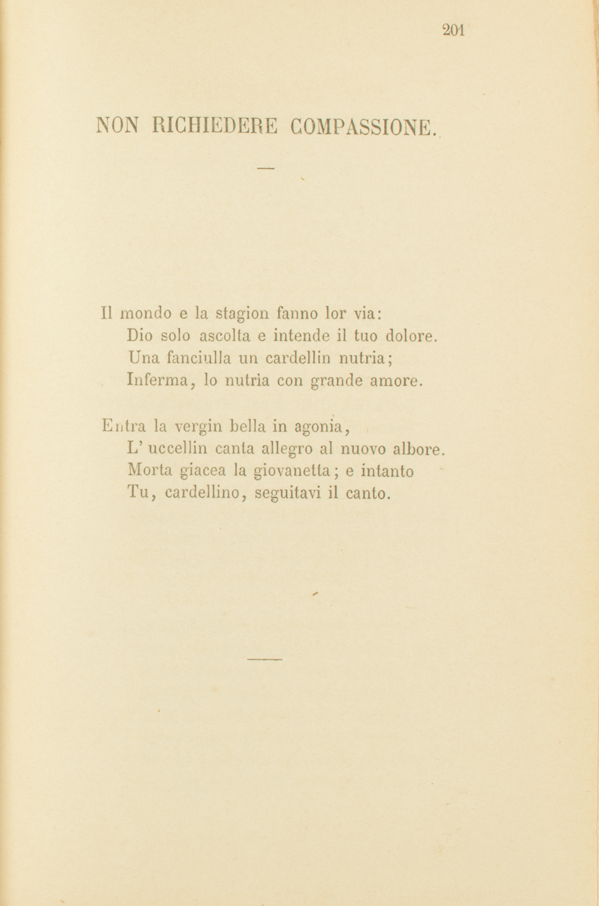 Il mondo e la stagion fanno lor via:Dio solo ascolta e intende il tuo dolore.Una fanciulla un cardellin nutria;Inferma, lo nutrìa con grande amore.Entra la vergin bella in agonia,L’uccellin canta allegro al nuovo albore.Morta giacea la giovanetta; e intantoTu, cardellino, seguitavi il canto.