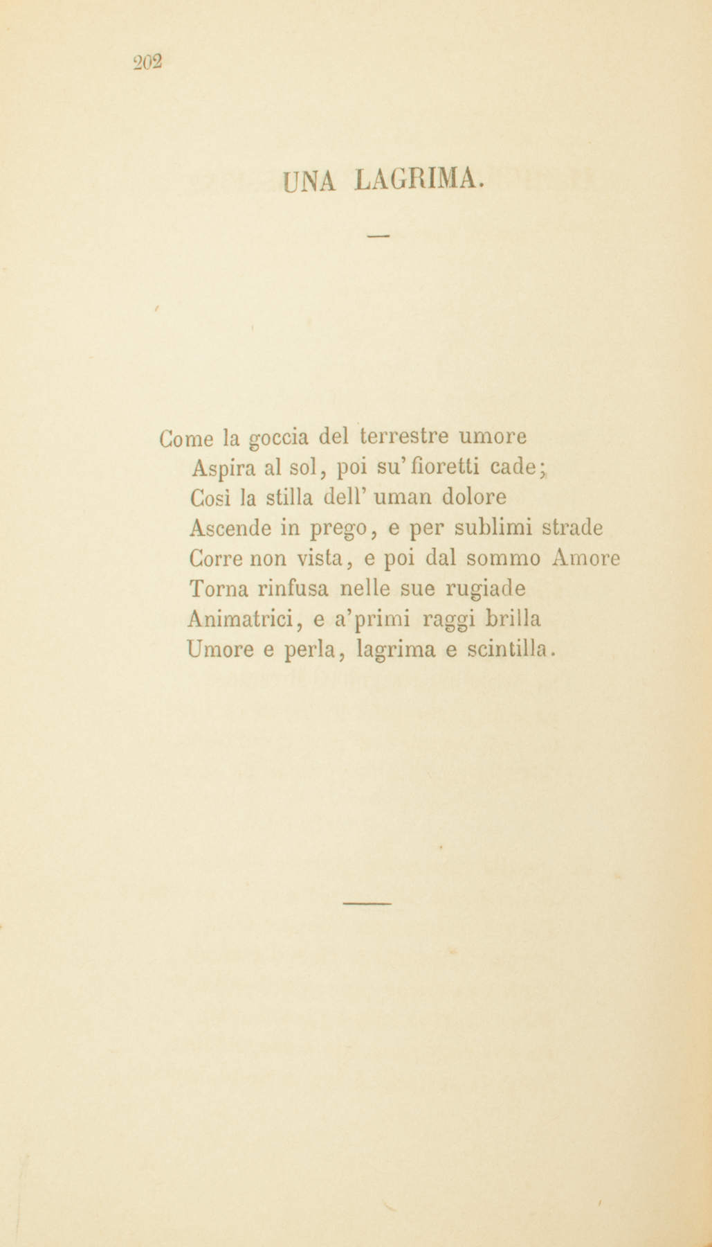 Come la goccia del terrestre umoreAspira al sol, poi su’ fioretti cade;Così la stilla dell’uman doloreAscende in prego, e per sublimi stradeCorre non vista, e poi dal sommo AmoreTorna rinfusa nelle sue rugiadeAnimatrici, e a’ primi raggi brillaUmore e perla, lagrima e scintilla.