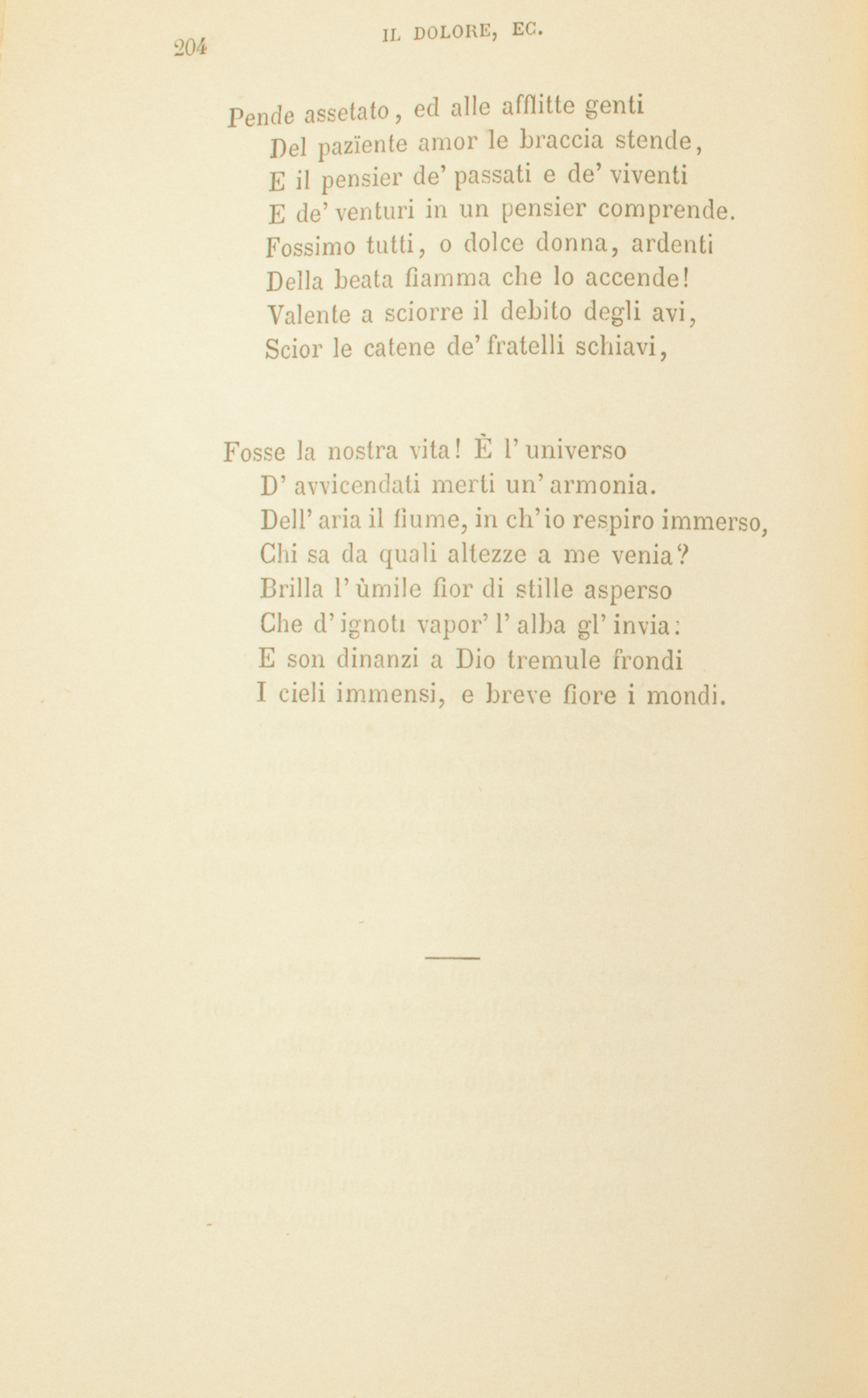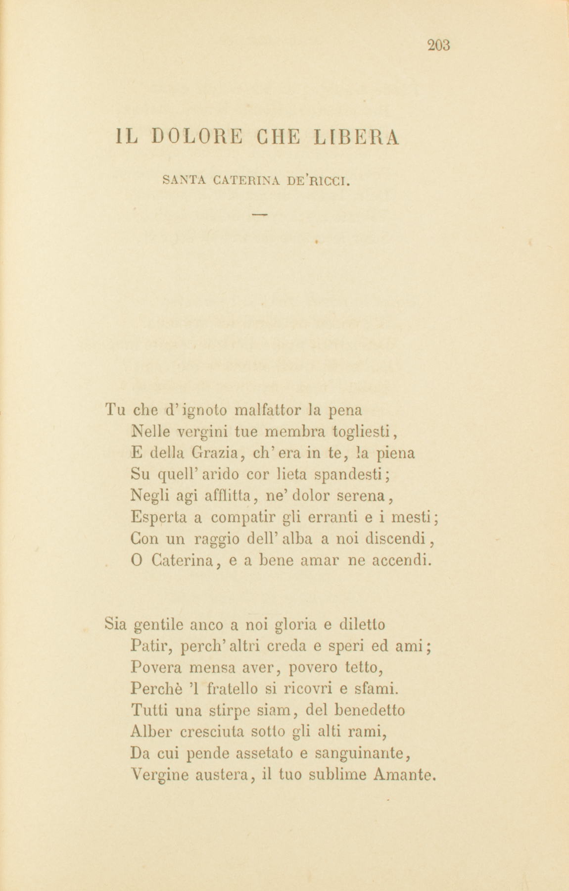 Tu che d’ignoto malfattor la penaNelle vergini tue membra togliesti,E della Grazia, ch’era in te, la pienaSu quell’arido cor lieta spandesti;Negli agi afflitta, ne’ dolor serena,Esperta a compatir gli erranti e i mesti;Con un raggio dell’alba a noi discendi,O Caterina, e a bene amar ne accendi.Sia gentile anco a noi gloria e dilettoPatir, perch’altri creda e speri ed ami;Povera mensa aver, povero tetto,Perchè ’l fratello si ricovri e sfami.Tutti una stirpe siam, del benedettoAlber cresciuta sotto gli alti rami,Da cui pende assetato e sanguinante,Vergine austera, il tuo sublime Amante.Pende assetato, ed alle afflitte gentiDel pazïente amor le braccia stende,E il pensier de’ passati e de’ viventiE de’ venturi in un pensier comprende.Fossimo tutti, o dolce donna, ardentiDella beata fiamma che lo accende!Valente a sciorre il debito degli avi,Scior le catene de’ fratelli schiavi,Fosse la nostra vita! È l’universoD’avvicendati merti un’armonia.Dell’aria il fiume, in ch’io respiro immerso,Chi sa da quali altezze a me venia?Brilla l’ùmile fior di stille aspersoChe d’ignoti vapor’ l’alba gl’invia;E son dinanzi a Dio tremule frondiI cieli immensi, e breve fiore i mondi.