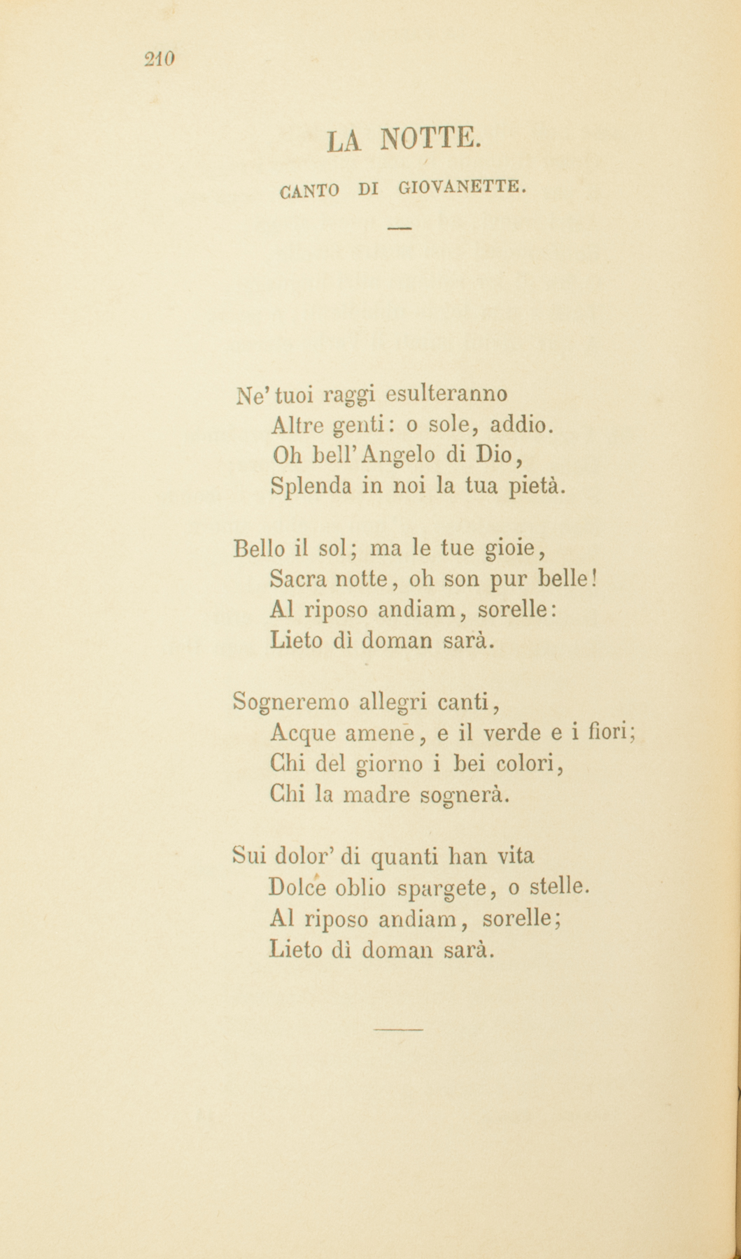 Ne’ tuoi raggi esulterannoAltre genti: o sole, addio.Oh bell’Angelo di Dio,Splenda in noi la tua pietà.Bello il sol; ma le tue gioie,Sacra notte, oh son pur belle!Al riposo andiam, sorelle:Lieto dì doman sarà.Sogneremo allegri canti,Acque amene, e il verde e i fioriChi del giorno i bei colori,Chi la madre sognerà.Sui dolor’ di quanti han vitaDolce oblio spargete, o stelle.Al riposo andiam, sorelle;Lieto dì doman sarà.