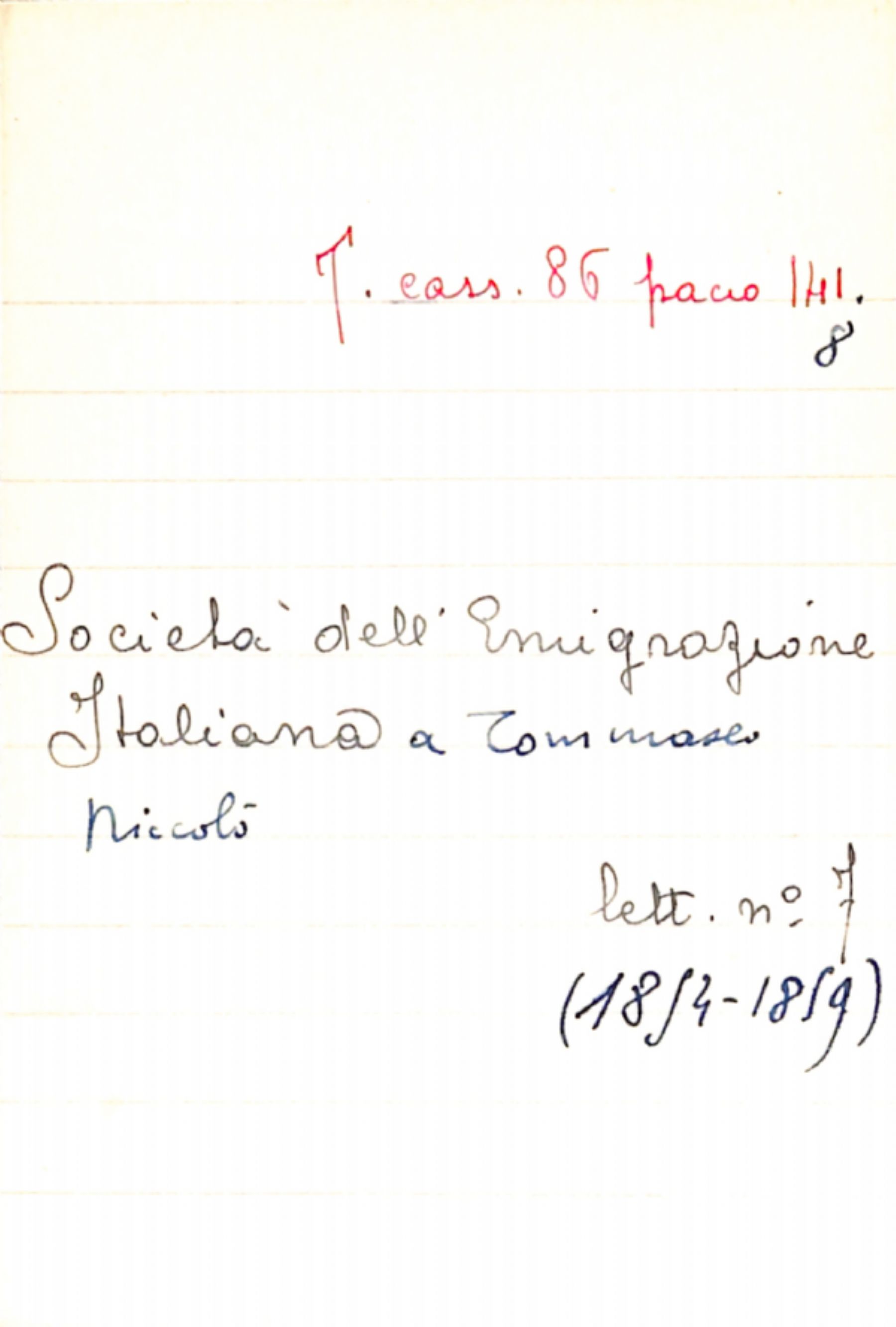 Fascicolo Società dell'Emigrazione Italiana a Tommaseo, Niccolò