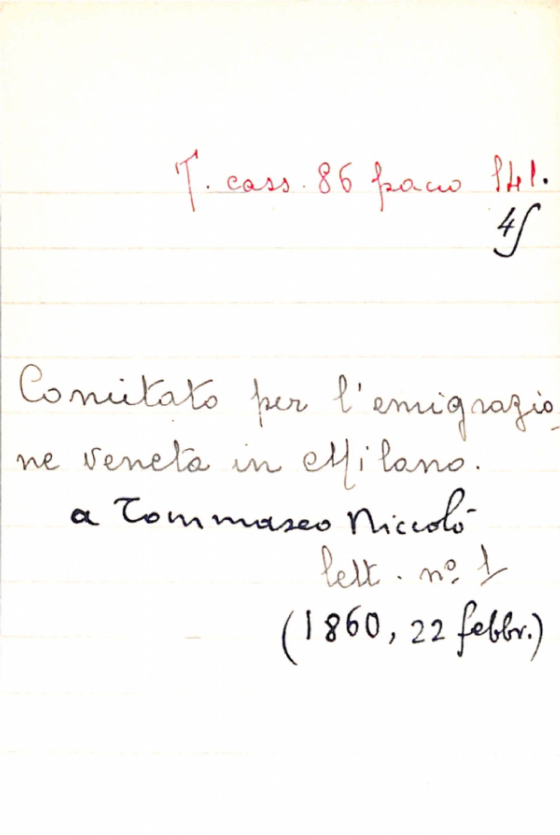 Fascicolo Comitato per l'emigrazione veneta in Milano a Tommaseo, Niccolò