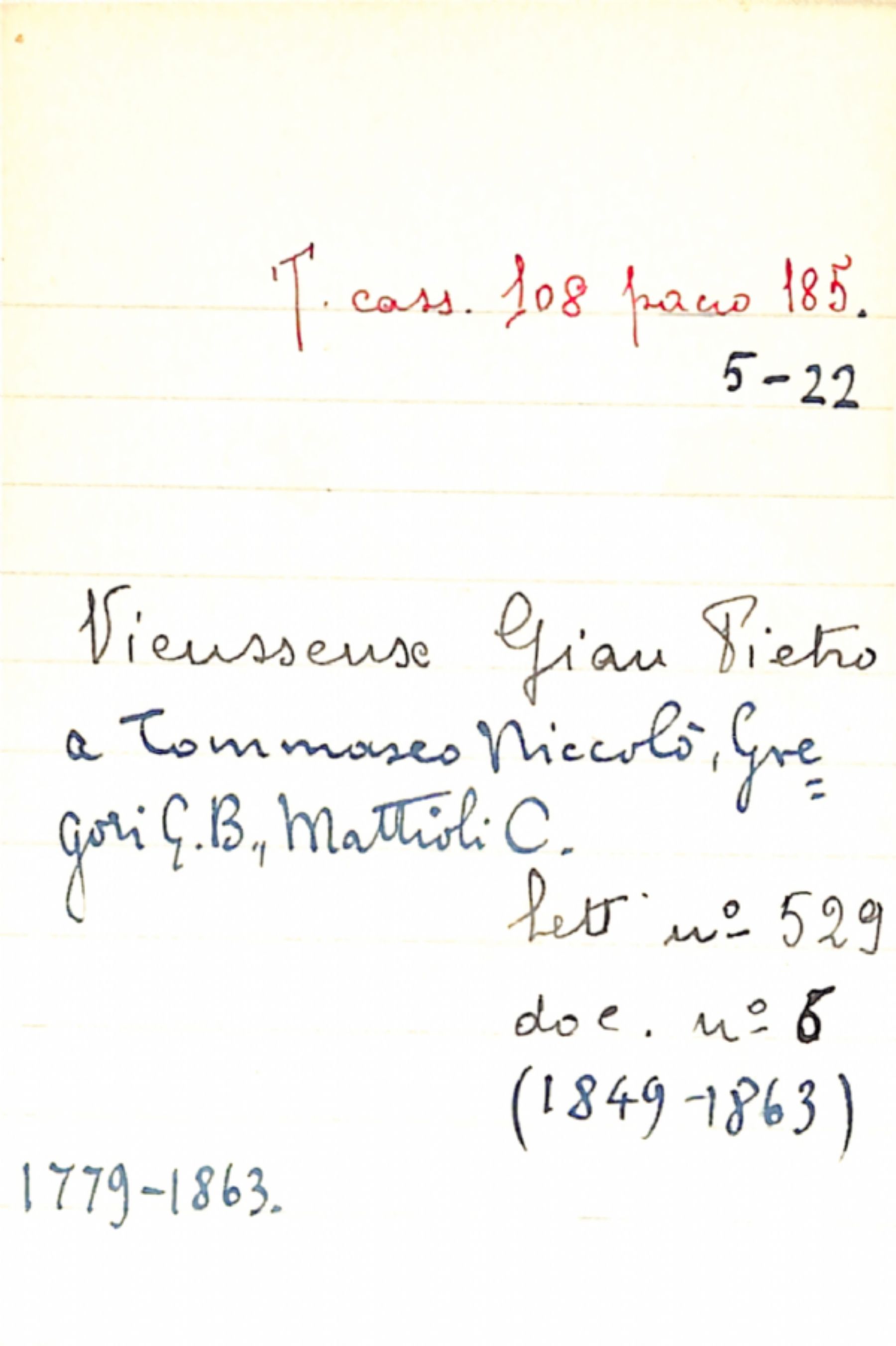 Fascicolo Vieusseux, Gian Pietro a Tommaseo, Niccolò; Gregori, G. B.; Mattioli, C.