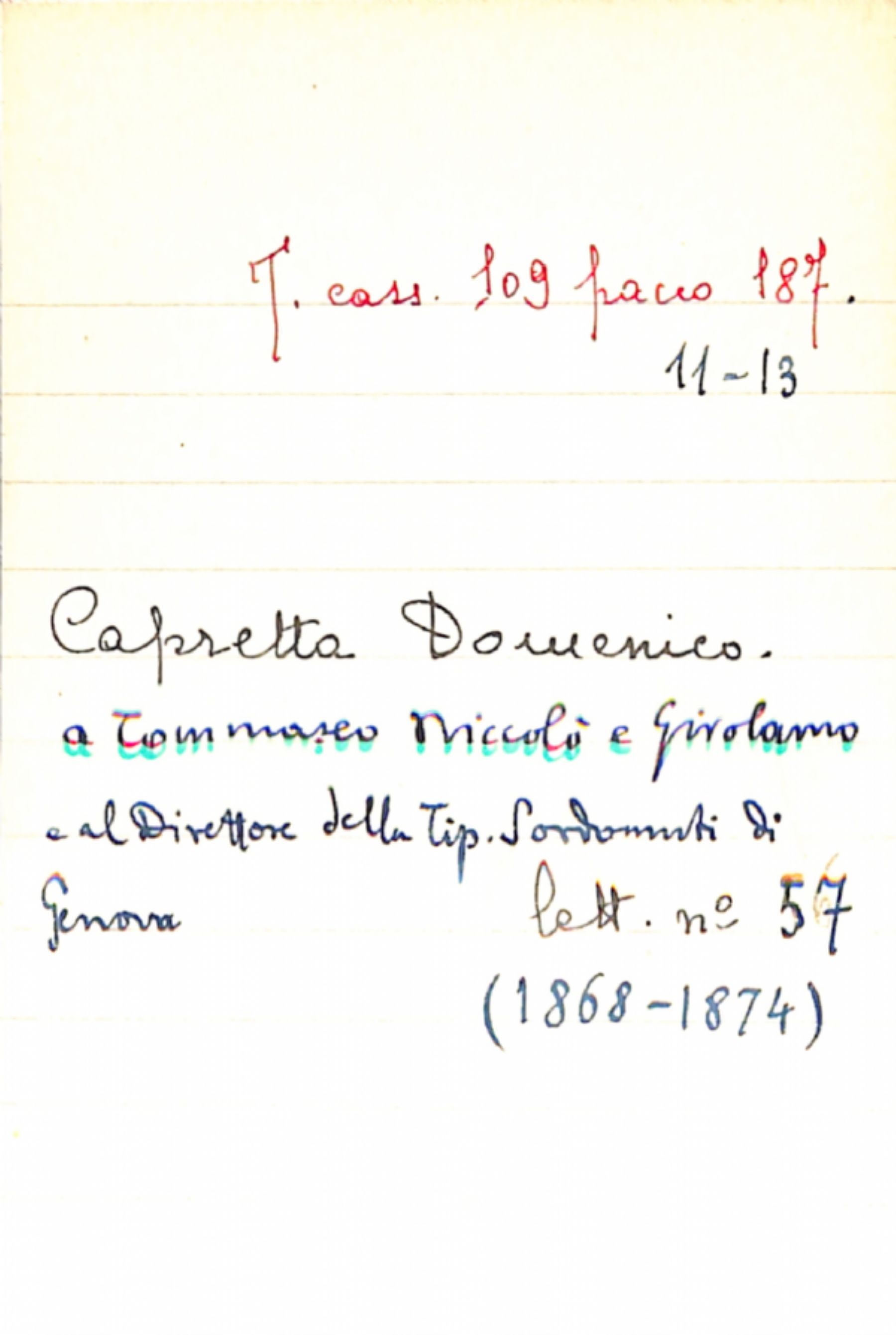 Fascicolo Capretta, Domenico a Tommaseo, Niccolò; Tommaseo, Girolamo; Direttore della Tip. Sordomuti di Genova