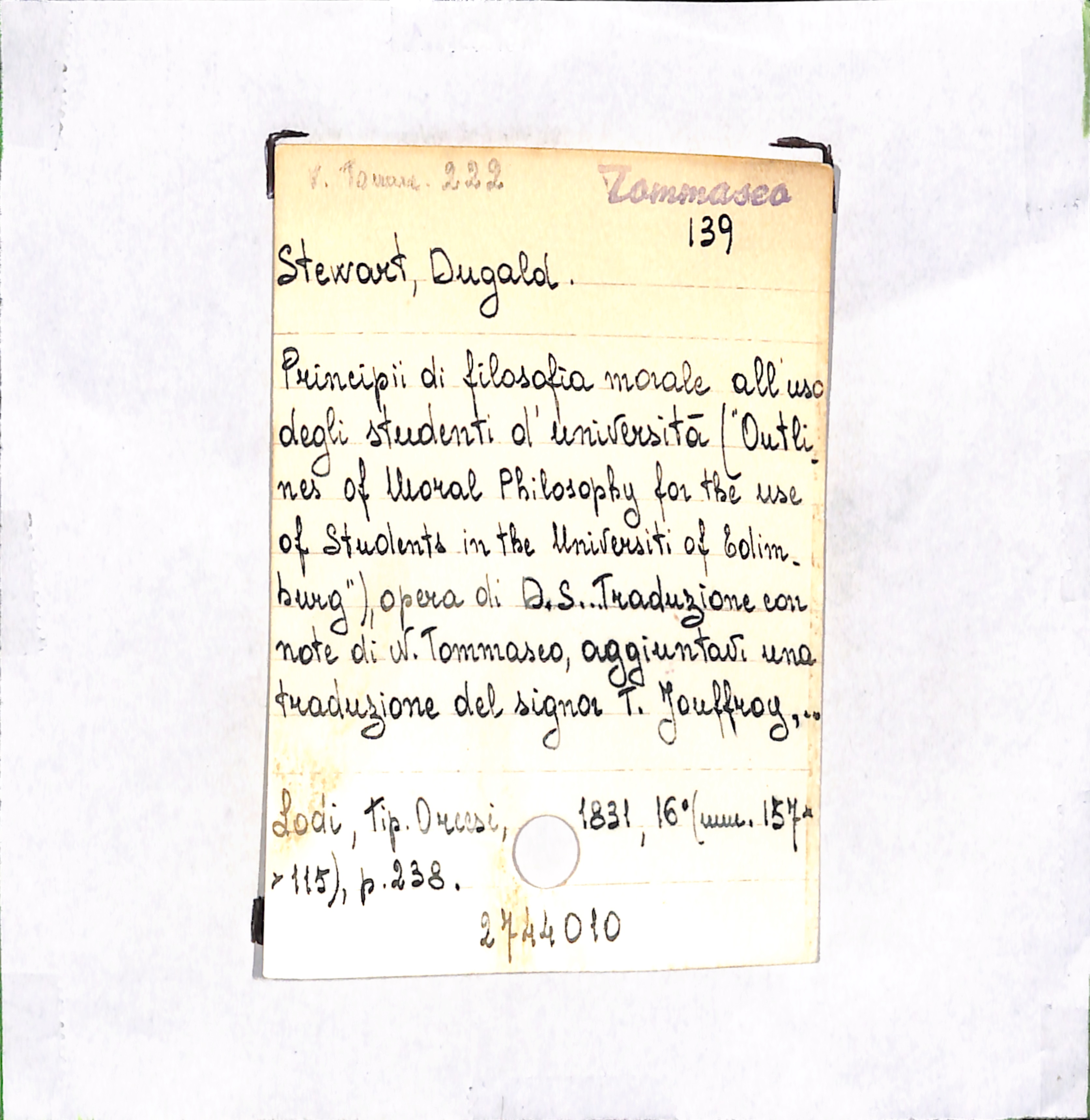 U.D. monografia Principii di filosofia morale all'uso degli studenti d'università ("Outlines of Moral Philosopy for the use of Students in the Universiti of Edimburg")