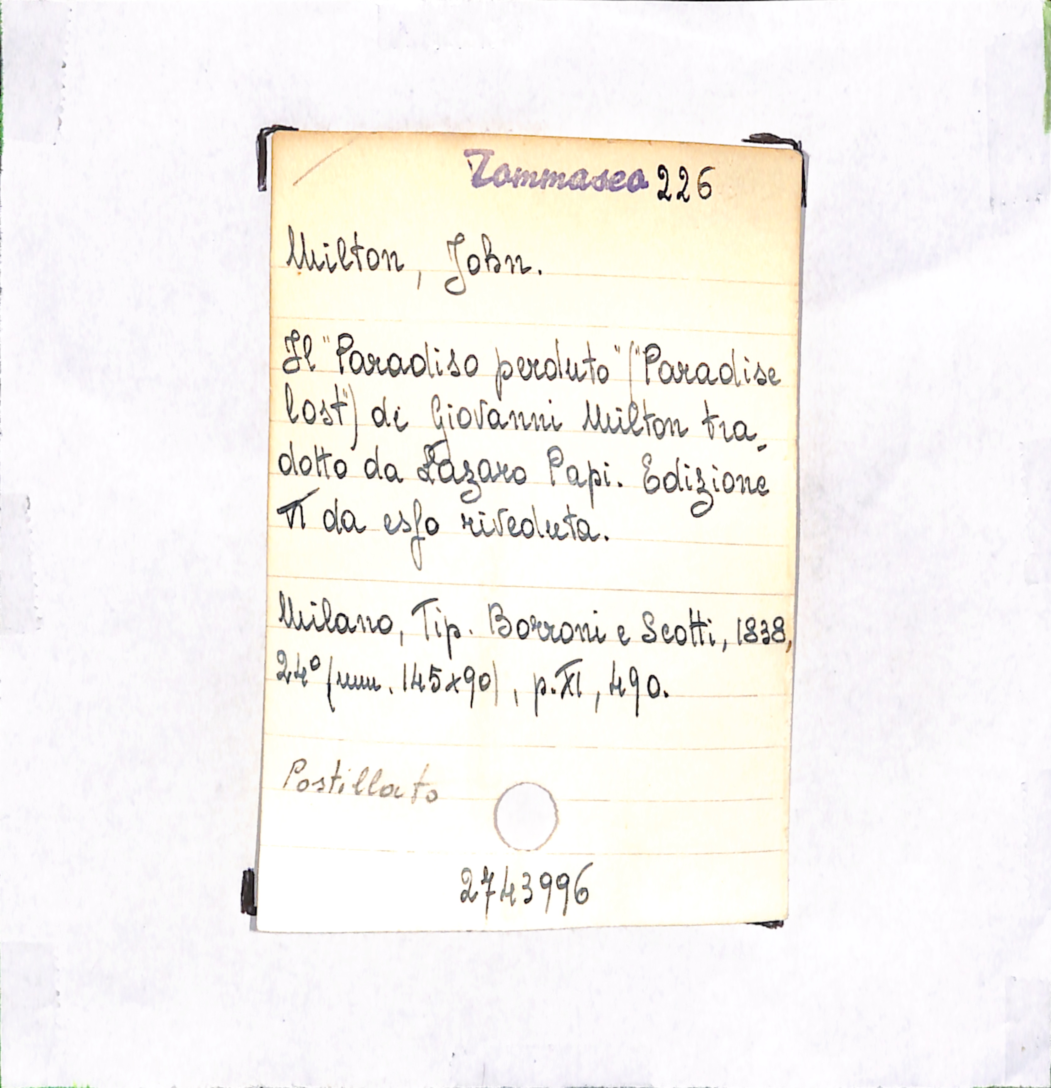 • Il "Paradiso perduto" ("Paradise lost") di Giovanni Milton tradotto da Lazzaro Papi