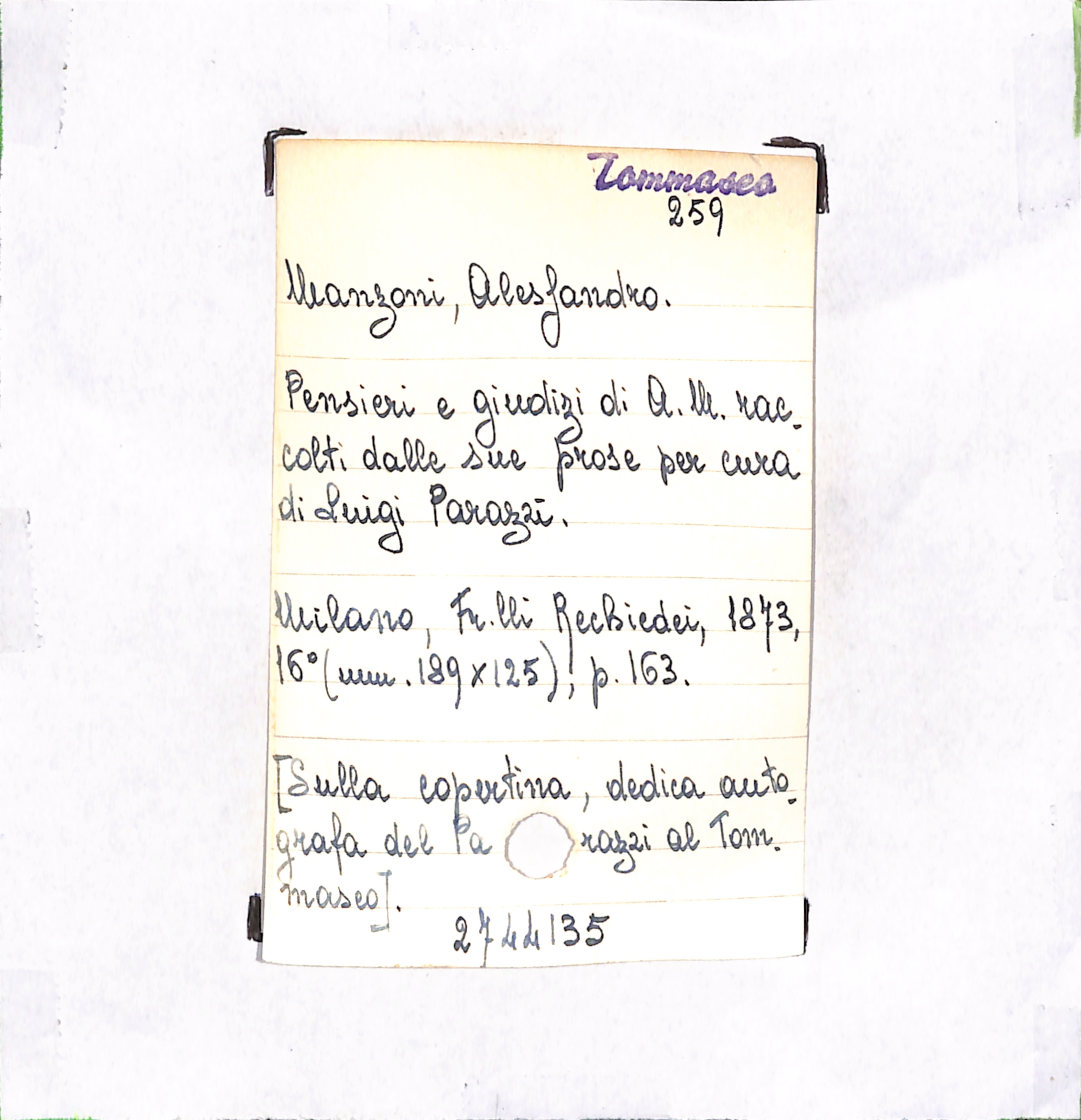 • [Sulla copertina, dedica autografa del Parazzi al Tommaseo].