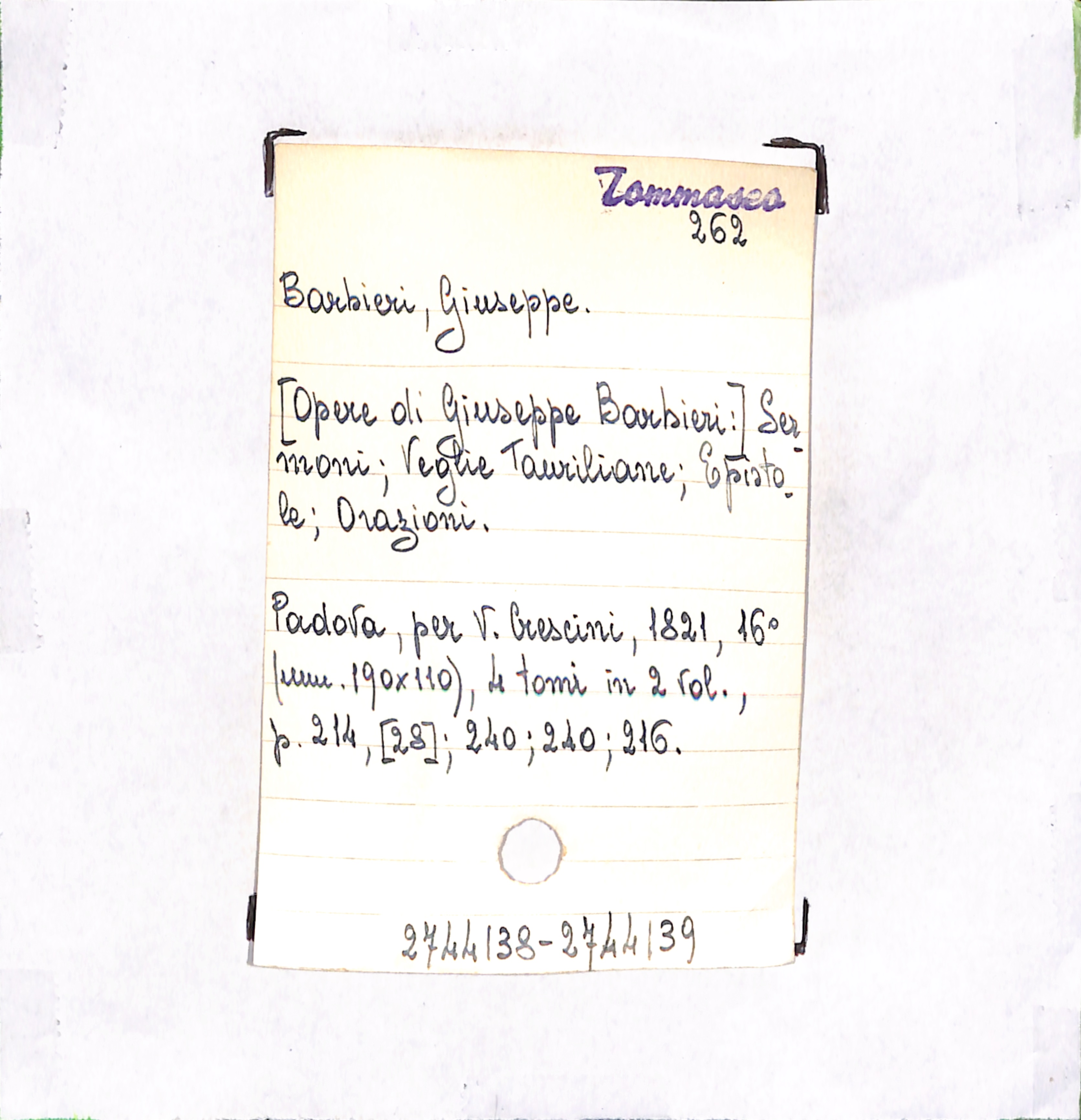 • [Opere di Giuseppe Barbieri:] Sermoni; Veglie Tauriliane; Epistole; Orazioni