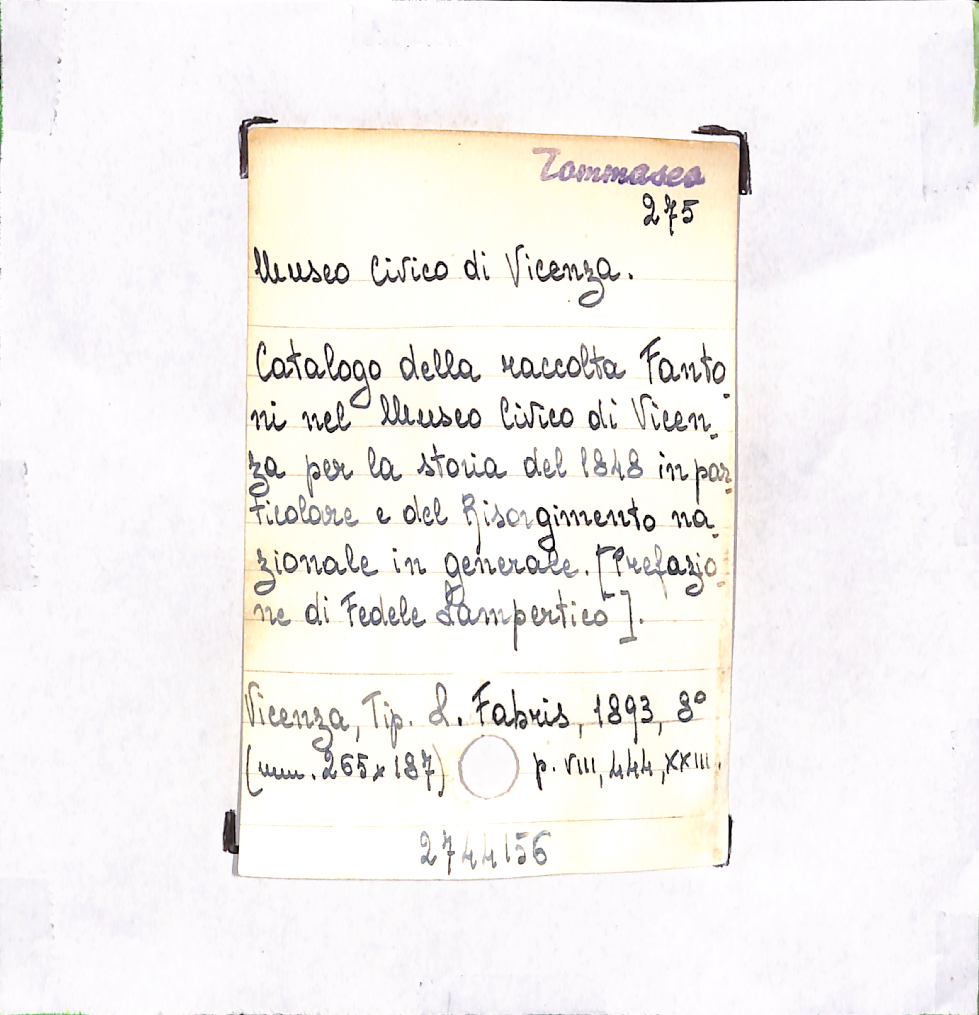 U.D. monografia Catalogo della raccolta Fantoni nel Museo civico di Vicenza per la storia del 1848 in particolare e del Risorgimento nazionale in generale