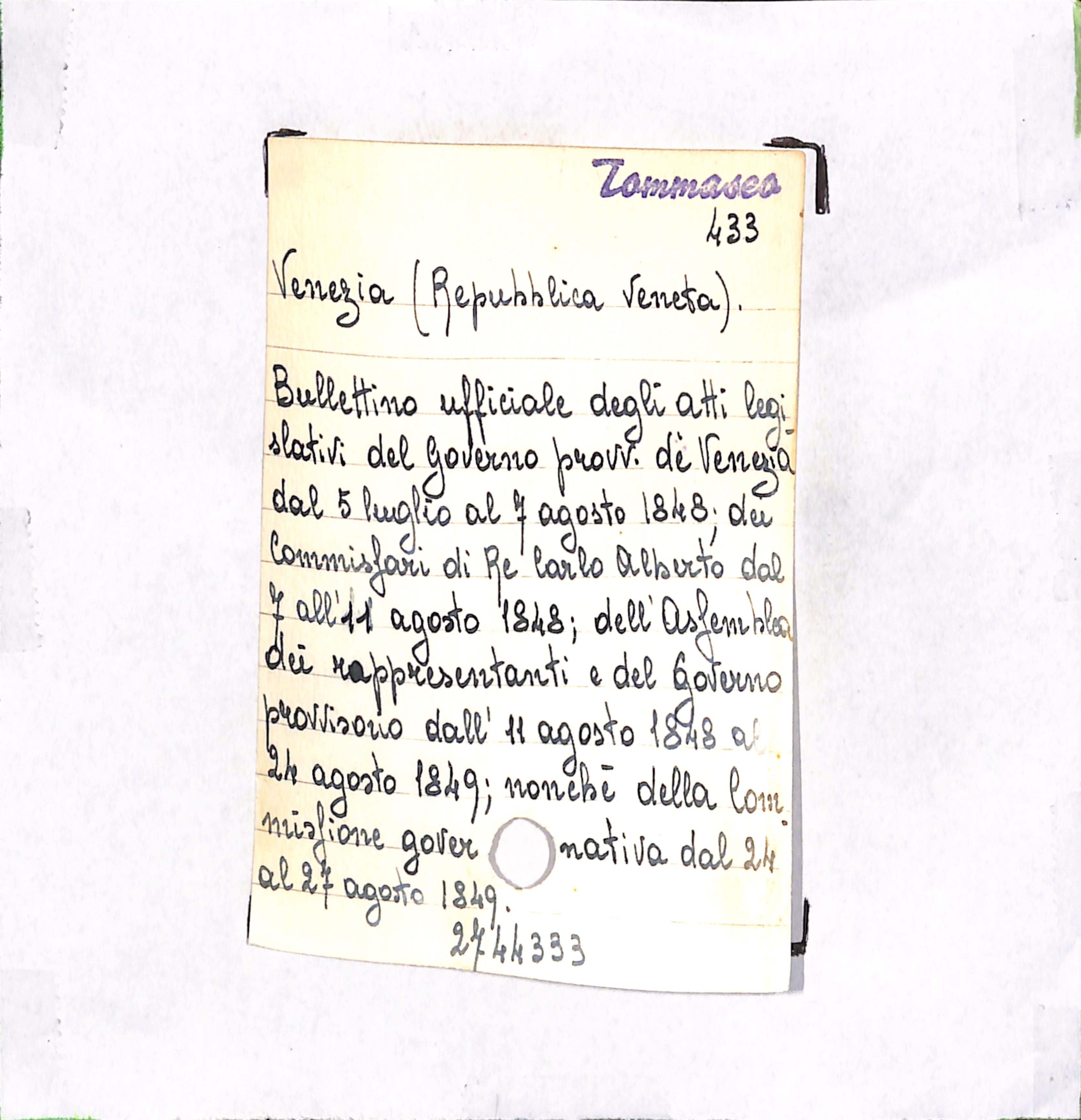 U.D. monografia Bullettino ufficiale degli atti legislativi del Governo provv.di Venezia dal 5 luglio al 7 agosto 1848; dei commissari di Re Carlo Alberto dal 7 all'11 agosto 1848; dell'Assemblea dei rappresentanti e del Governo provvisorio dall'11 agosto 1848 a 24 agost