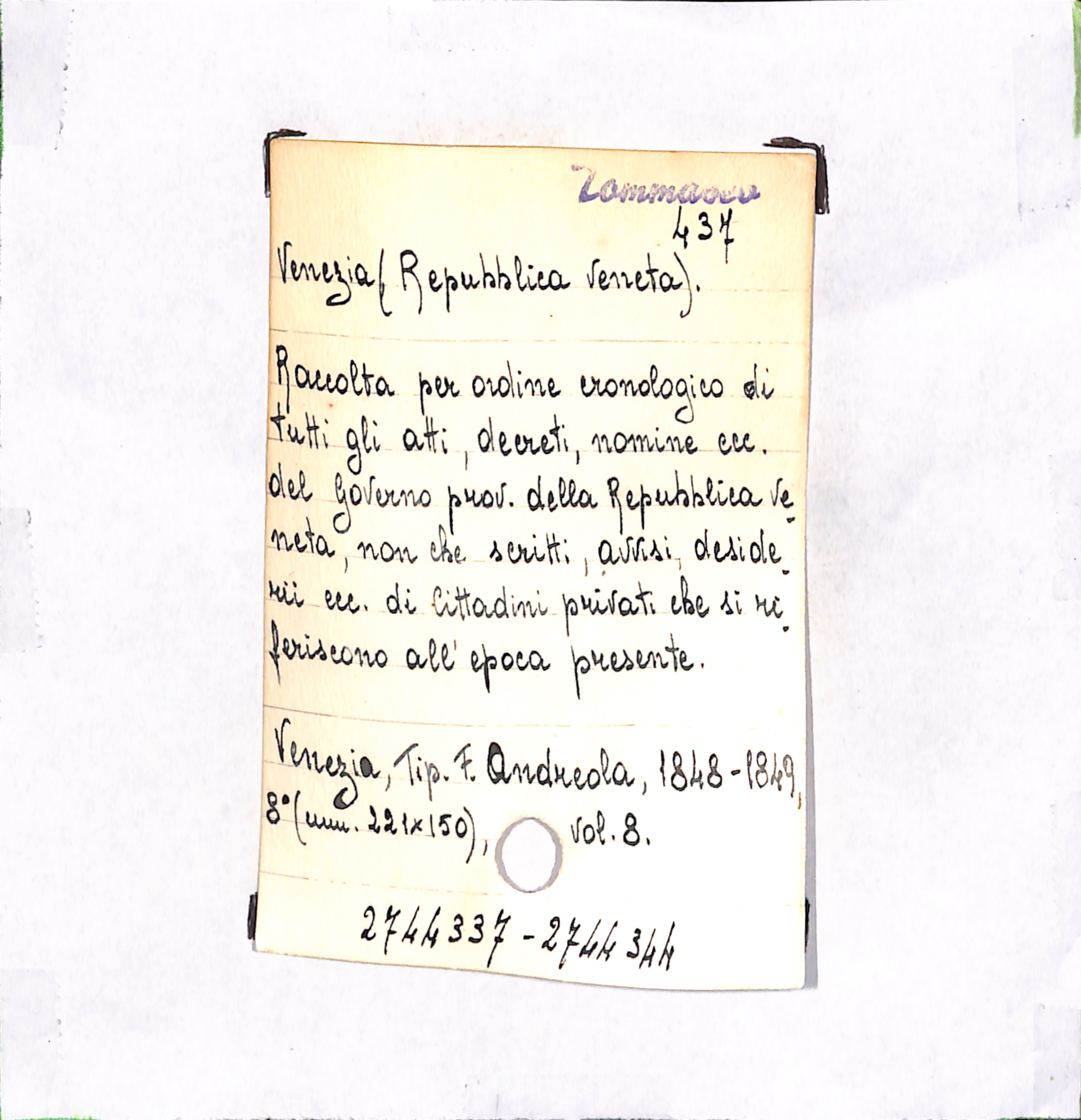 U.D. monografia Raccolta per ordine cronologico di tutti gli atti, decreti, nomine ecc. del Governo prov. della Repubblica veneta, non che scritti, avvisi, desiderii ecc. di cittadini privati che si riferiscono all'epoca presente