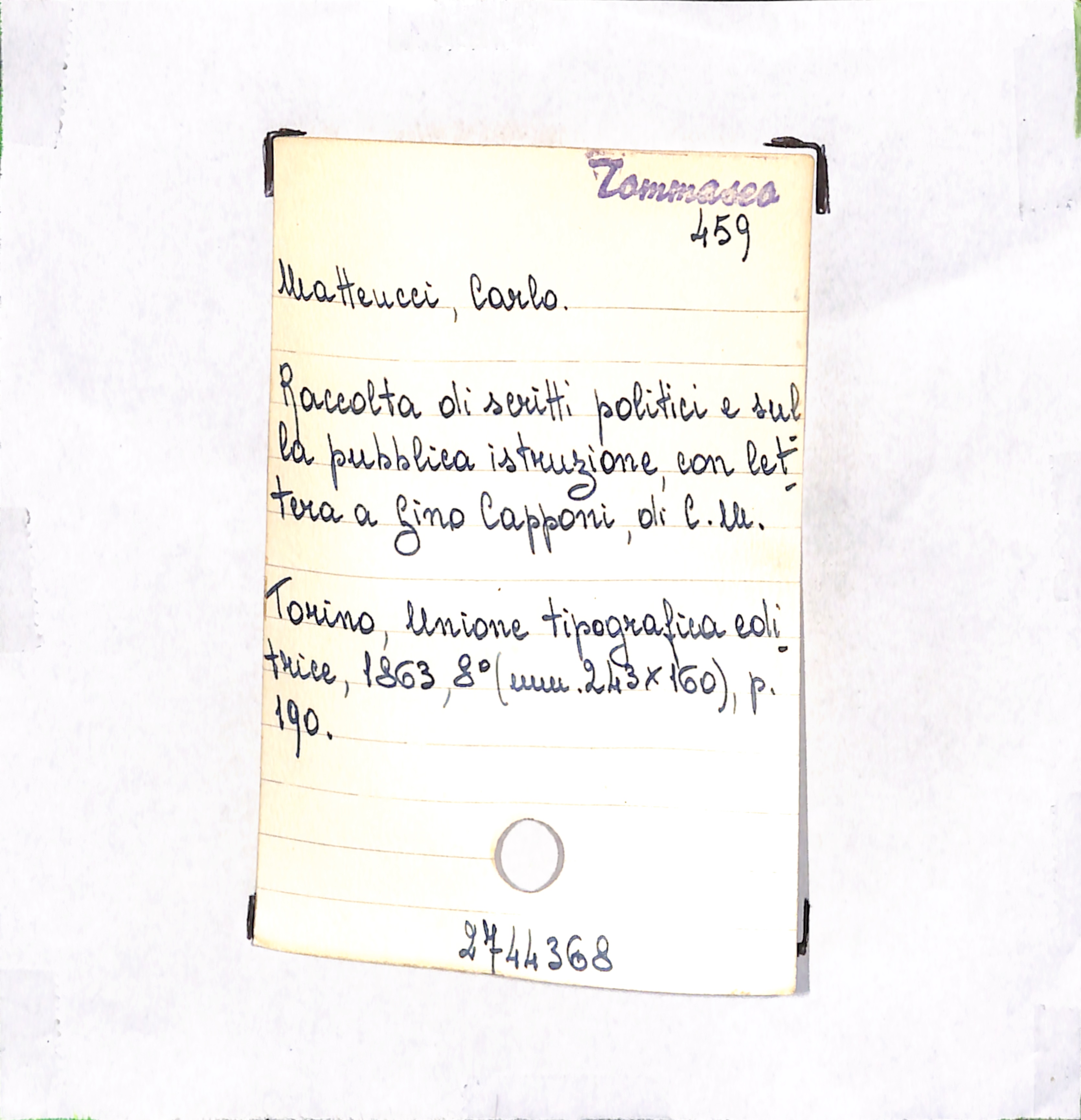 U.D. monografia Raccolta di scritti politici e sulla pubblica istruzione, con lettera a Gino Capponi, di C. M.